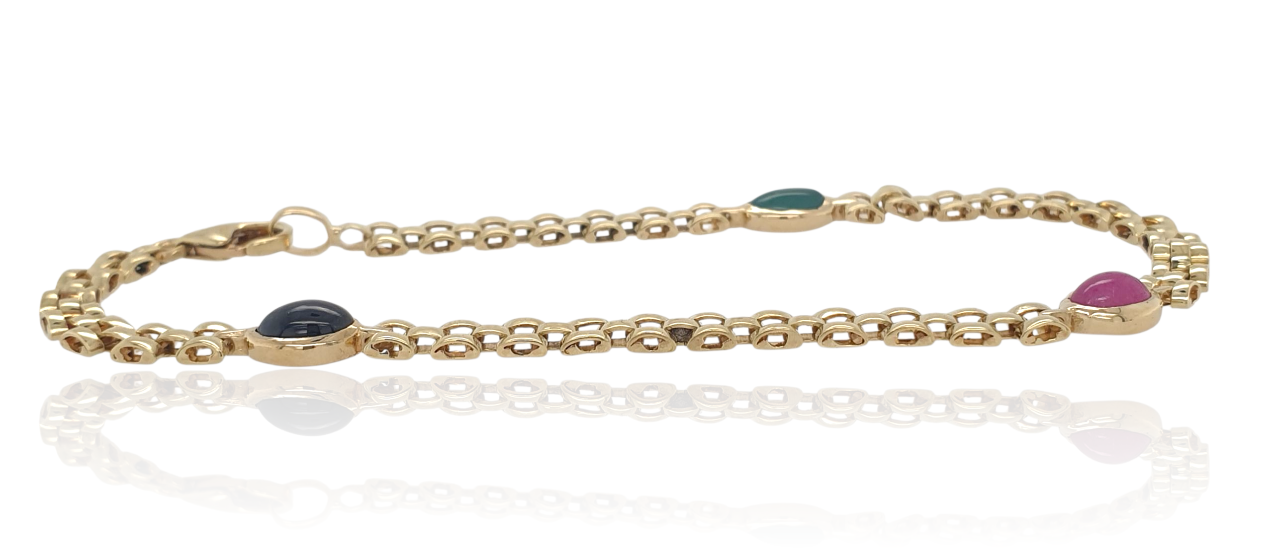 14 karaat gouden armband met saffier, smaragd en robijn, vintage occasion.# 28966