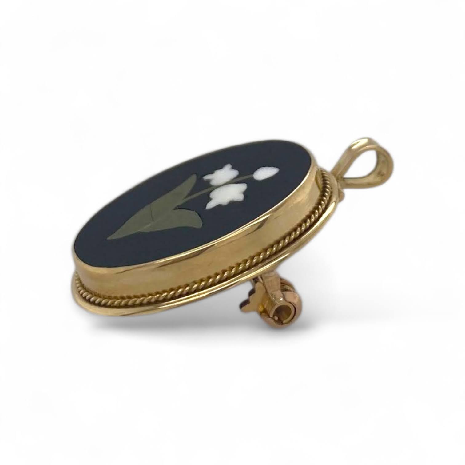 Gouden broche met onyx en ingelegd bloemmotief – 14 karaat – Vintage Occasion # 29263