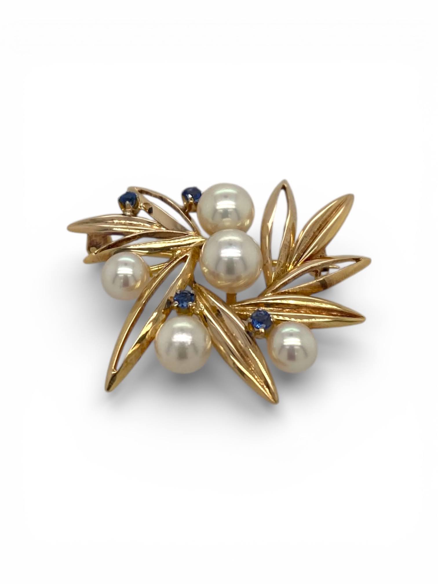 14 karaat geelgouden broche, bezet met parels en saffier. Vintage Occasion # 29183