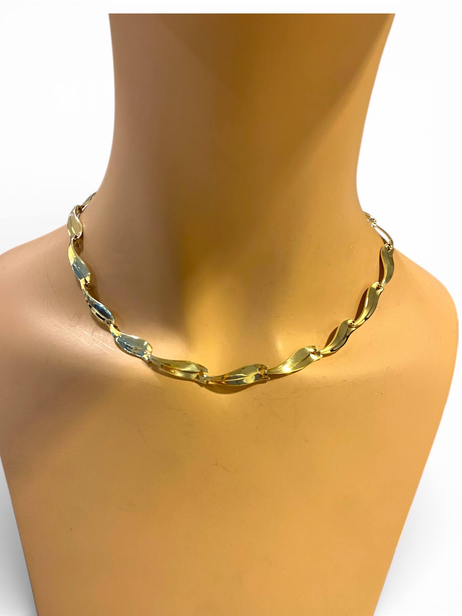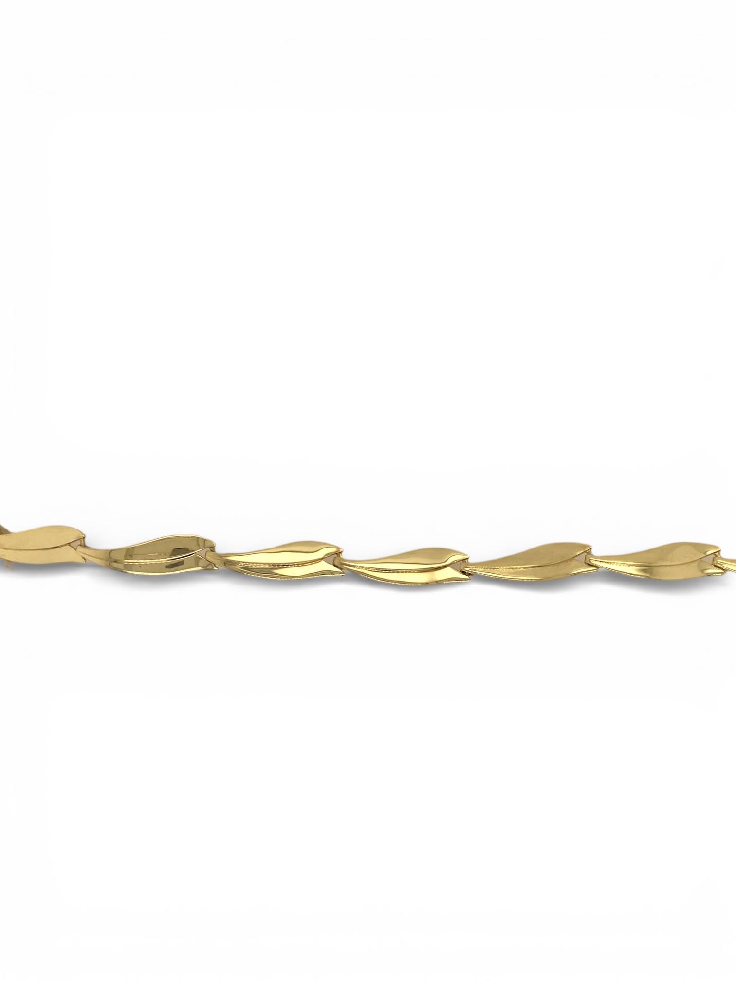 Dit zeer fraaie collier van 14 karaat geelgoud doet denken aan de zachte vormen van tulpenbladeren. De schakels zijn massieve plaatjes die prachtig spiegelen met het licht, waardoor het collier een elegante en luxueuze uitstraling krijgt.