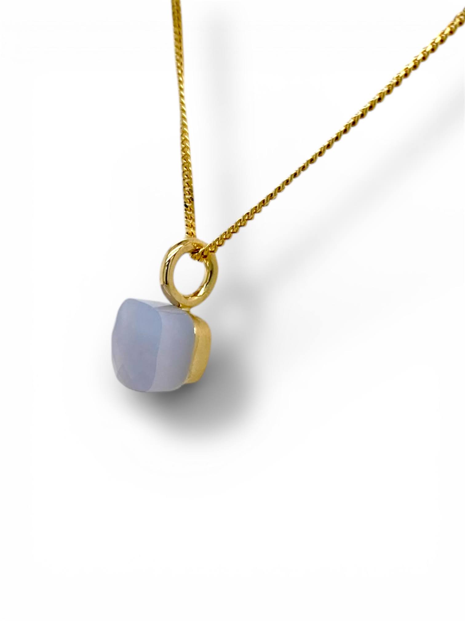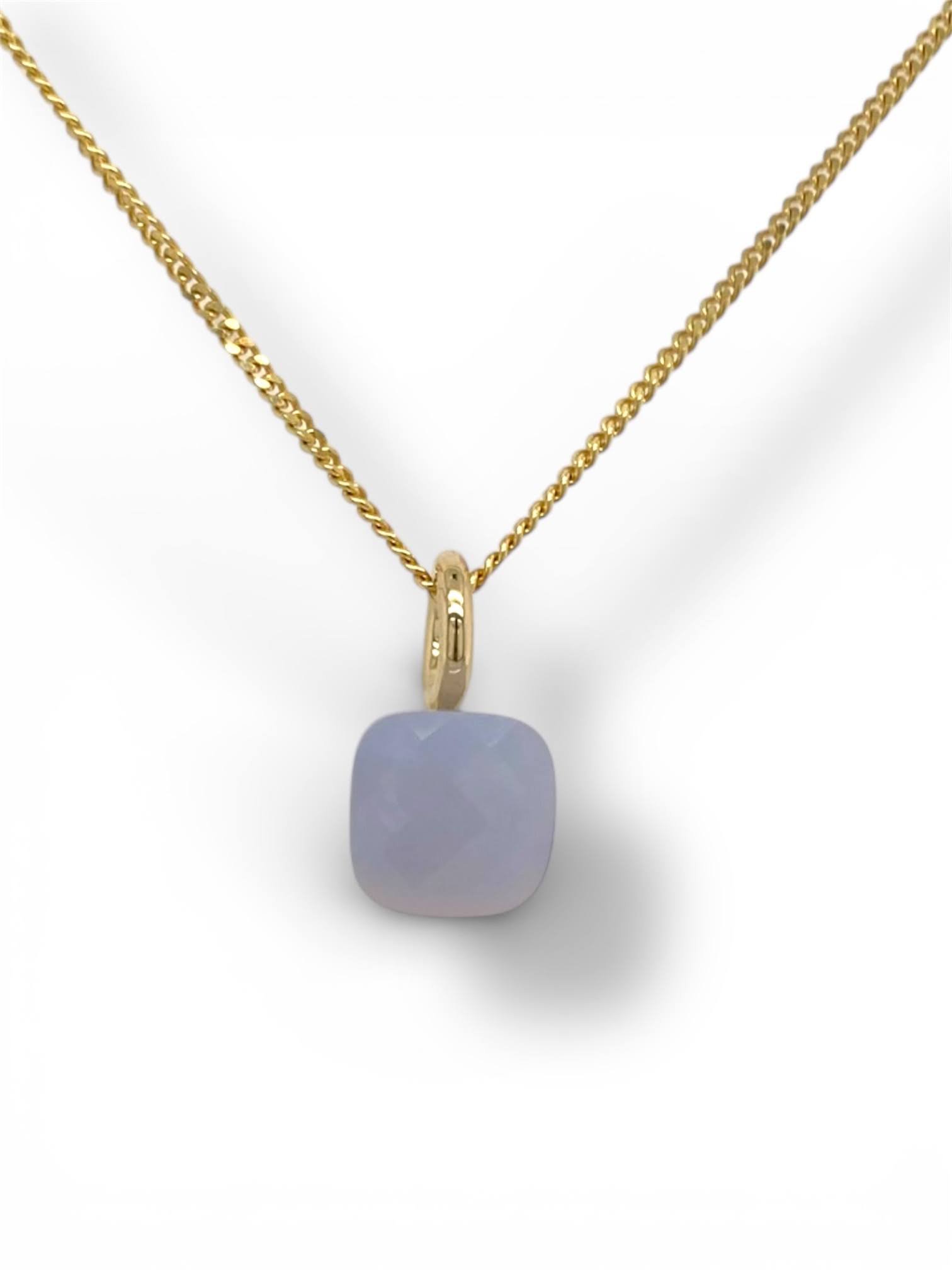 Deze charmante hanger van 14 karaat geelgoud is gezet met een lichte mauve chalcedoon, prachtig facetgeslepen voor een subtiele glans. Het ontwerp doet denken aan de verfijnde stijl van het Italiaanse huis Pomellato, elegant en vrouwelijk.
