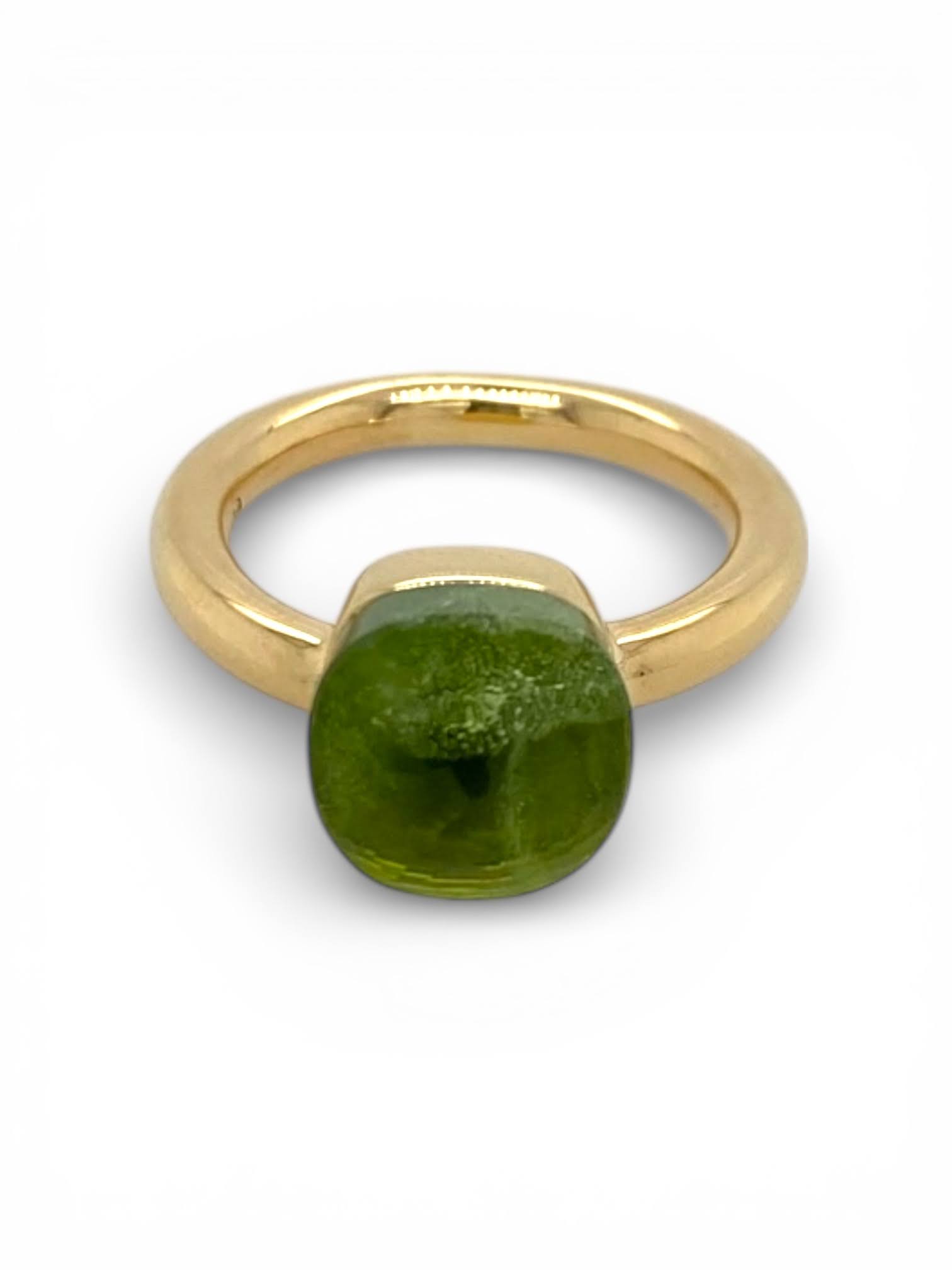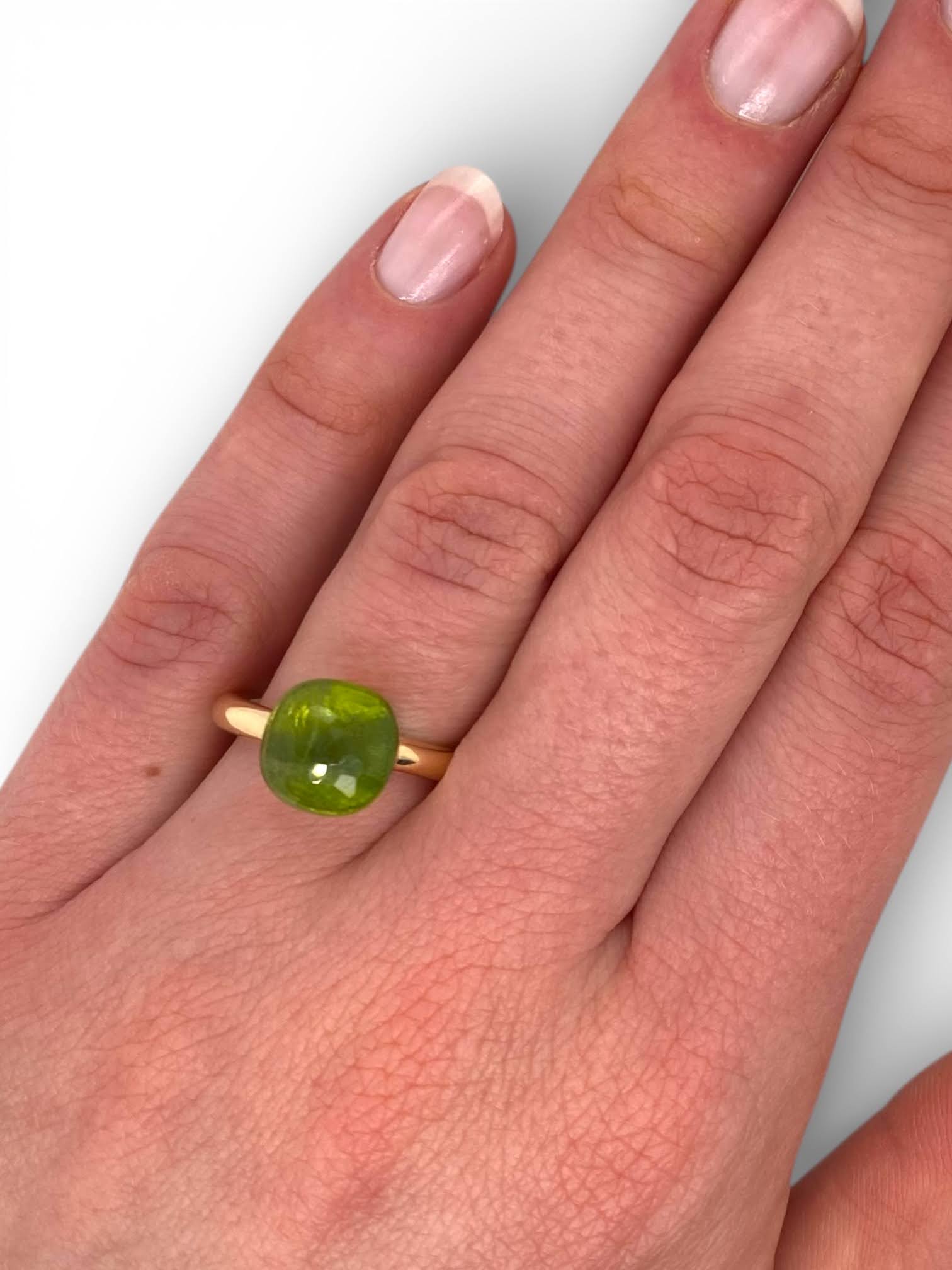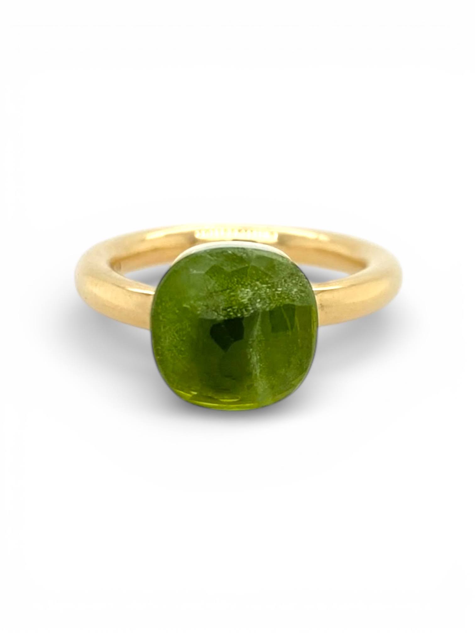 14 karaat geelgouden ring met een prachtige peridot, geslepen en gezet in de kenmerkende Pomellato-stijl. De zetting plaatst de steen letterlijk op de voorgrond, waardoor de frisse groene kleur volop tot zijn recht komt. Handgemaakt in eigen atelier.