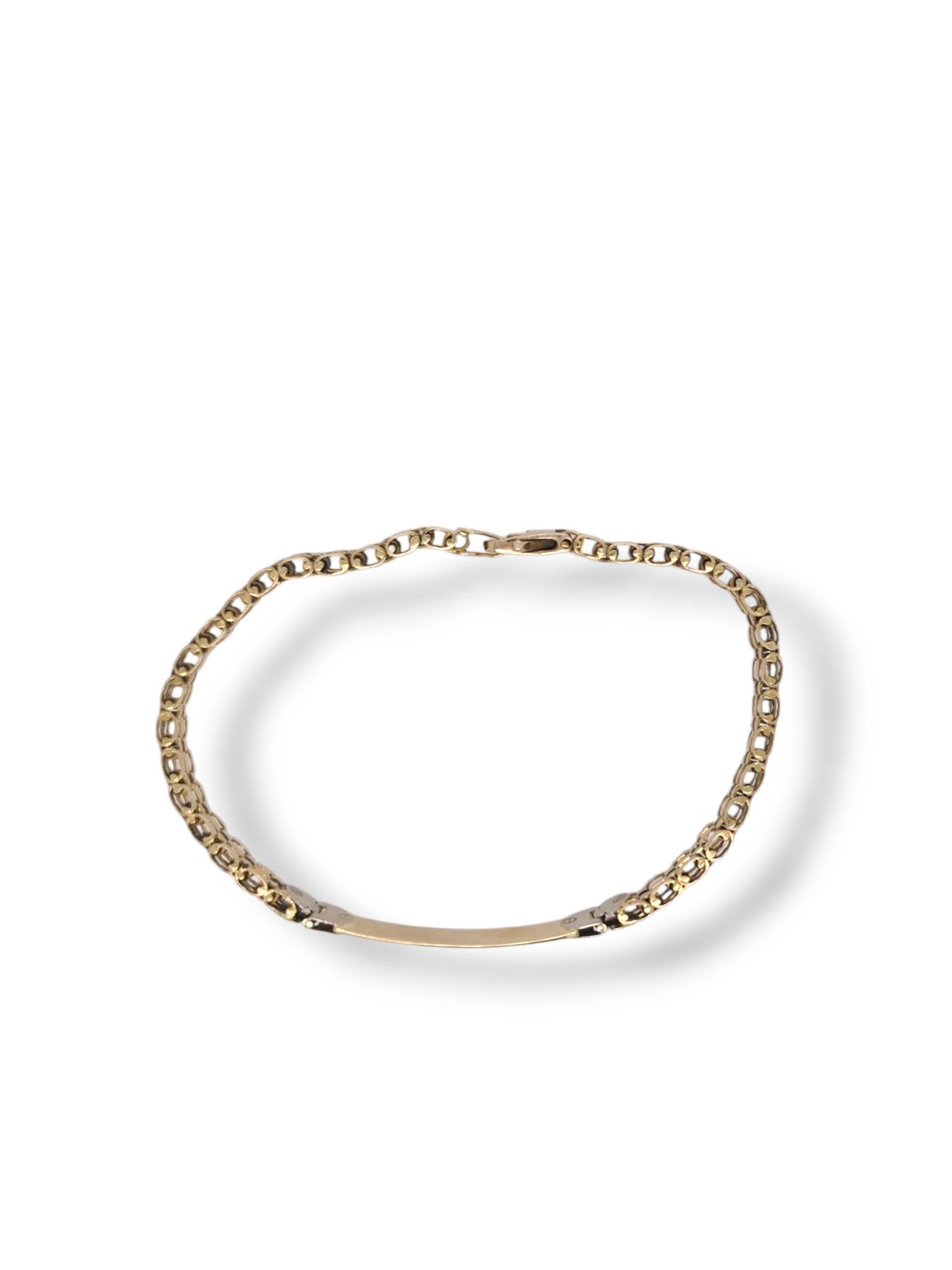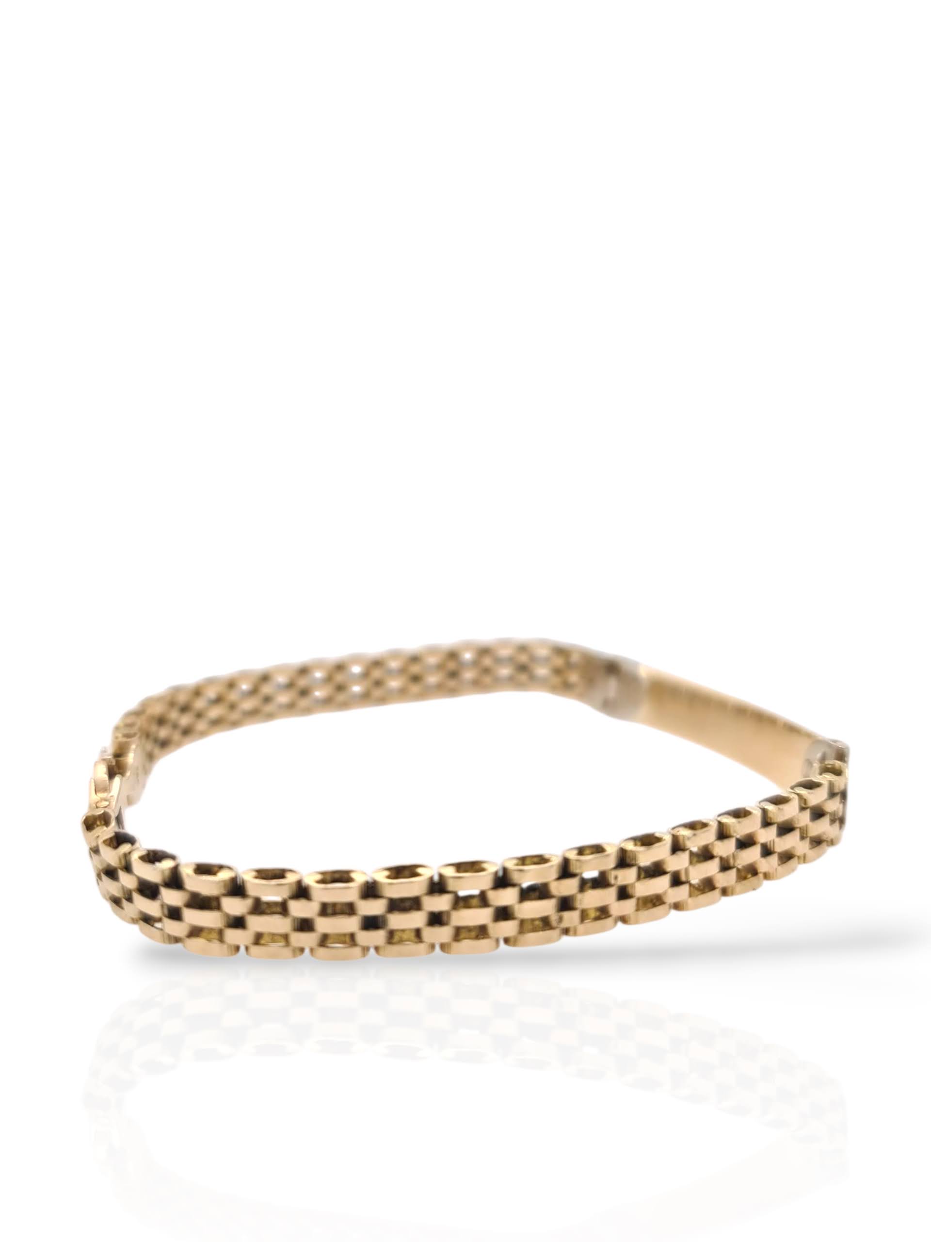 14 karaats geelgouden armband met Rolexschakel. Stijlvolle vintage armband uitgevoerd in 14 karaats geelgoud met een brede, soepele Rolexschakel. De armband is voorzien van een graveerplaatje, ideaal voor een persoonlijke inscriptie.