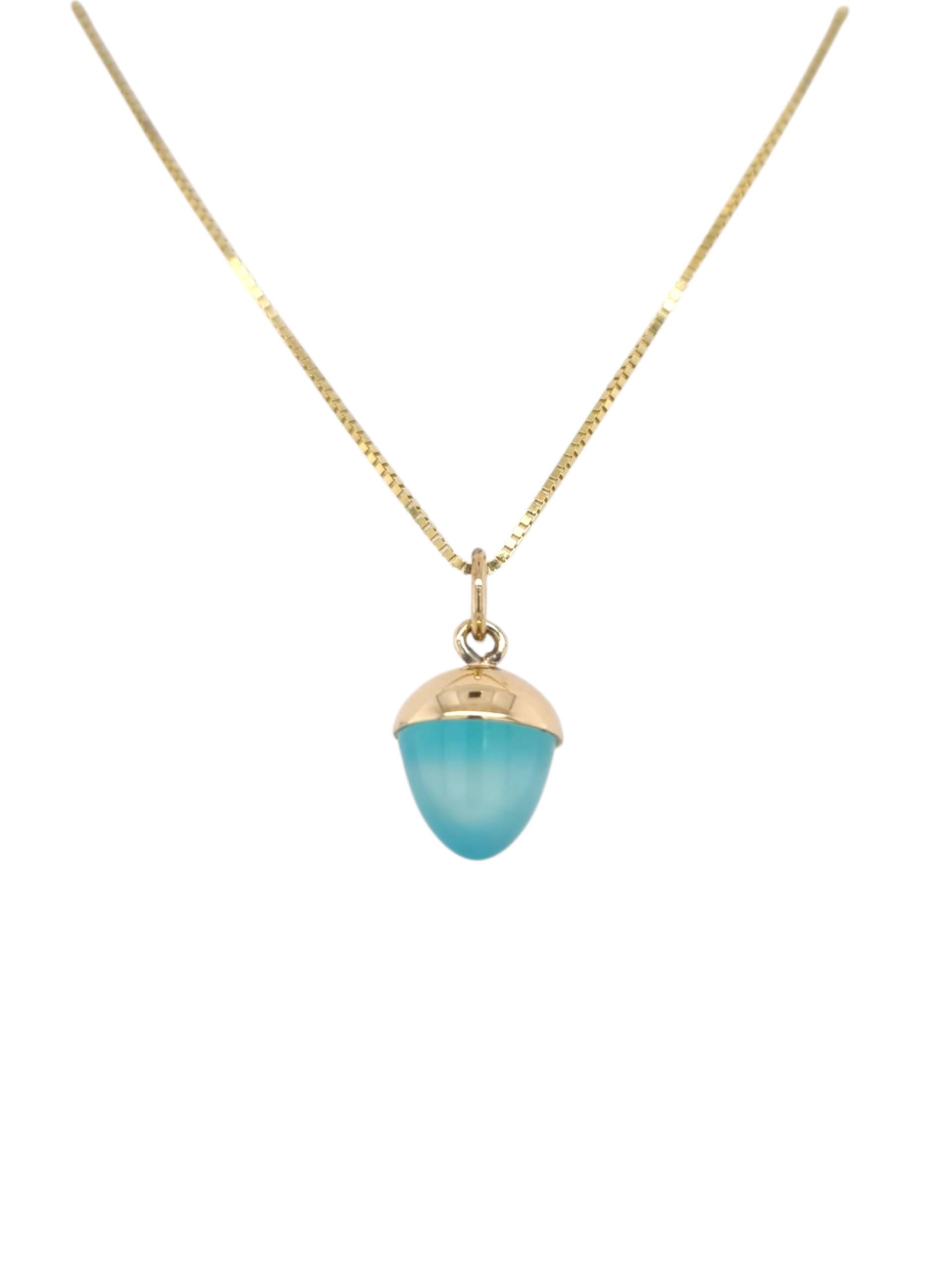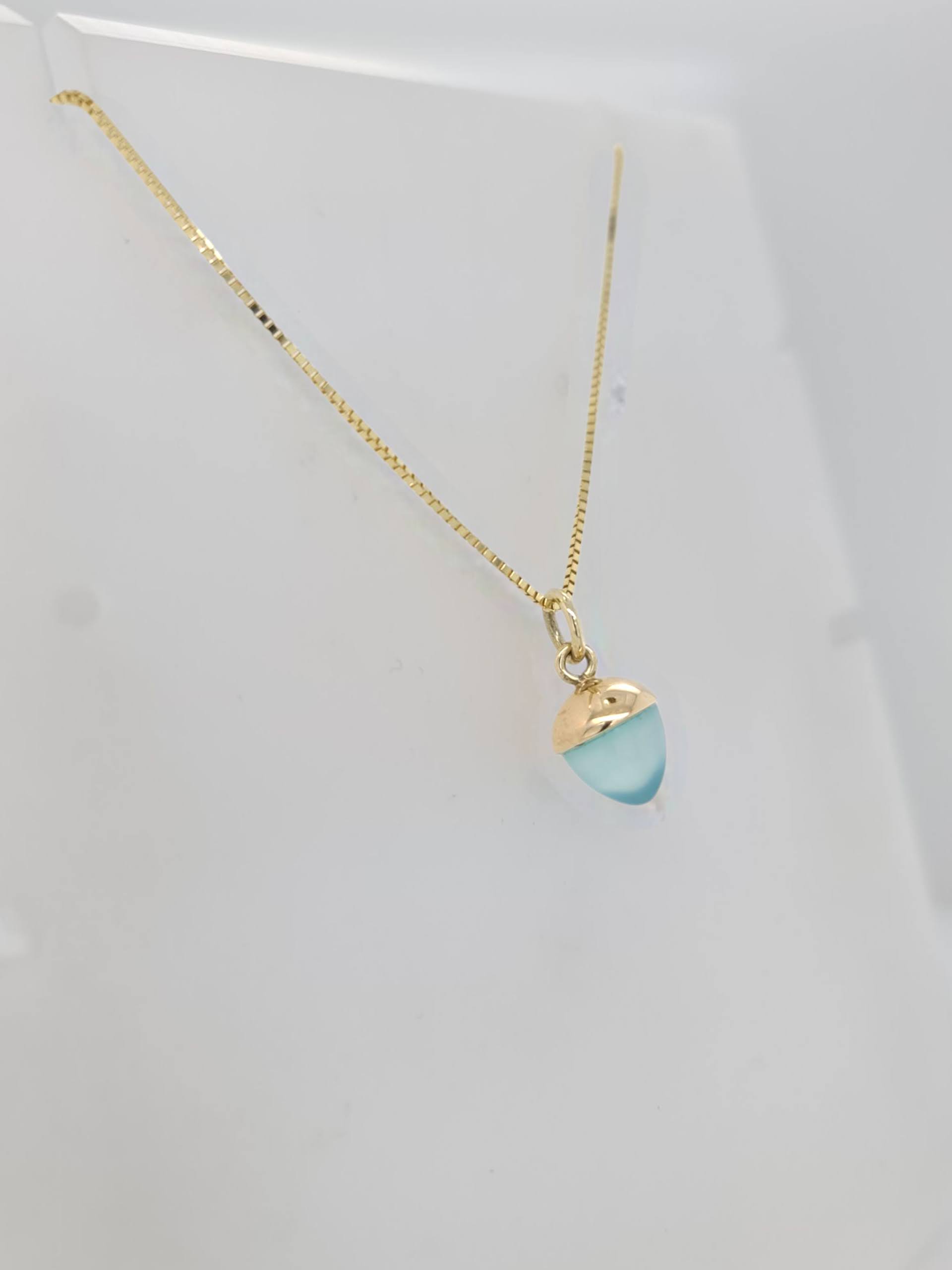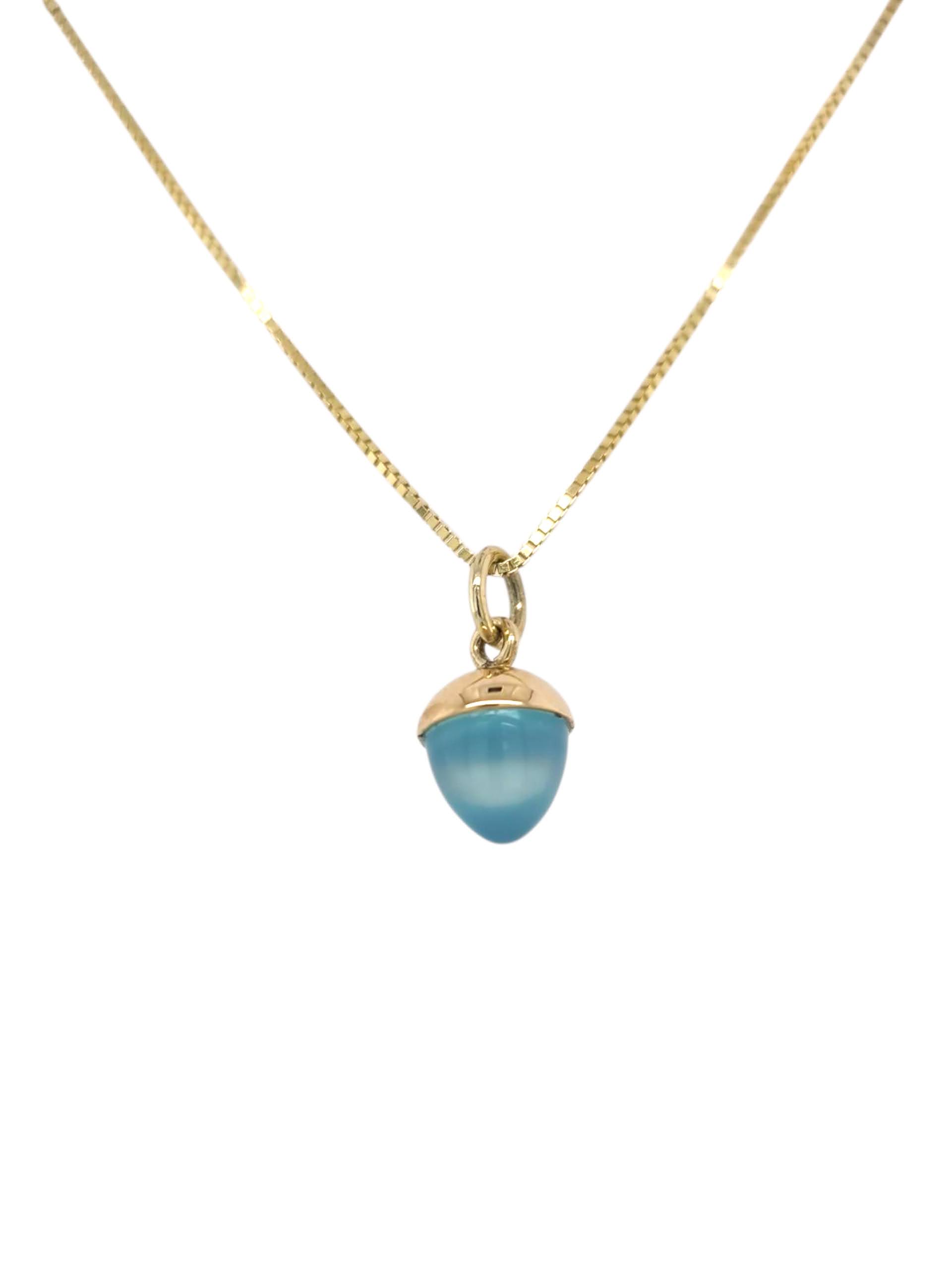Schattige gouden hanger van 14 karaats geelgoud met een ingeslepen hemelsblauwe chalcedoon. Een hemels hangertje dat prachtig om elke hals hangt.