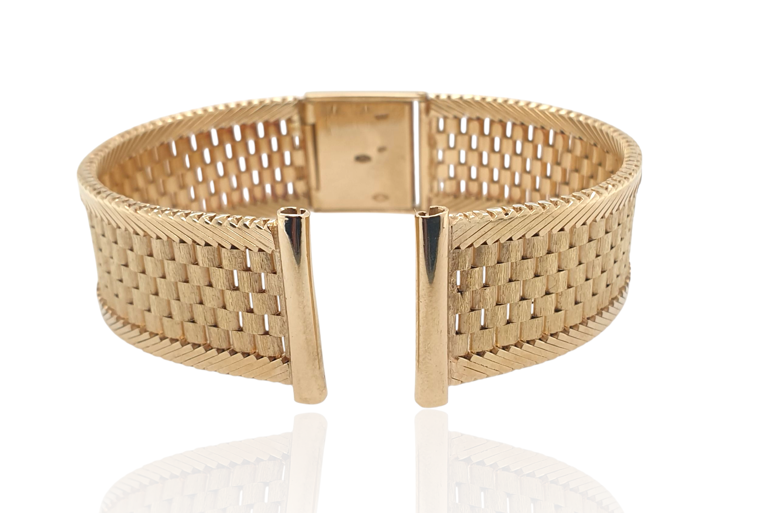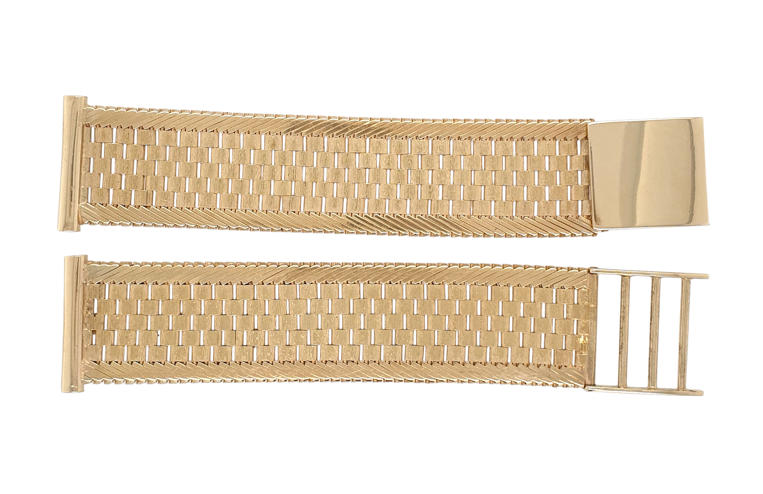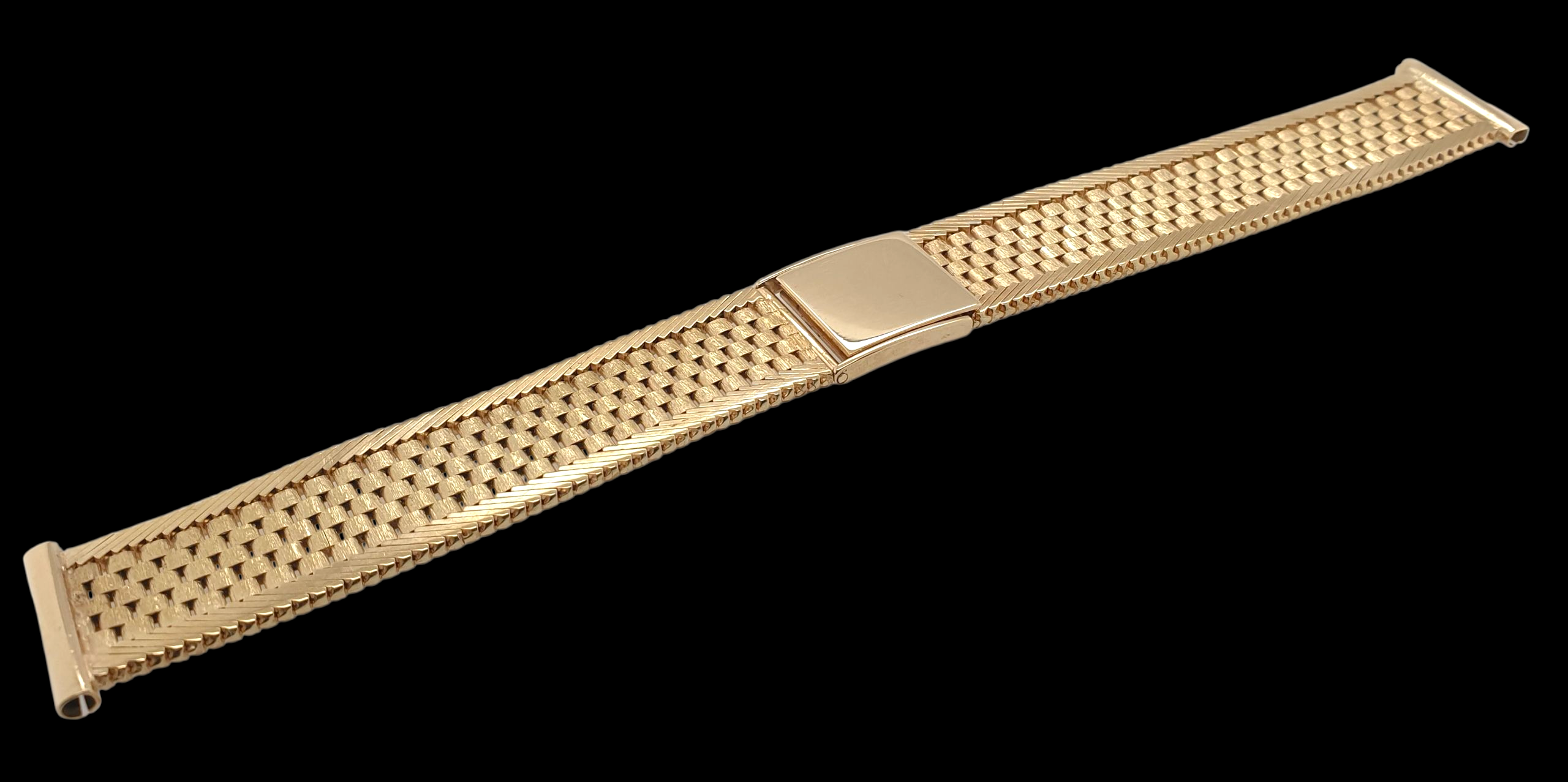 Zeer fraaie 14 karaat gouden horlogeband met klepsluiting. Kan op 3 standen vastgemaakt worden. Het is een occasion maar lijkt wel ongebruikt. 18 mm horlogemaat , 15.5 cm lang. Eventueel in te korten of langere bussen aan te zetten. Bestelnummer 28965