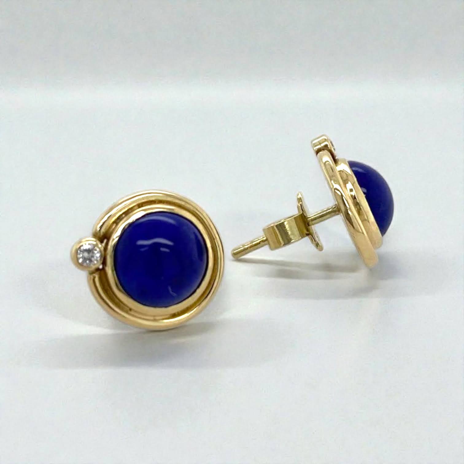 Deze elegante oorknoppen van 14 karaat geelgoud zijn bezet met diepblauwe lapis lazuli en een fonkelende diamant. Klassieke en tijdloos, een verfijnde toevoeging aan iedere sieradencollectie.