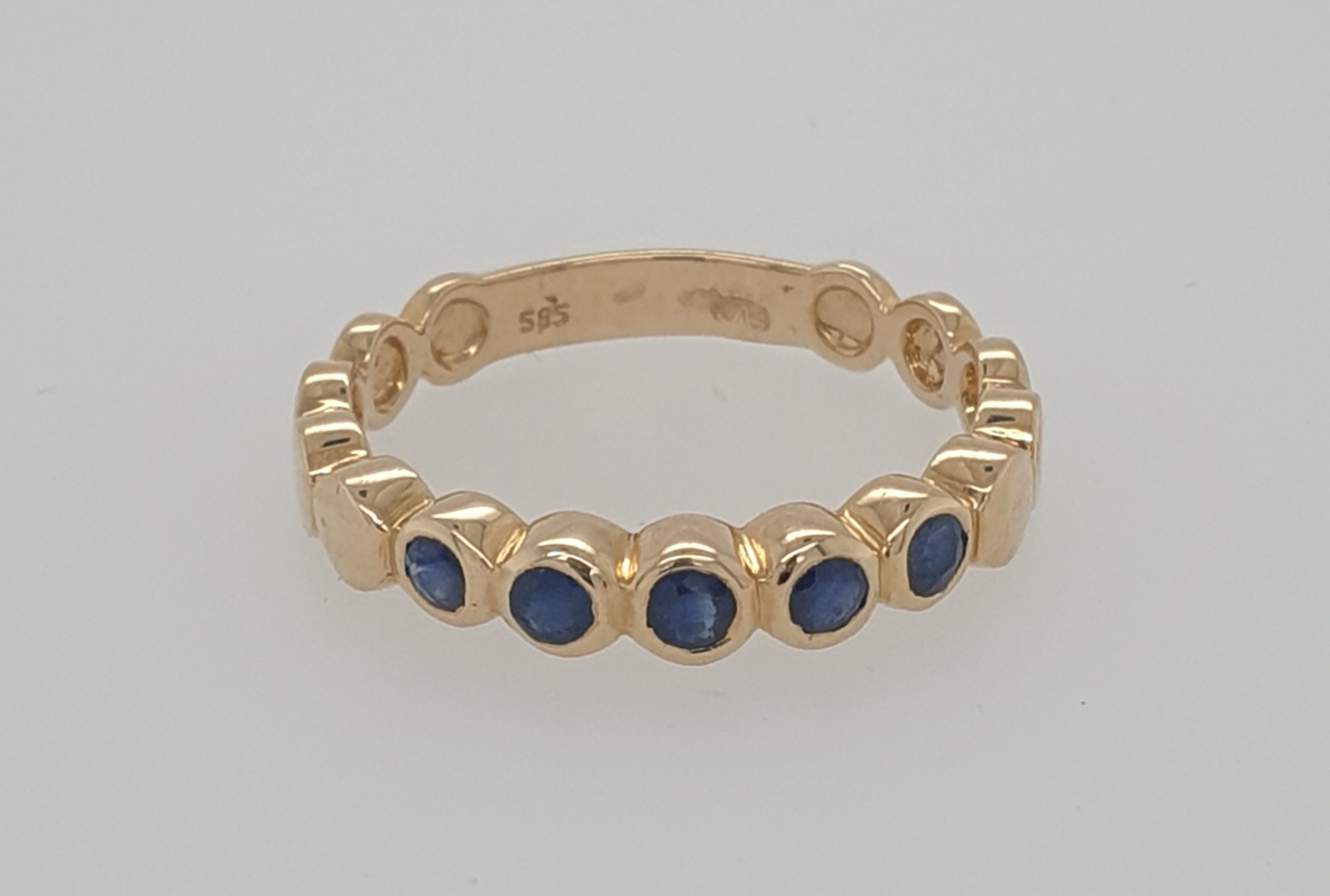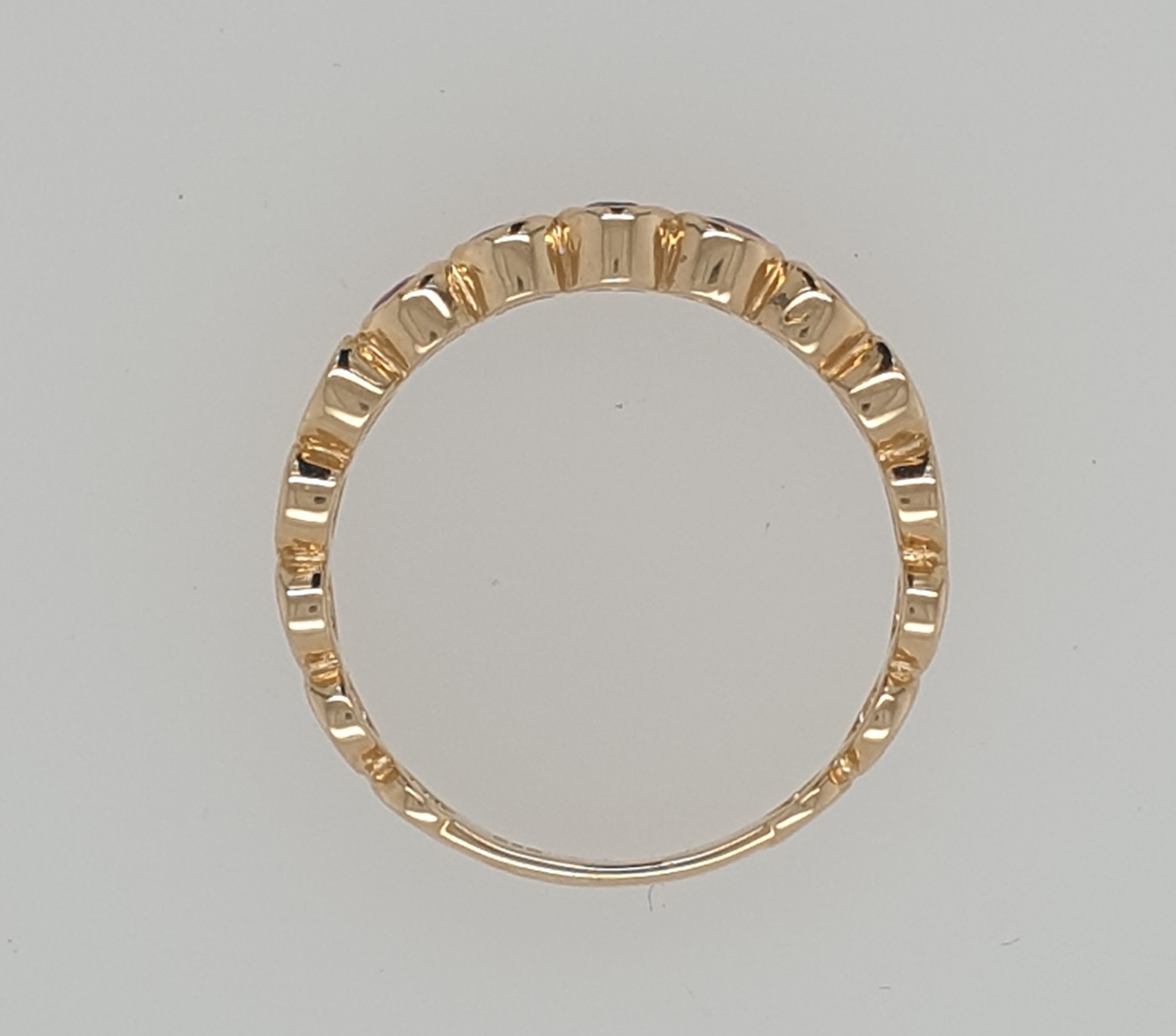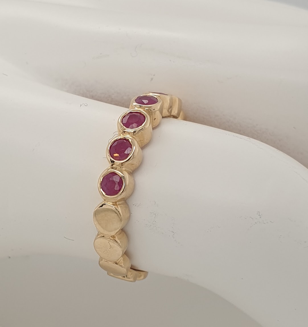 Een hele mooie 14 karaat gouden ring met 5 heldere robijnen van 3 mm op rij. Maat 17,5 maar kan makkelijk op uw maat gemaakt worden in eigen atelier. Ook mooi te combineren met eenzelfde ring met smaragd of saffier of beiden. Bestelnummer 28646.
