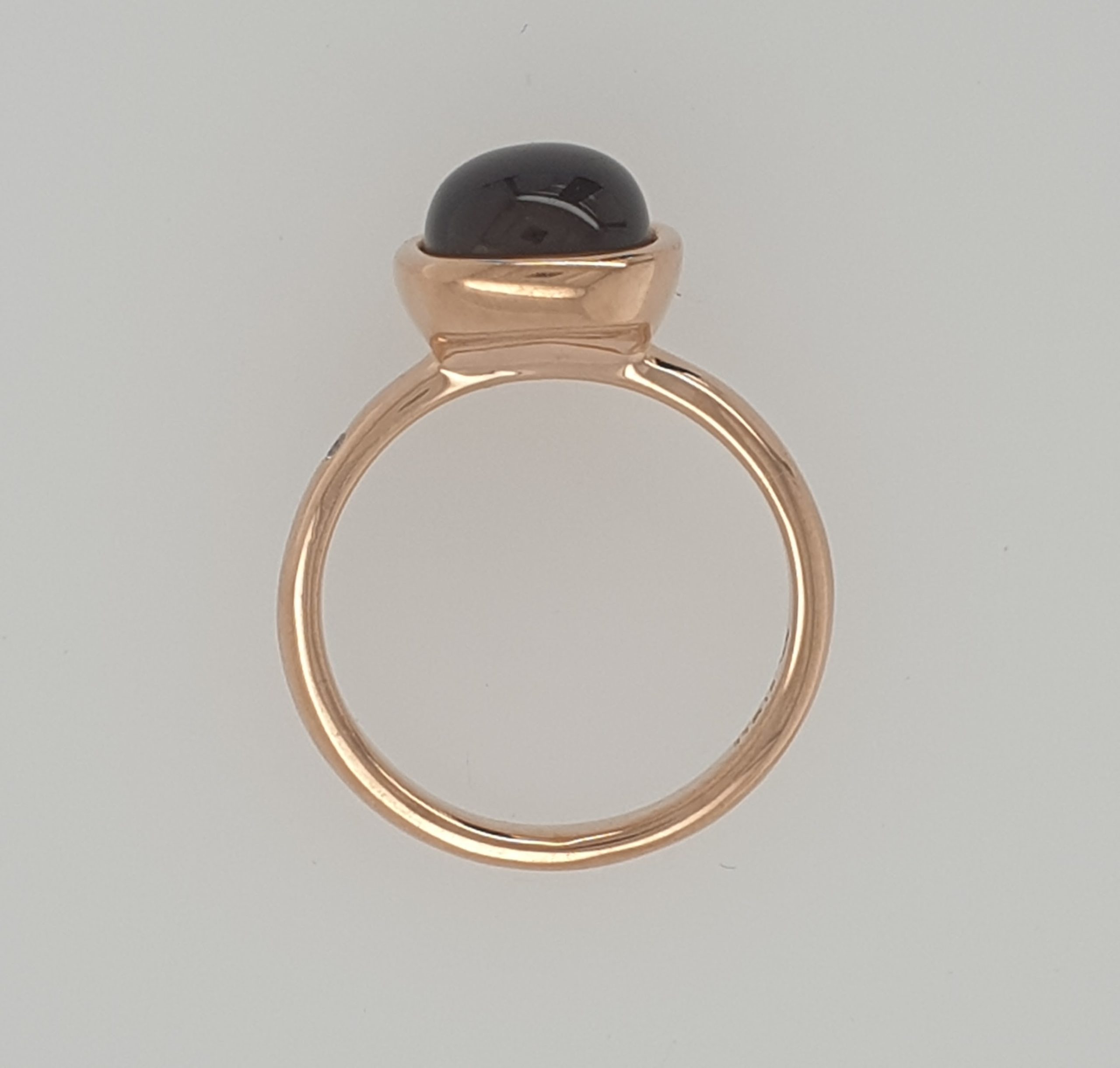 Een eenvoudige maar zeer fraaie 14 karaat occasion roségouden ring met een cabochon geslepen rookkwarts. Tweede hands maar lijkt wel nieuw. Bestelnummer 28887