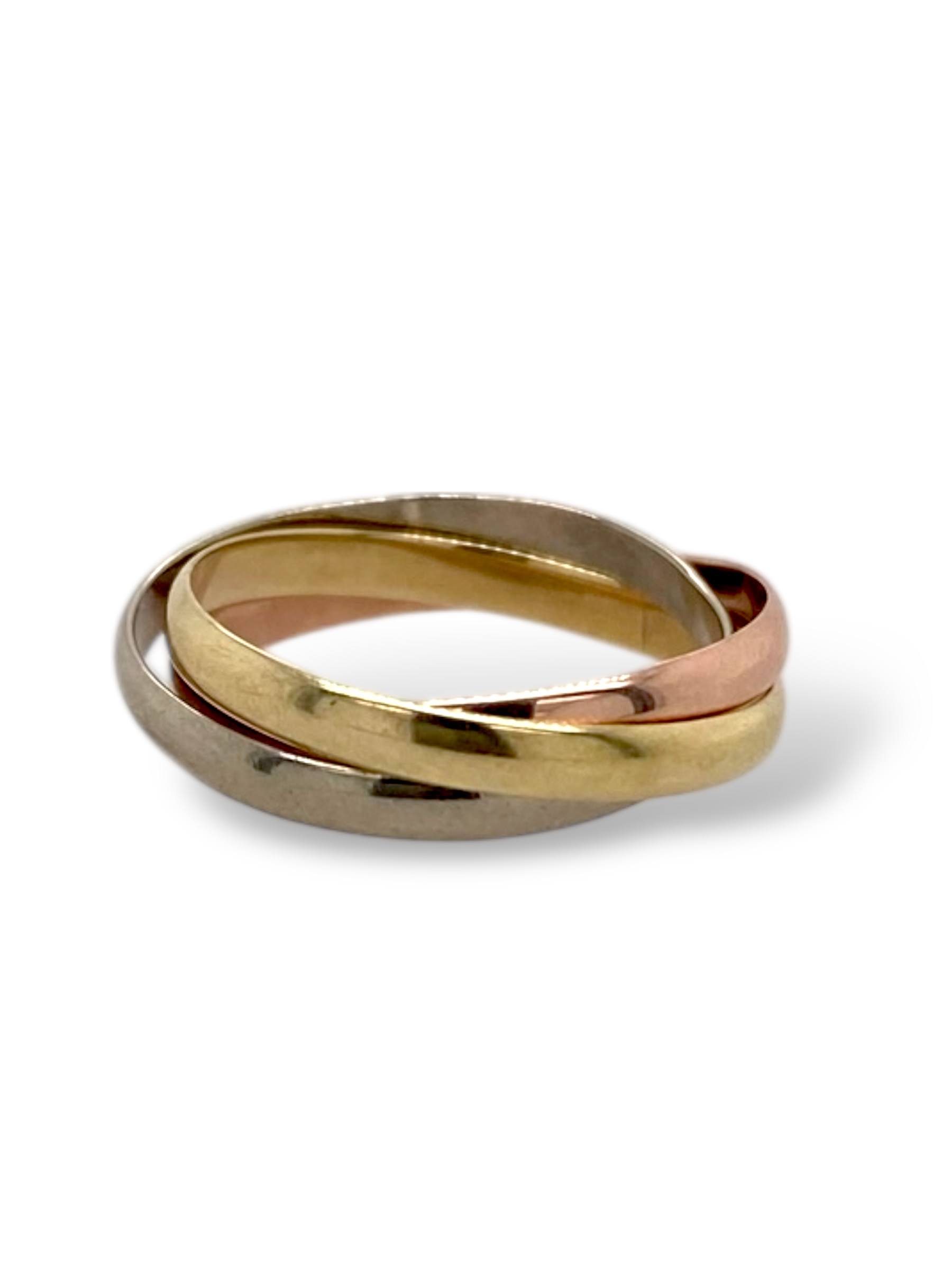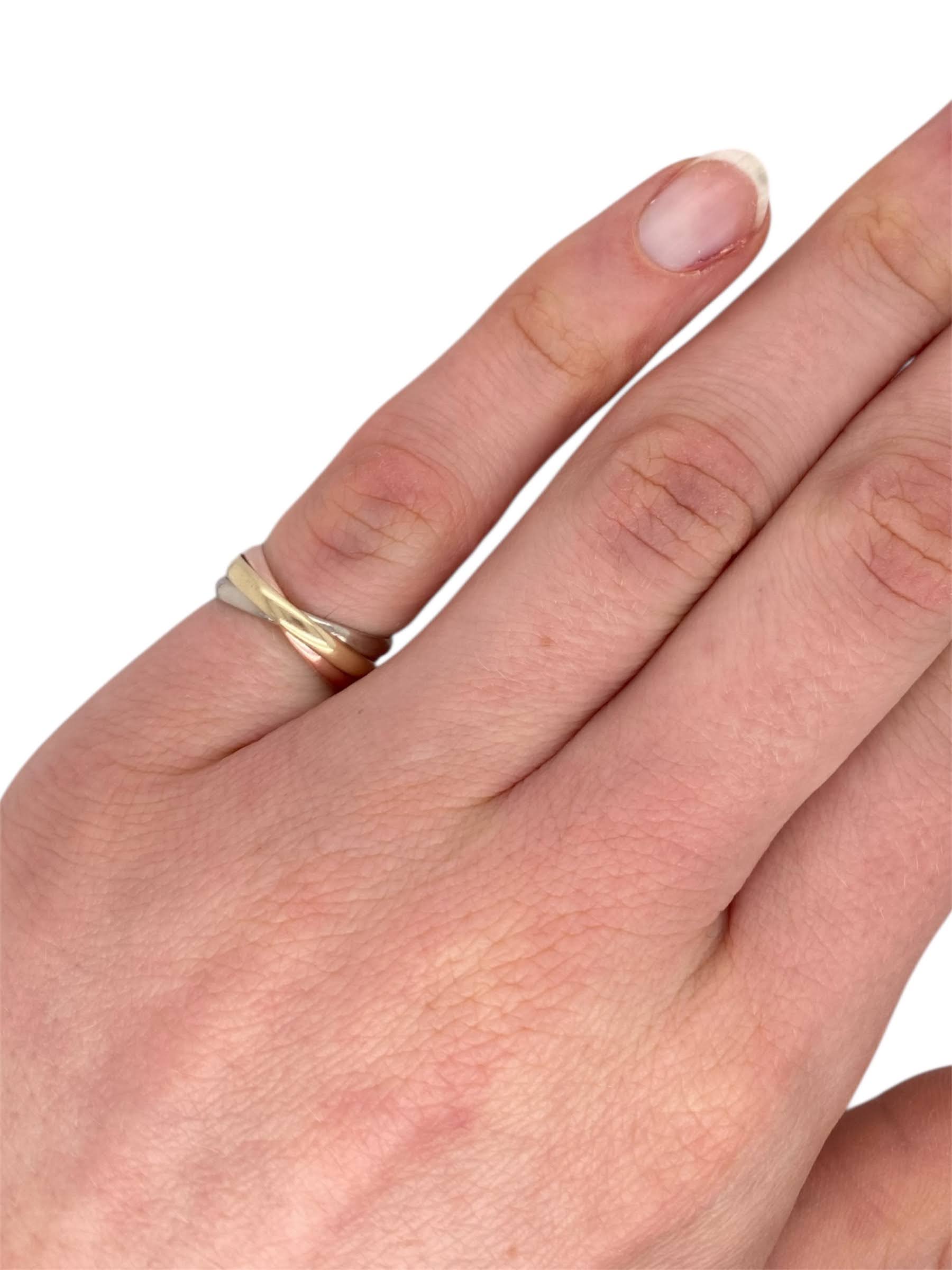 Wat een charmant ringetje. Deze pinkring van 14 karaat goud, bestaat uit drie in elkaar geregen banden van geel-, wit- en roségoud die samen een mooie drie-eenheid vormen. Een fijne en toch opvallende ring.