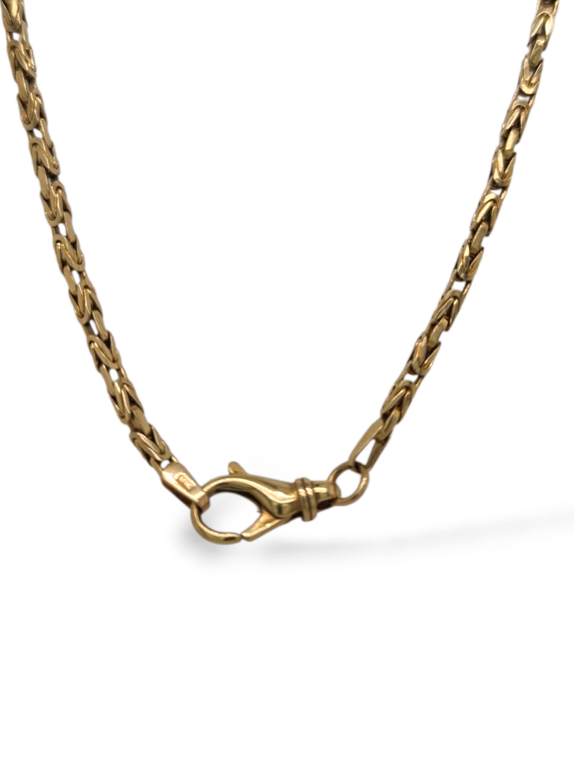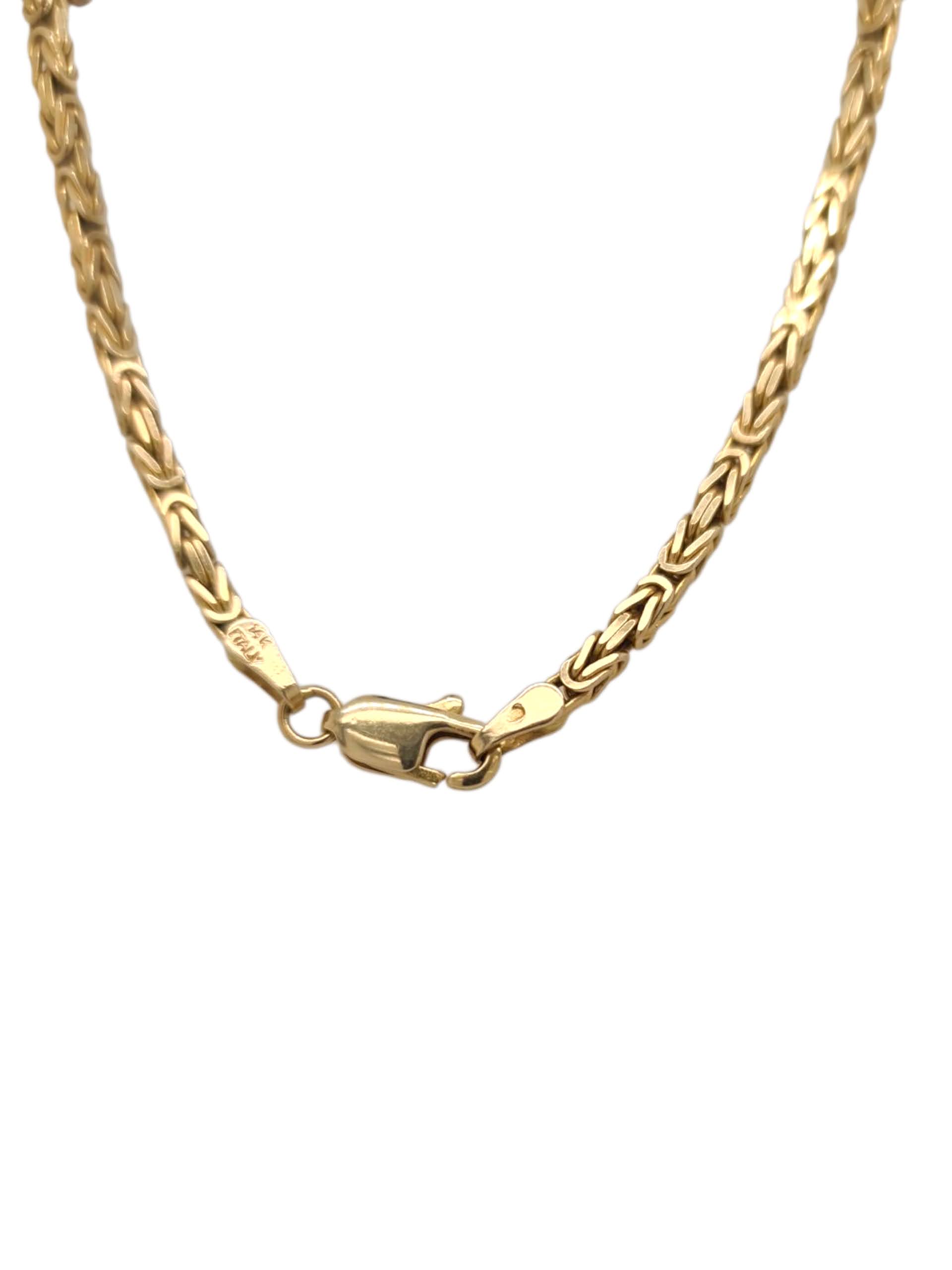 Mooie lange koningscollier van 14 karaats geelgoud. Dit collier heeft een ruim gevlochten schakel waardoor hij soepel en elegant om de hals valt. Met zijn royale lengte is het een prachtig sieraad dat zich uitstekend leent om solo te dragen of te combineren in laagjes.