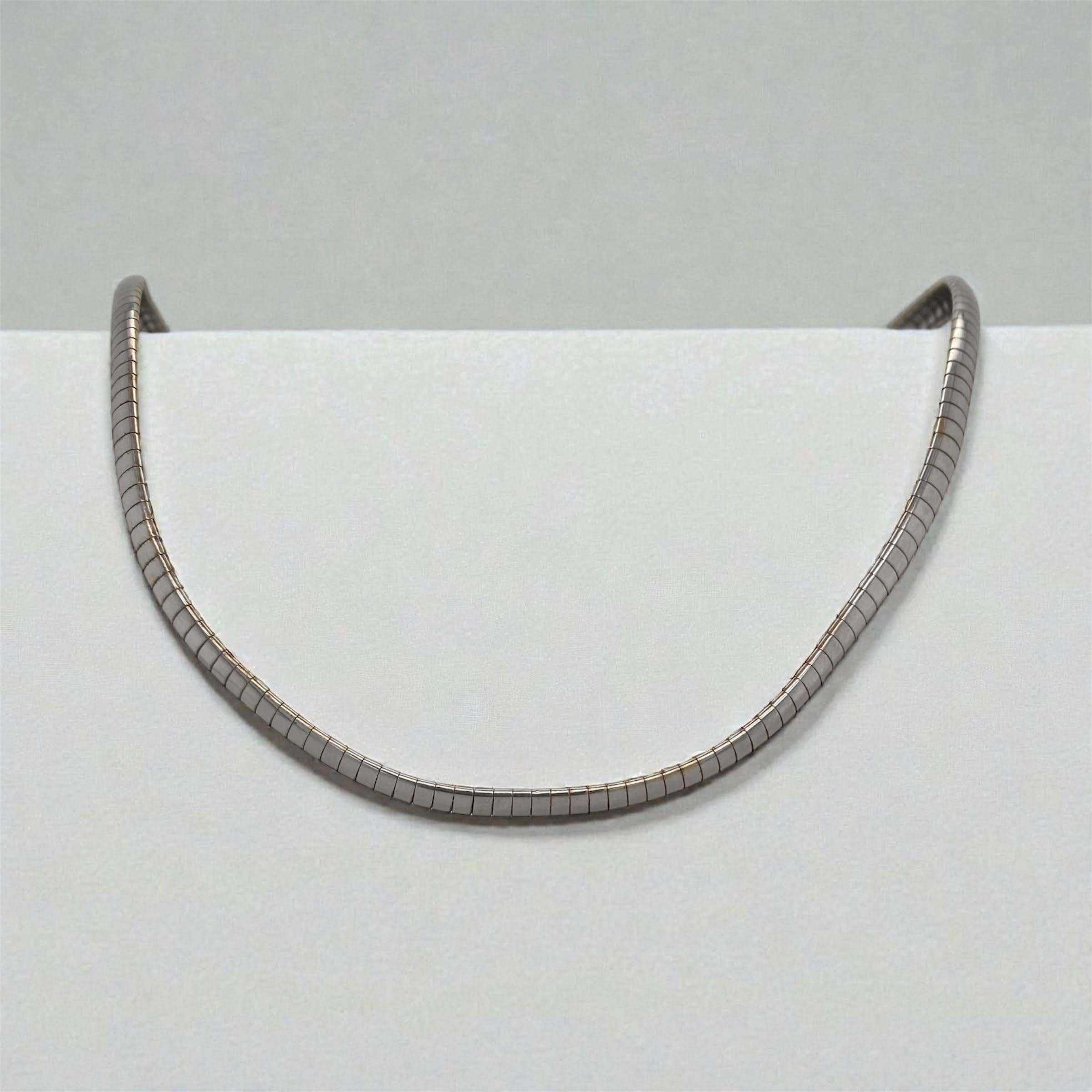 Dit prachtige Omega-collier van 14 karaat witgoud heeft een luxueuze, slangachtige schakel die altijd perfect rond de hals valt. Een stevig collier met tijdloos aanzien. Een klassieker die in iedere sieradencollectie thuishoort.