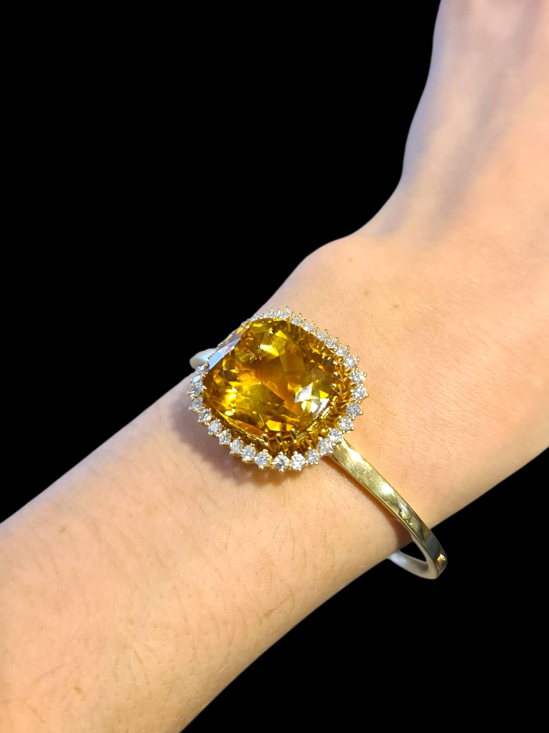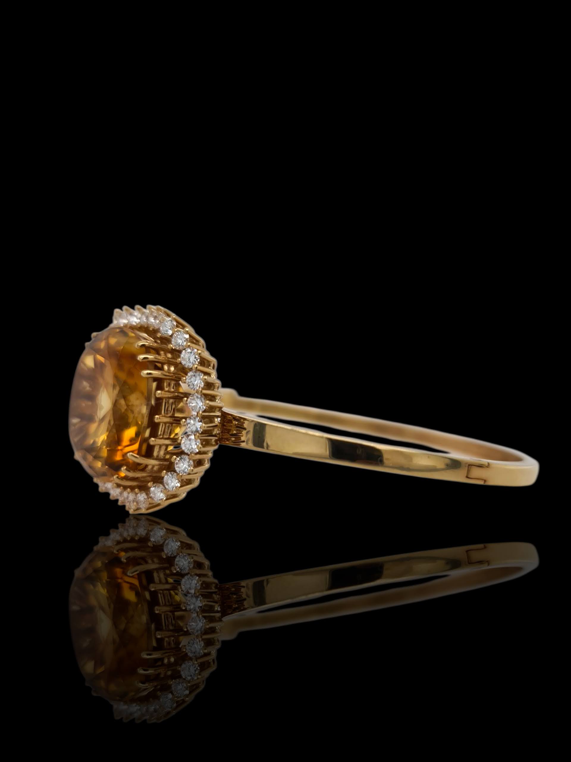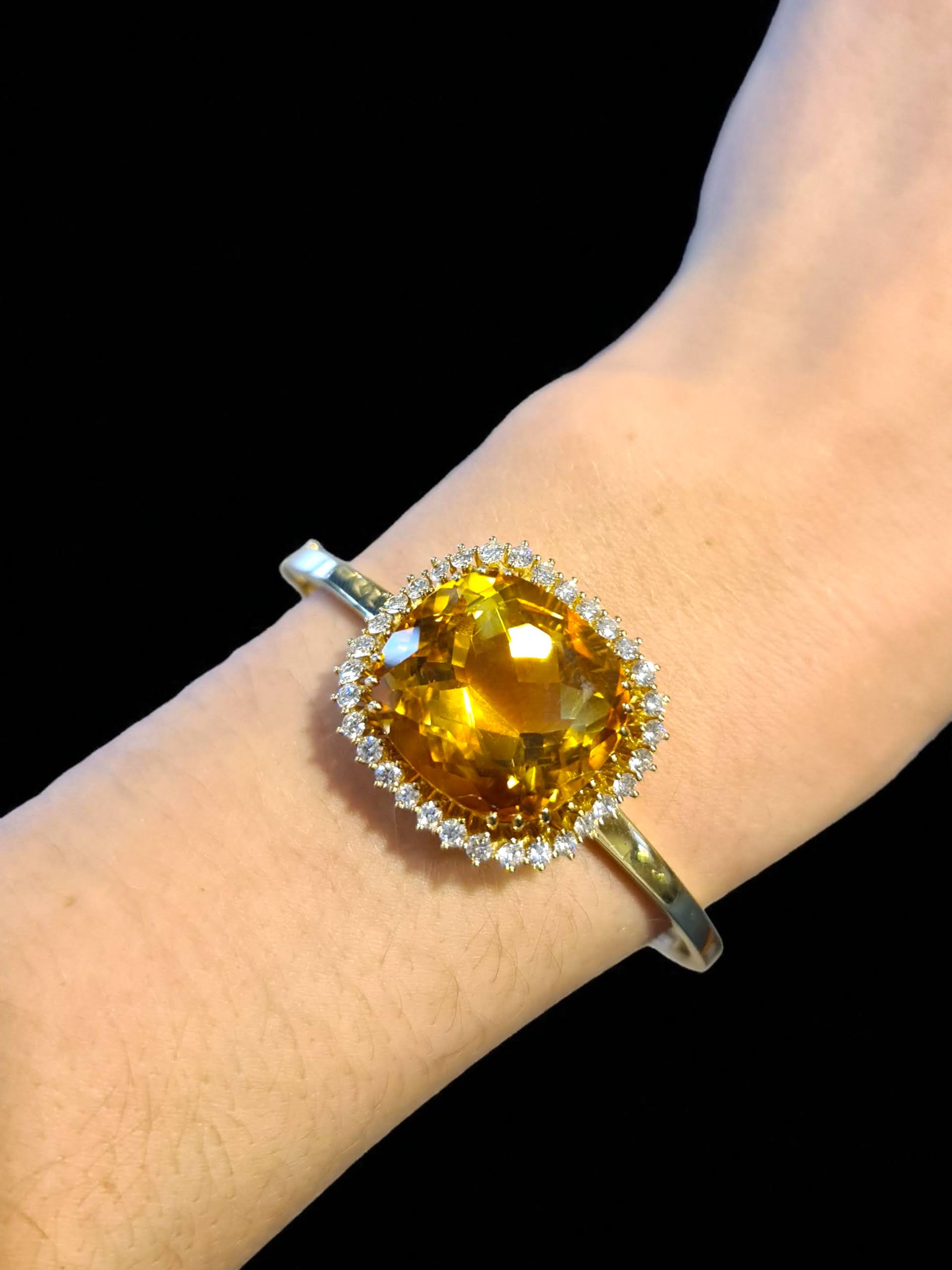 Deze imponerende armband is zonder twijfel een topstuk. Vervaardigd uit 18 karaats geelgoud en bezet met een oogverblindende citrien van 22mm breed, omlijst door tweeëndertig schitterende diamanten (totaal 1,60 karaat, Top Wesselton, VS).