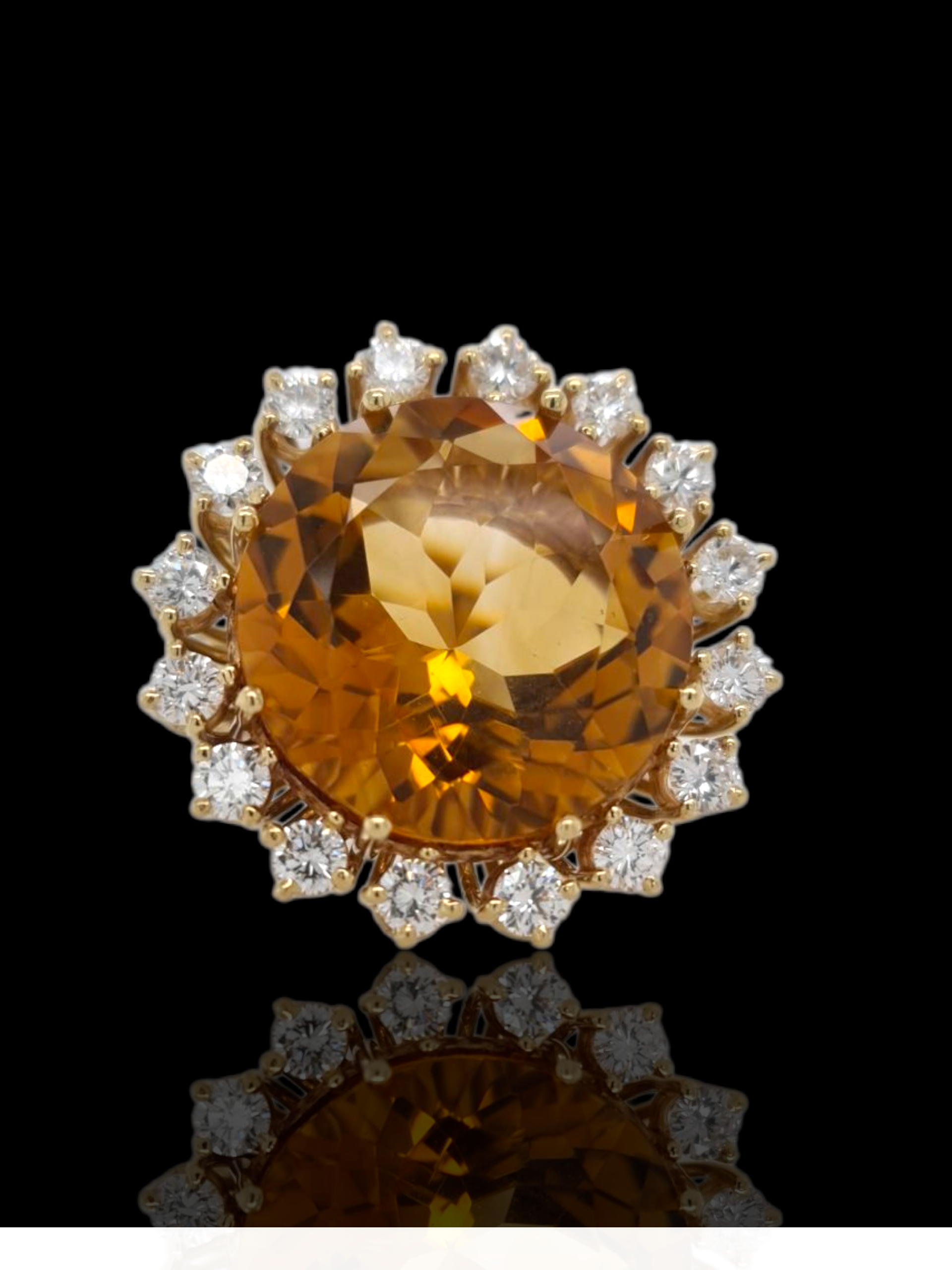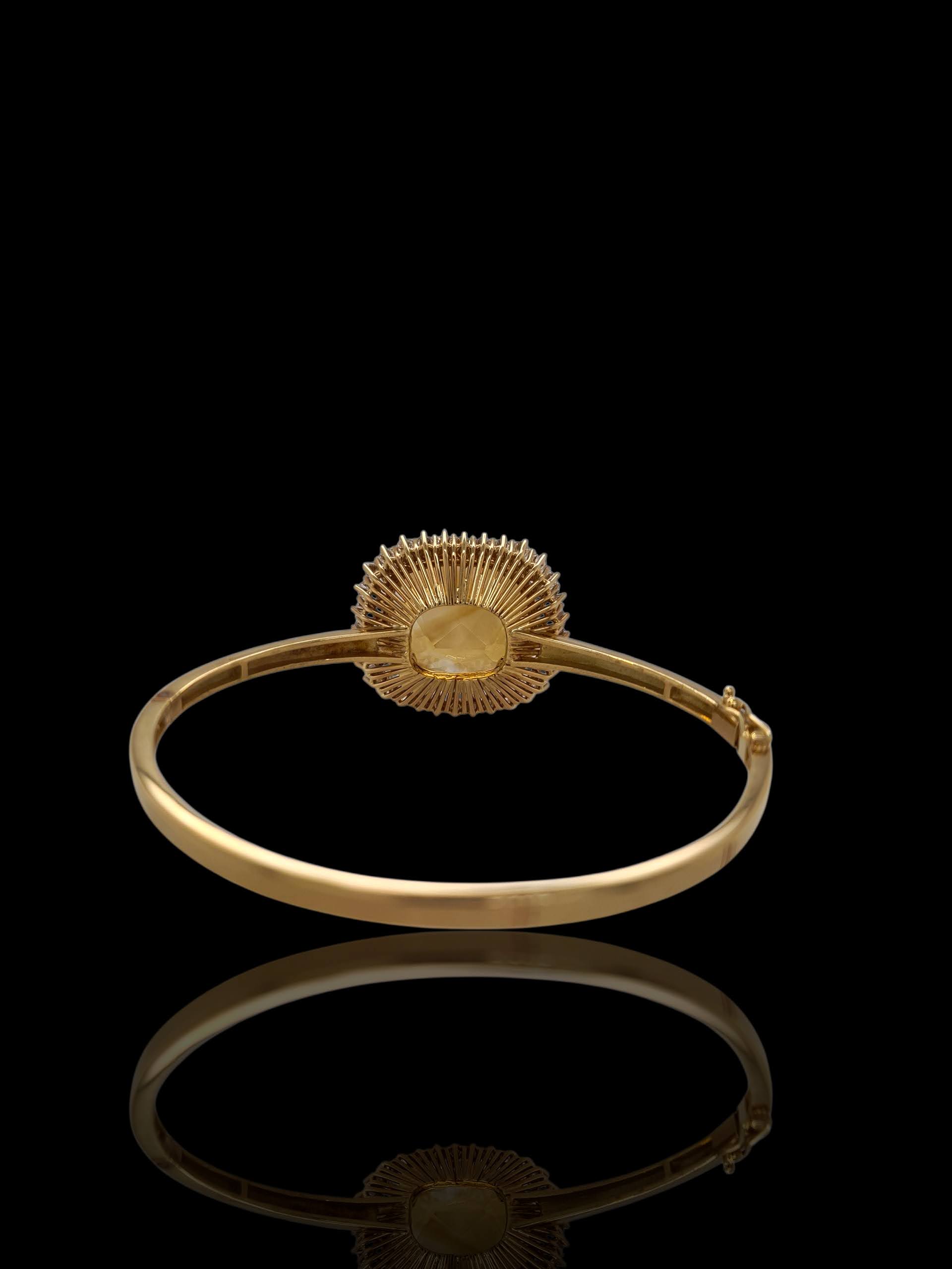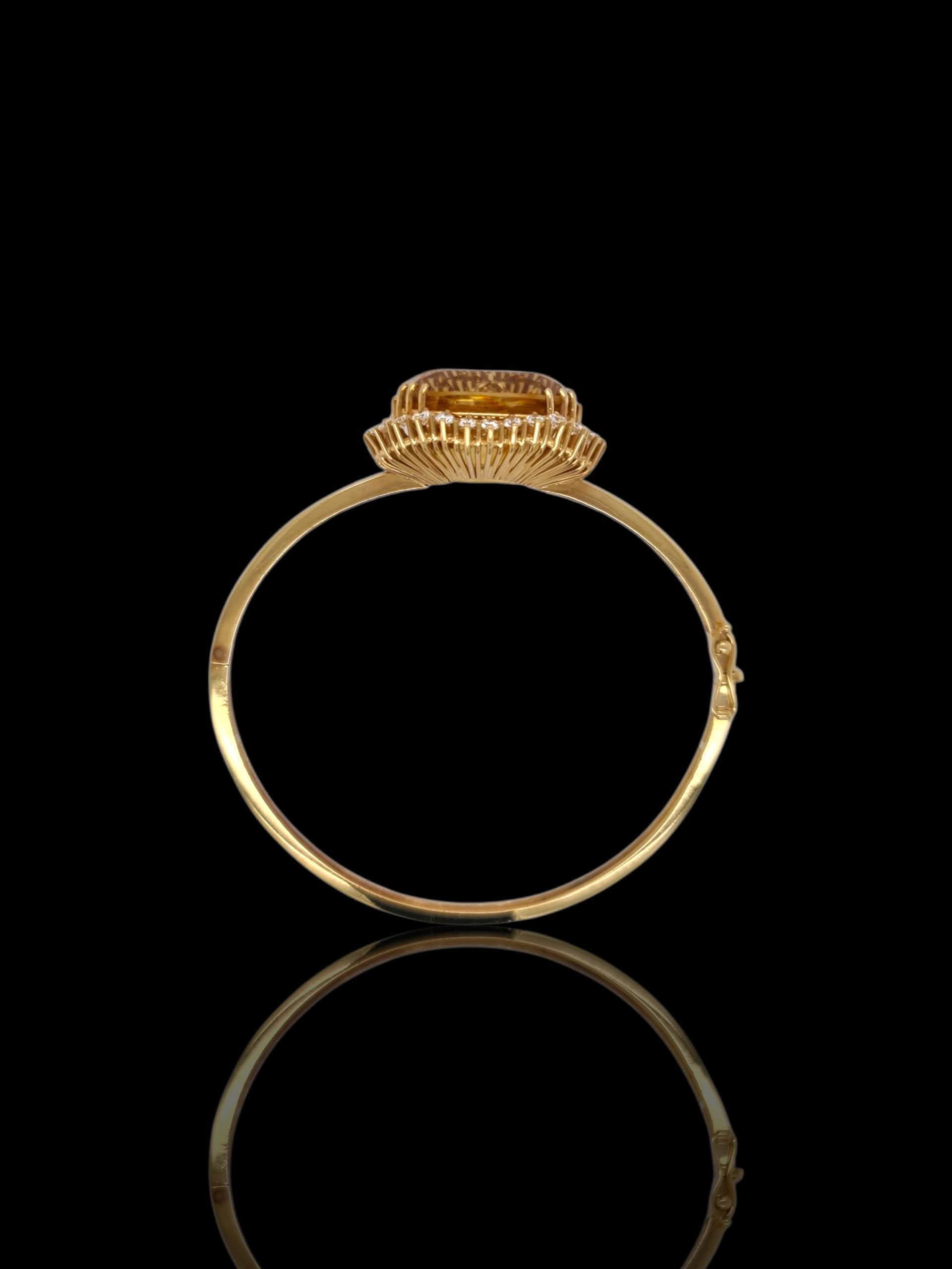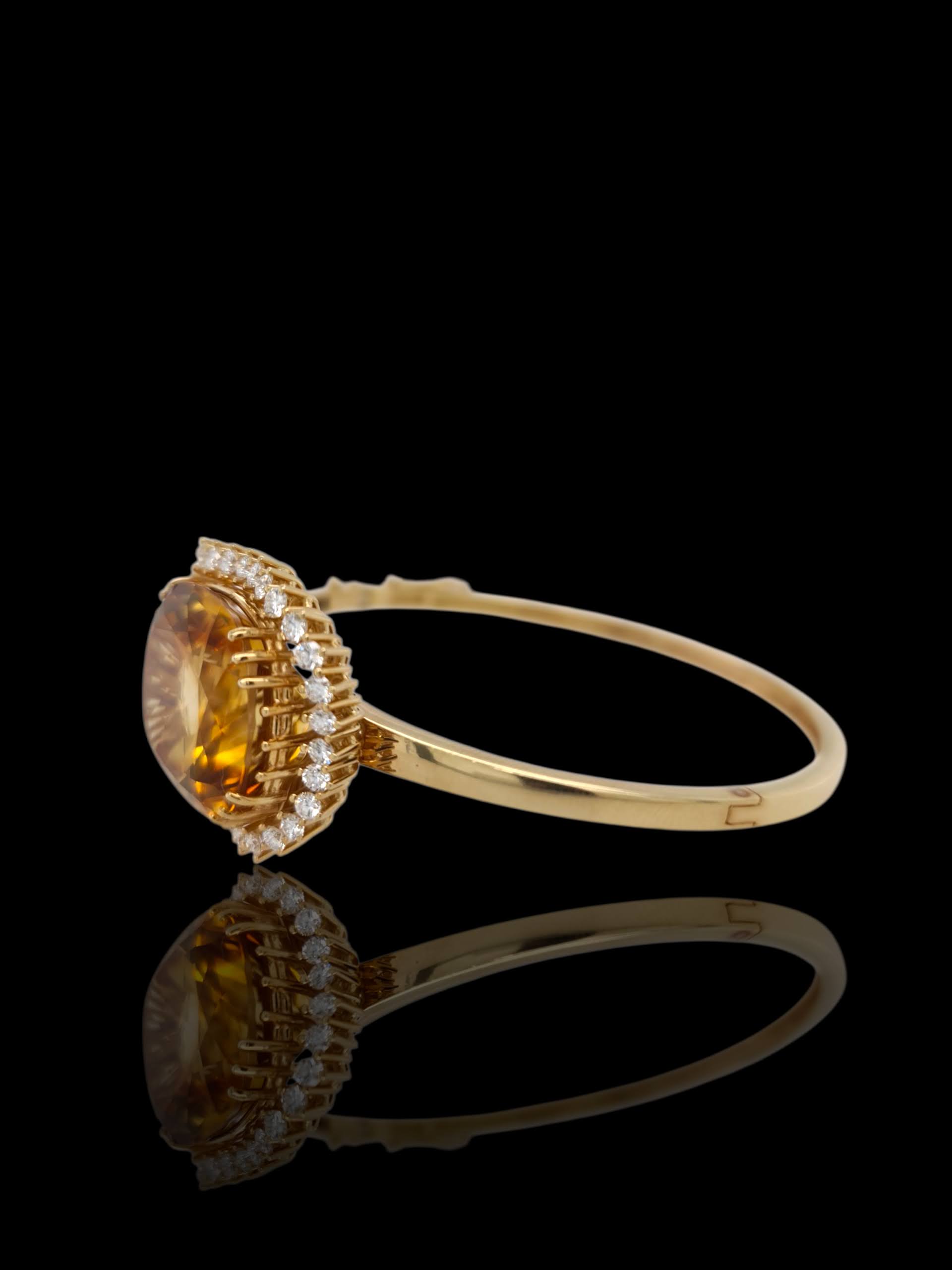 Deze imponerende armband is zonder twijfel een topstuk. Vervaardigd uit 18 karaats geelgoud en bezet met een oogverblindende citrien van 22mm breed, omlijst door tweeëndertig schitterende diamanten (totaal 1,60 karaat, Top Wesselton, VS).