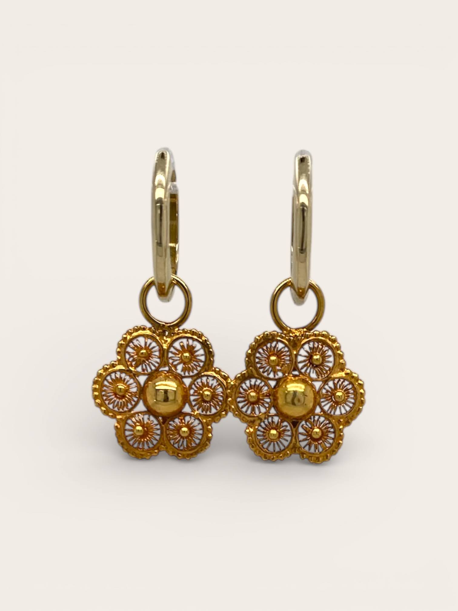 Deze prachtige creoolhangers van 18 karaat geelgoud in de vorm van een sierlijke bloem van filigrana, vervaardigd in traditionele Zeeuwse stijl. Het fijne draadwerk geeft deze hangers karakter en een authentieke uitstraling.