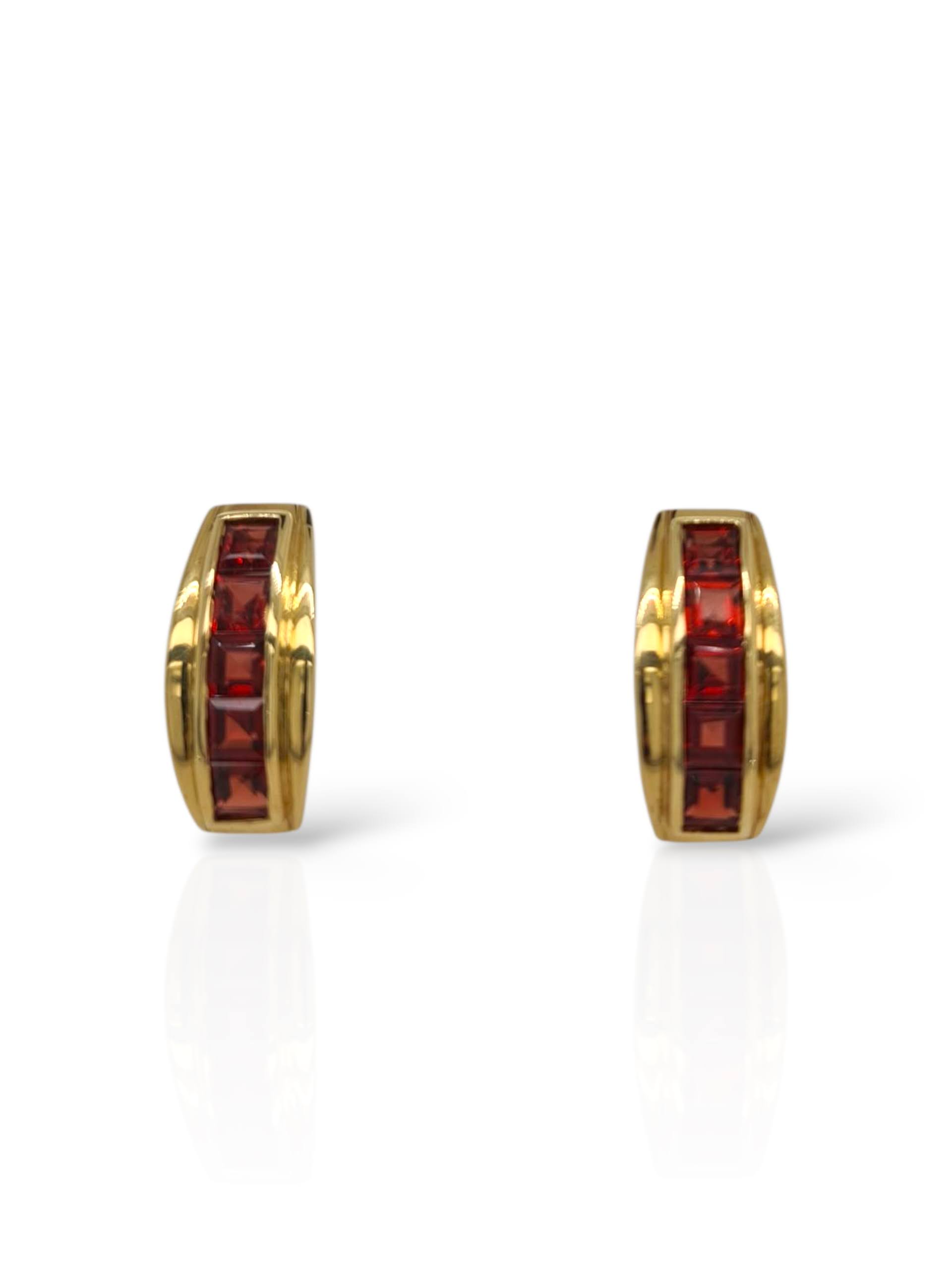 Elegante oorknoppen van 18 karaat geelgoud, elk bezet met vijf fonkelende roodbruine palmier citrien. De stenen vormen een verfijnde band in een half ronde knopvorm, die subtiel doet denken aan klassieke oorringen.