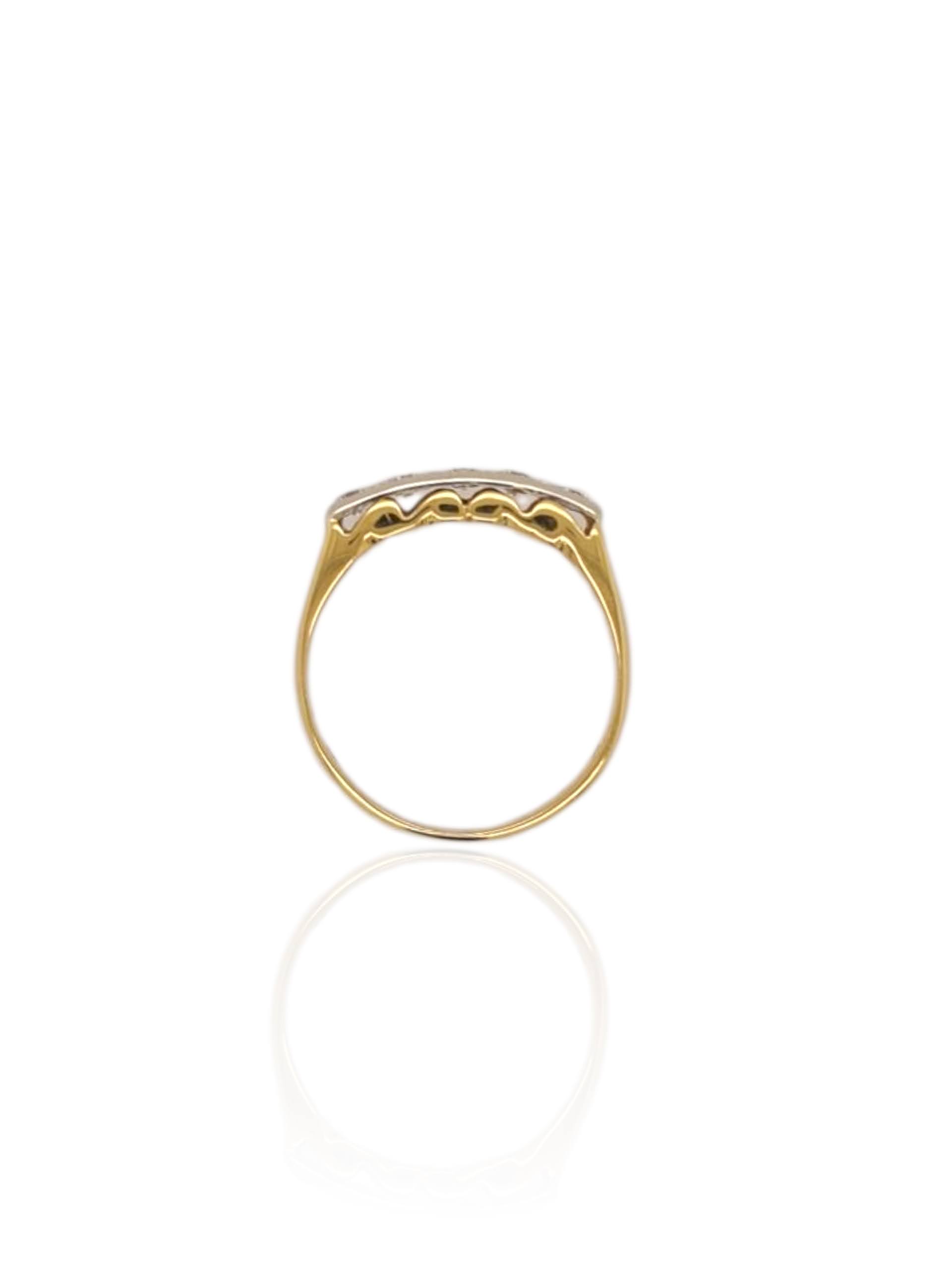 Deze bicolor ring van 18 karaat goud bestaat uit een geelgouden band met een rij van vijf schitterende diamanten (VS, TW, totaal 0,05 karaat), in een witgouden zetting. Het subtiel golvende detail onder de zetting geeft de ring een speelse en unieke uitstraling. Hoewel vintage, verkeert deze ring in uitstekende staat. Een vonkelend stuk!
