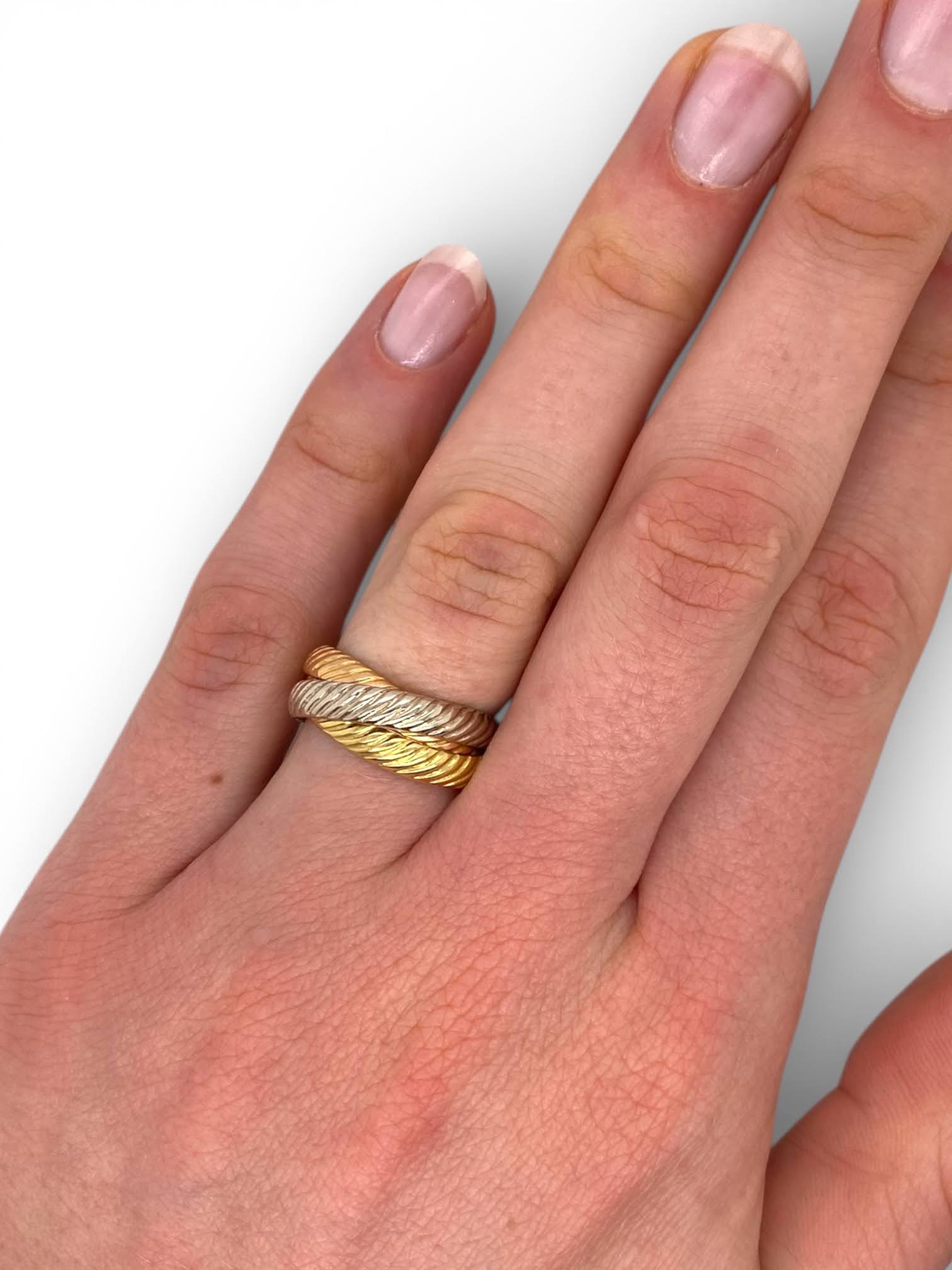 Elegante 18 karaat tricolor gouden ring, bestaande uit drie in elkaar geregen banden van geel-, wit- en roségoud die samen een mooie drie-eenheid vormen. De banden zijn rijk gedecoreerd met prachtige, spiralende gravuren, wat de ring een klassieke en stijlvolle uitstraling geeft.