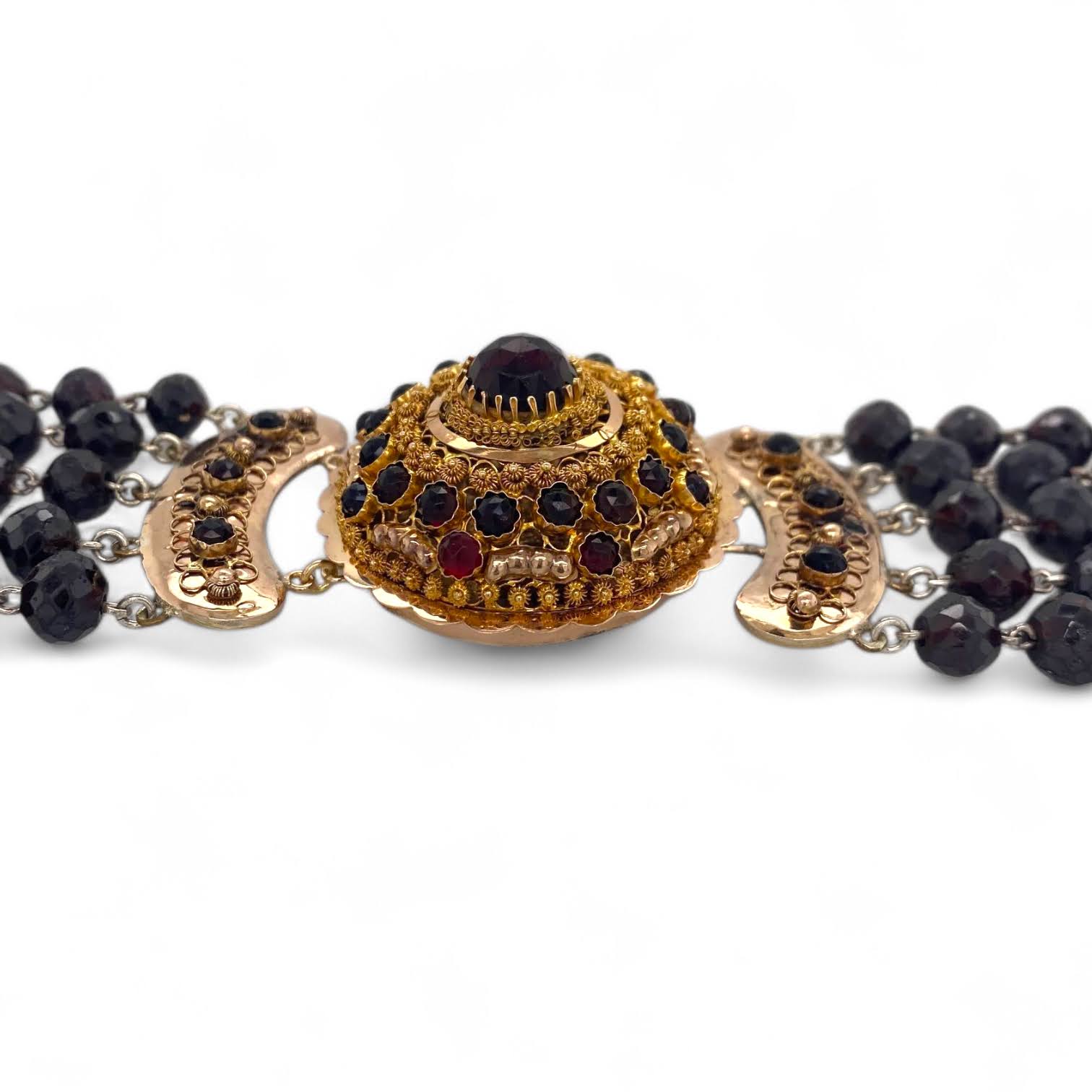 Een bijzondere vijf rijige rouwketting uitgevoerd met schitterende facetgeslepen granaat kralen. Dit traditioneel Zeeuws sieraad uit Walcheren is geregen op stevig zilverdraad en afgewerkt met een elegant 14 karaat geelgouden slot, eveneens bezet met granaat. Dankzij de korte lengte en brede opbouw valt dit vintage collier prachtig rond de hals en vormt het een opvallend, stijlvol sieraad  met historie.