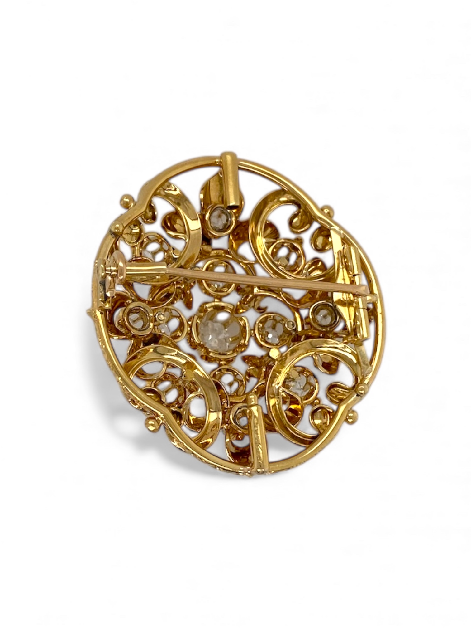 Uitzonderlijk luxueuze broche van 18 karaat goud in Victoriaanse stijl, rijk bezet met diamanten in oude slijpvorm. De broche bevat in totaal 2,62 karaat diamant. De sierlijke gouden krullen zijn verfijnd geëmailleerd en uiterst fijn gegraveerd, wat getuigt van uitzonderlijk vakmanschap.