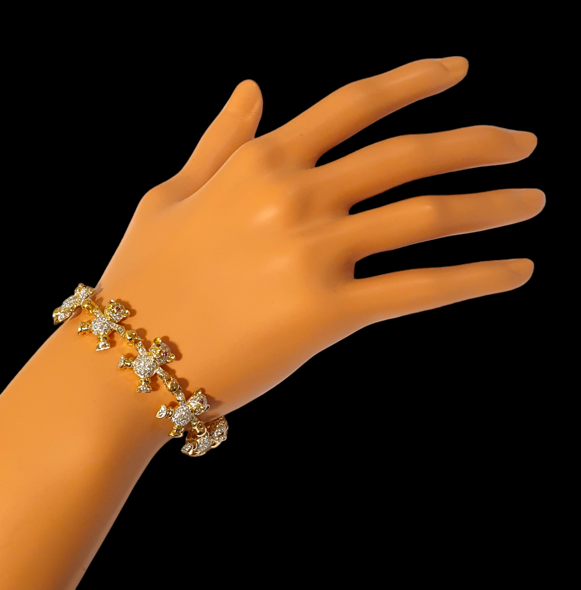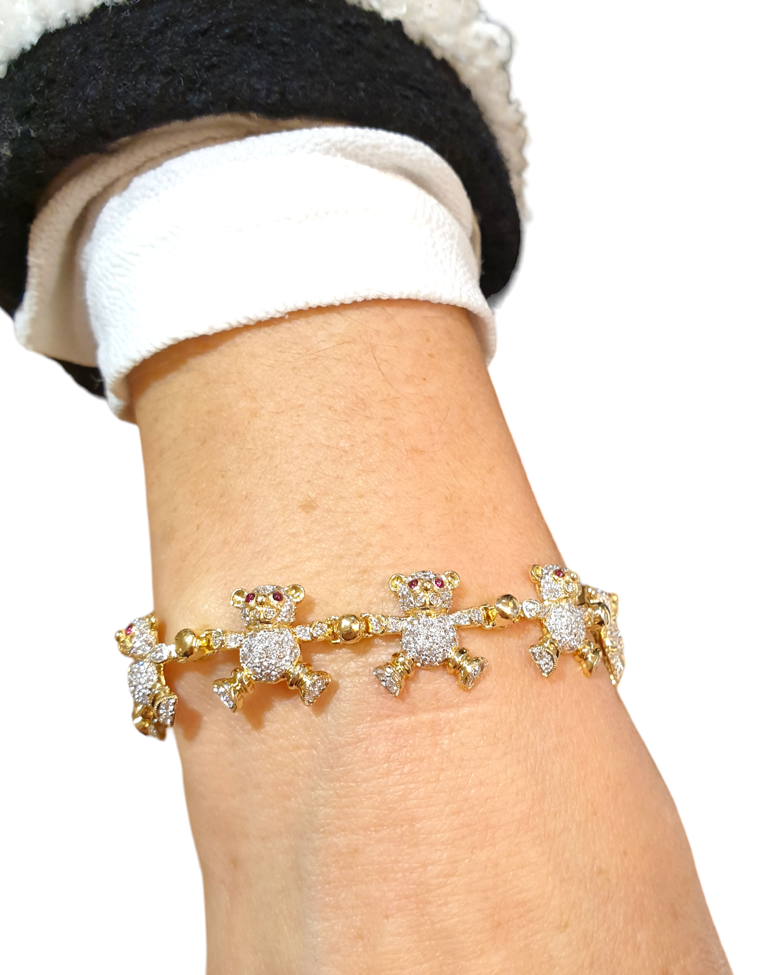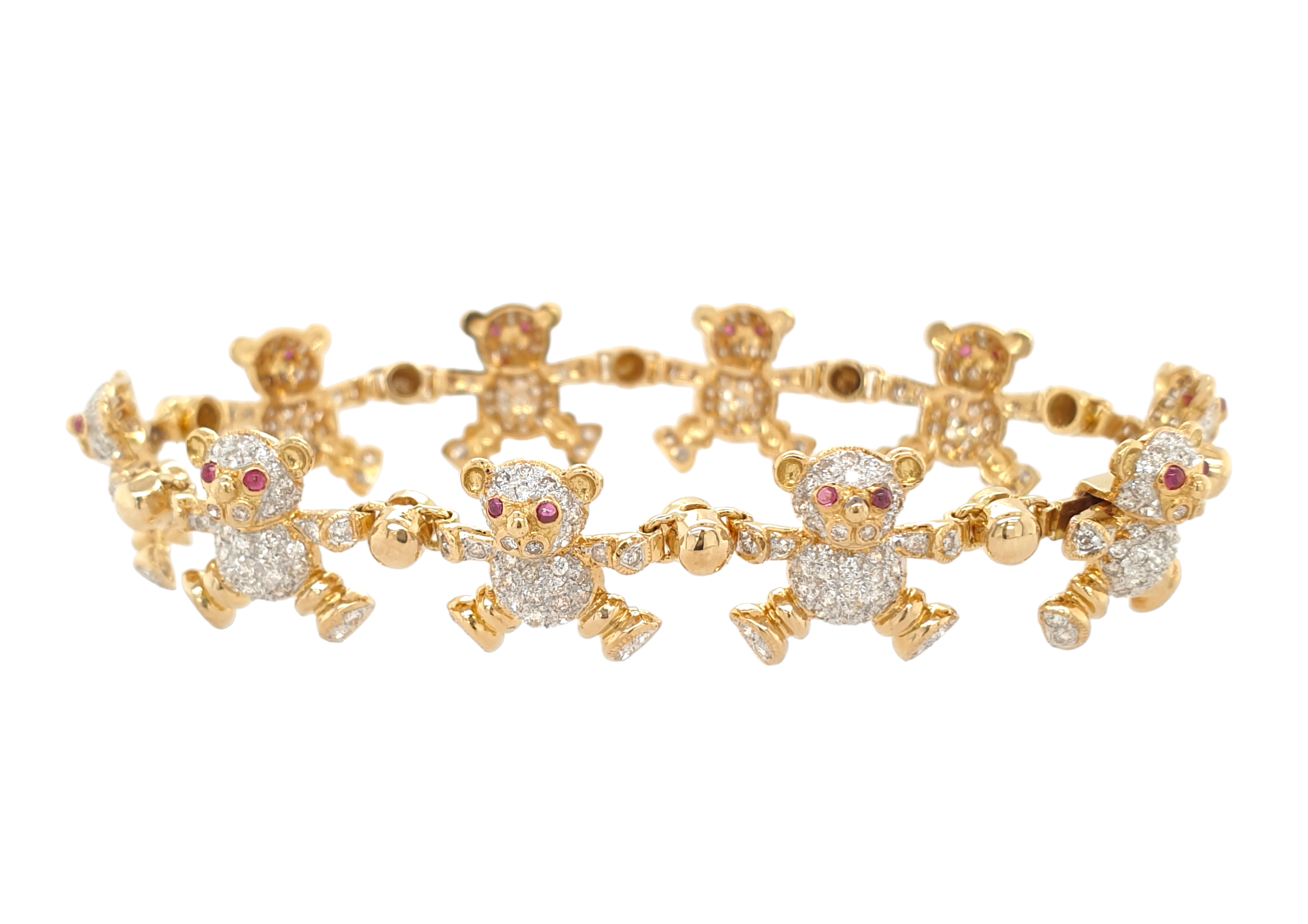 Deze 18 karaat geelgouden armband is opgebouwd uit speelse schakels in de vorm van beren. De schakels zijn volledig bezet met diamant, terwijl de ogen zijn geaccentueerd met robijnen, wat het geheel een levendige en luxe uitstraling geeft. Een opvallend en bijzonder sieraad met een speels karakter en rijke uitvoering.