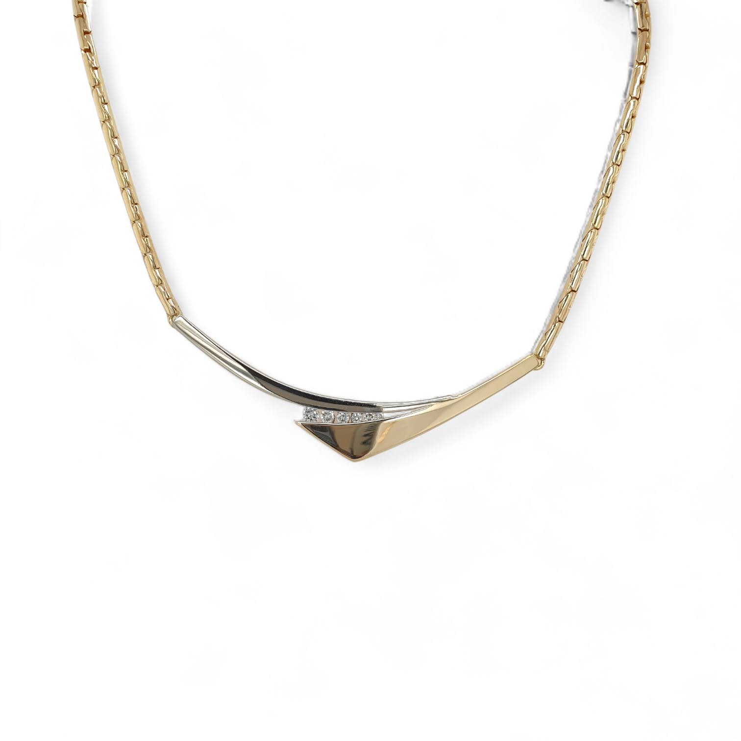 Stijlvol 14 karaat collier in wit- en geelgoud, gezet met zes diamanten die harmonieus oplopen in grootte. In dit strakke, moderne ontwerp schitteren de briljantgeslepen diamanten tussen twee verfijnde halve manen. De halfstijve schakel van de ketting vangt het licht prachtig en geeft het geheel een luxueuze uitstraling.