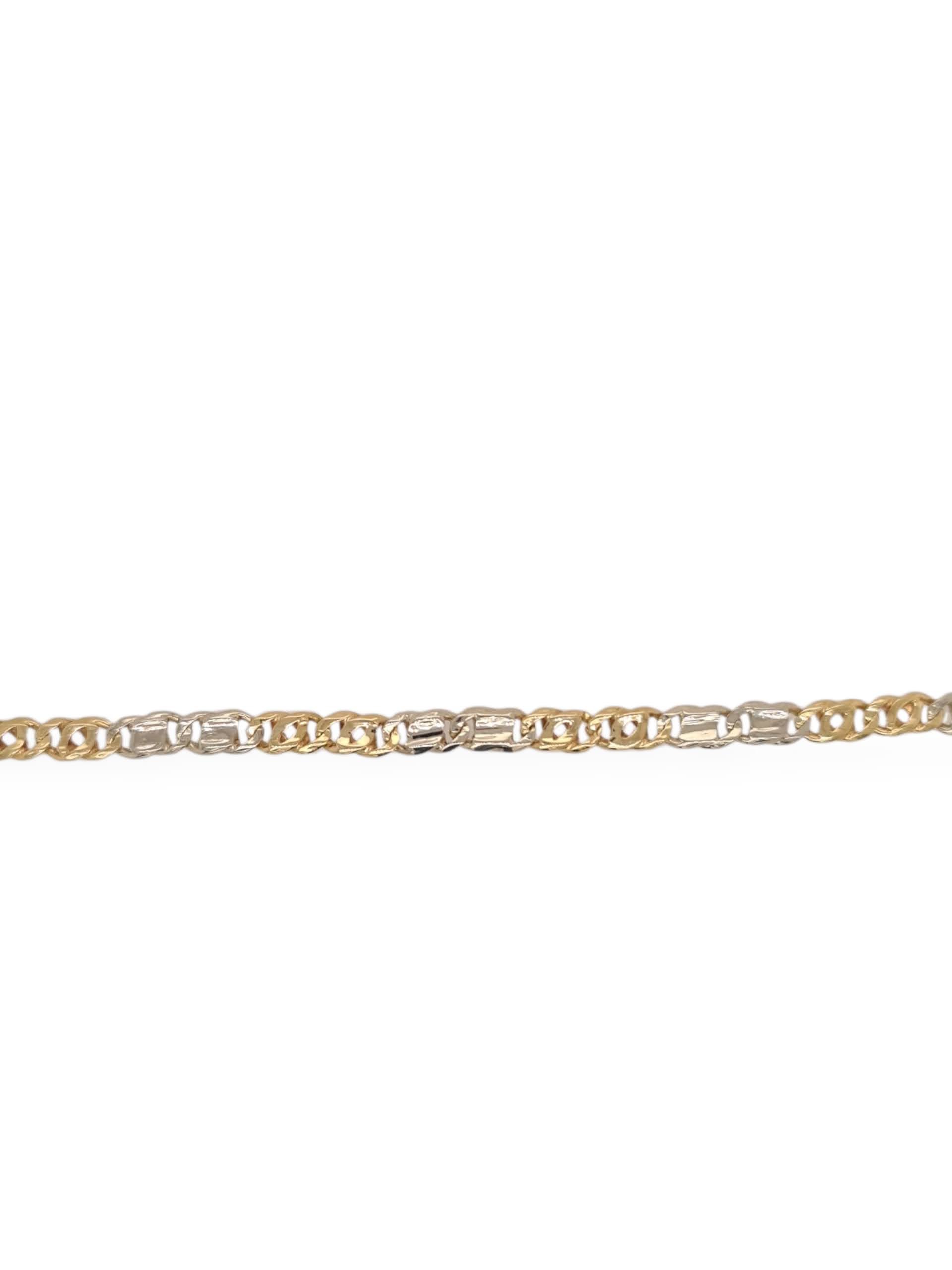 Bicolor gourmette schakelarmband van 18 karaat wit en geelgoud. Een klassiek en toch unieke armband door de gouden plaatjes in de witgouden schakels. Deze armband is tweedehands maar ziet eruit als nieuw.