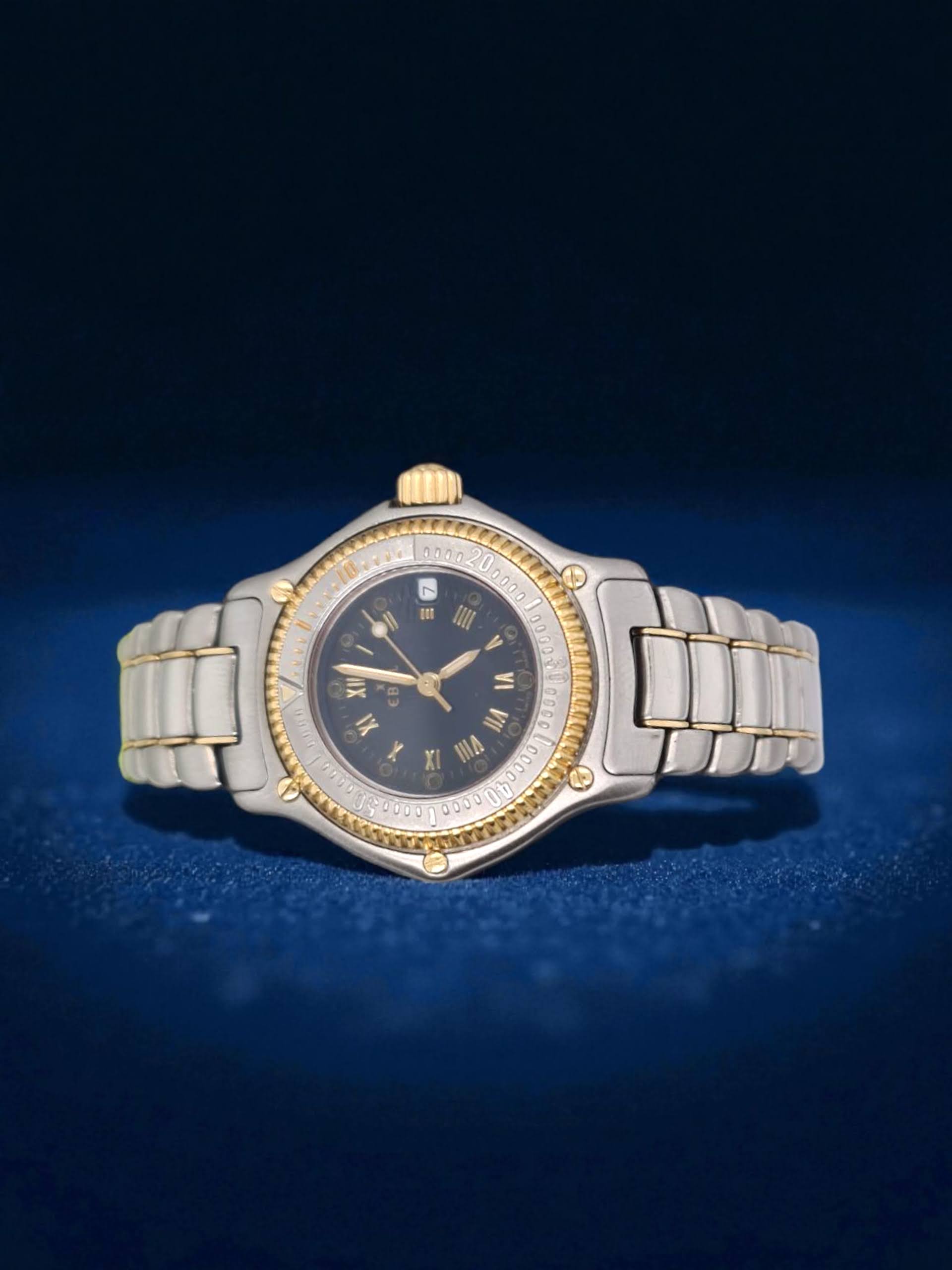 Prachtig dameshorloge van Omega van edelstaal, model De Ville. De wijzerplaat is prachtig verfraaid met een parelmoerachtig subtiel vlindermotief. De Romeinsche cijfers worden afgewisseld met sprankelende steentjes. Dit fraaie horloge is volledig gereviseerd. Een prachtige vintage stuk in uitstekende staat.