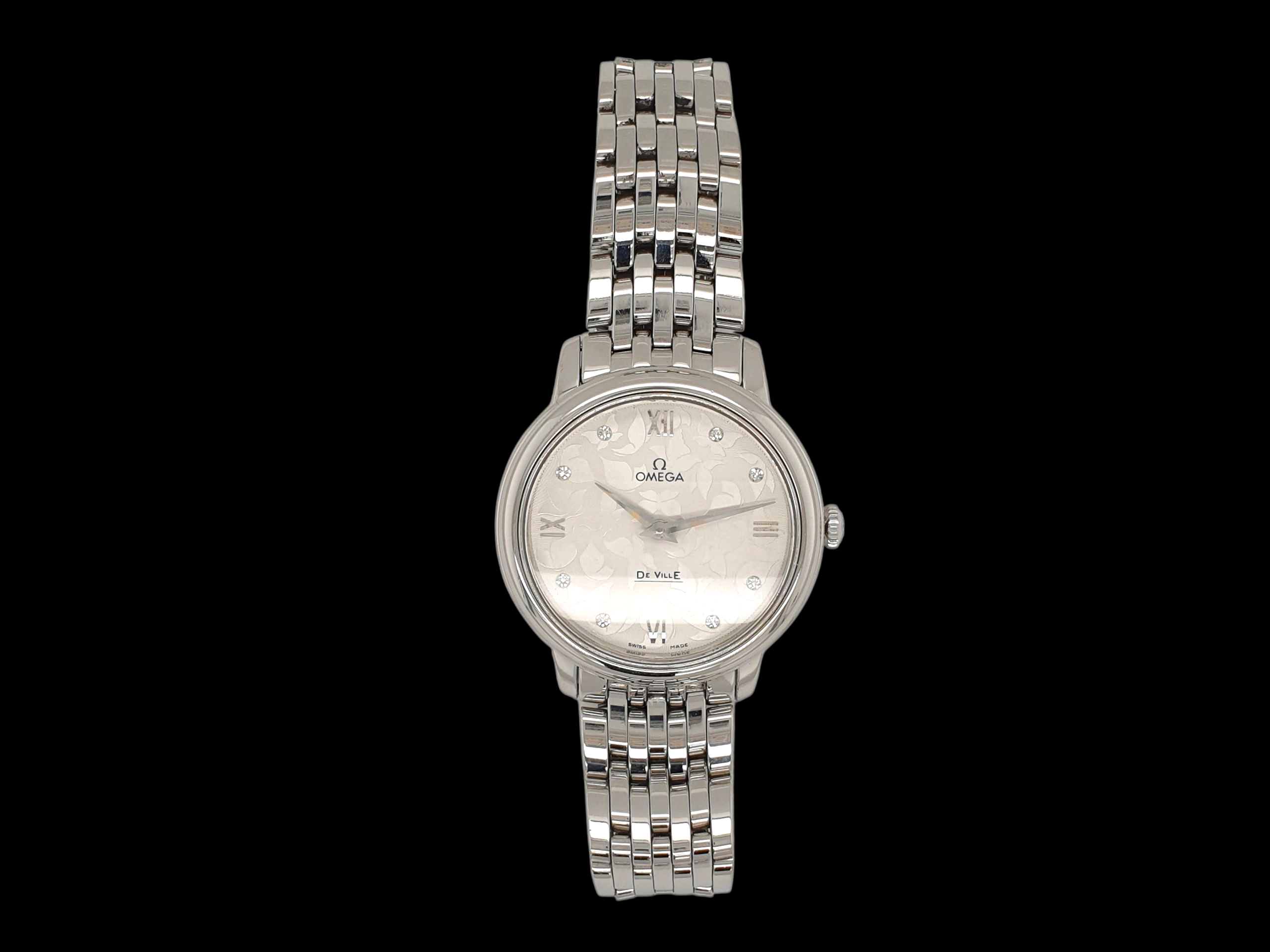Prachtig dameshorloge van Omega van edelstaal, model De Ville. De wijzerplaat is prachtig verfraaid met een parelmoerachtig subtiel vlindermotief. De Romeinsche cijfers worden afgewisseld met sprankelende steentjes. Dit fraaie horloge is volledig gereviseerd. Een prachtige vintage stuk in uitstekende staat.