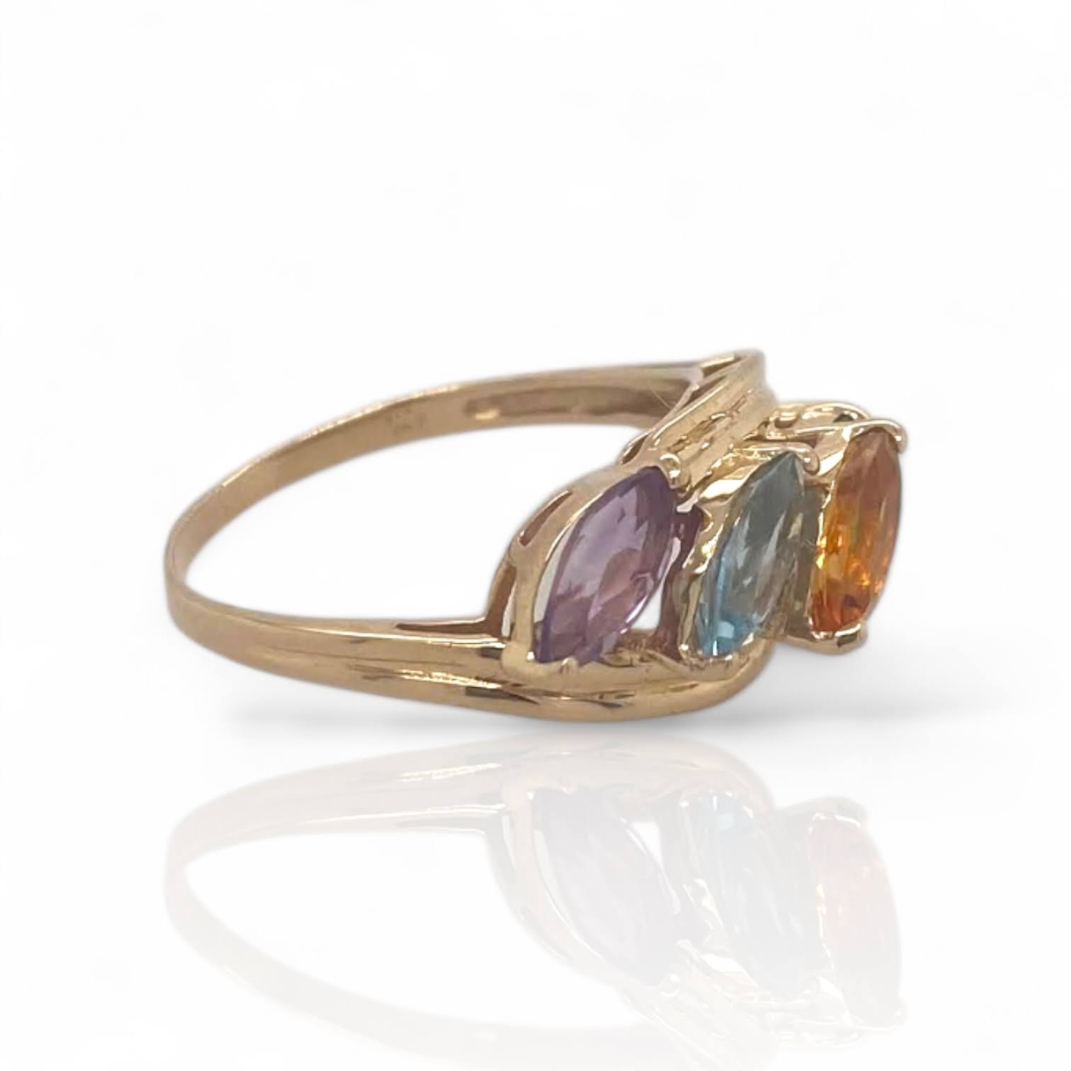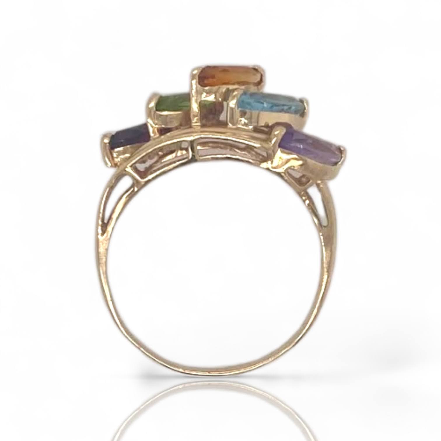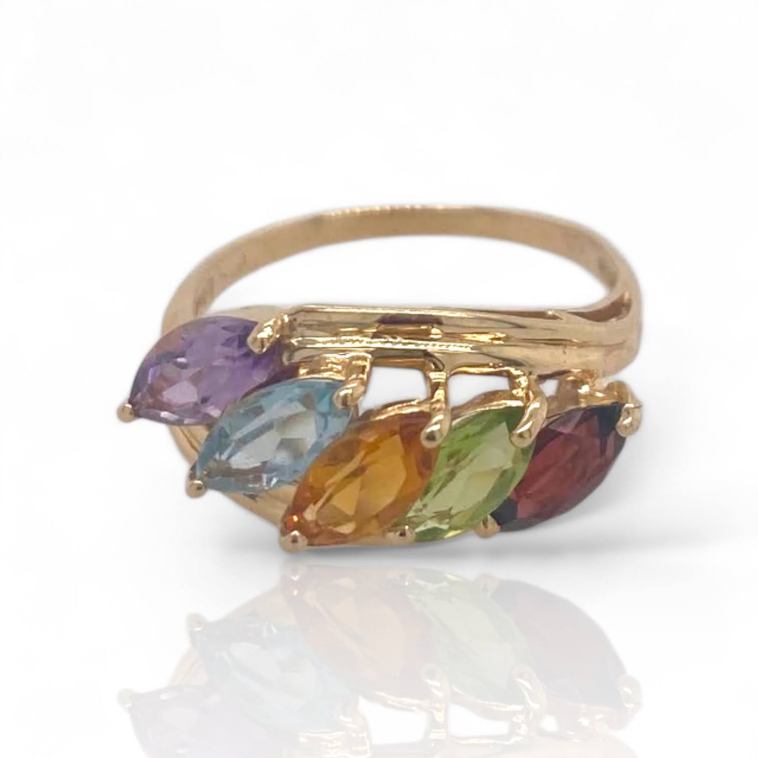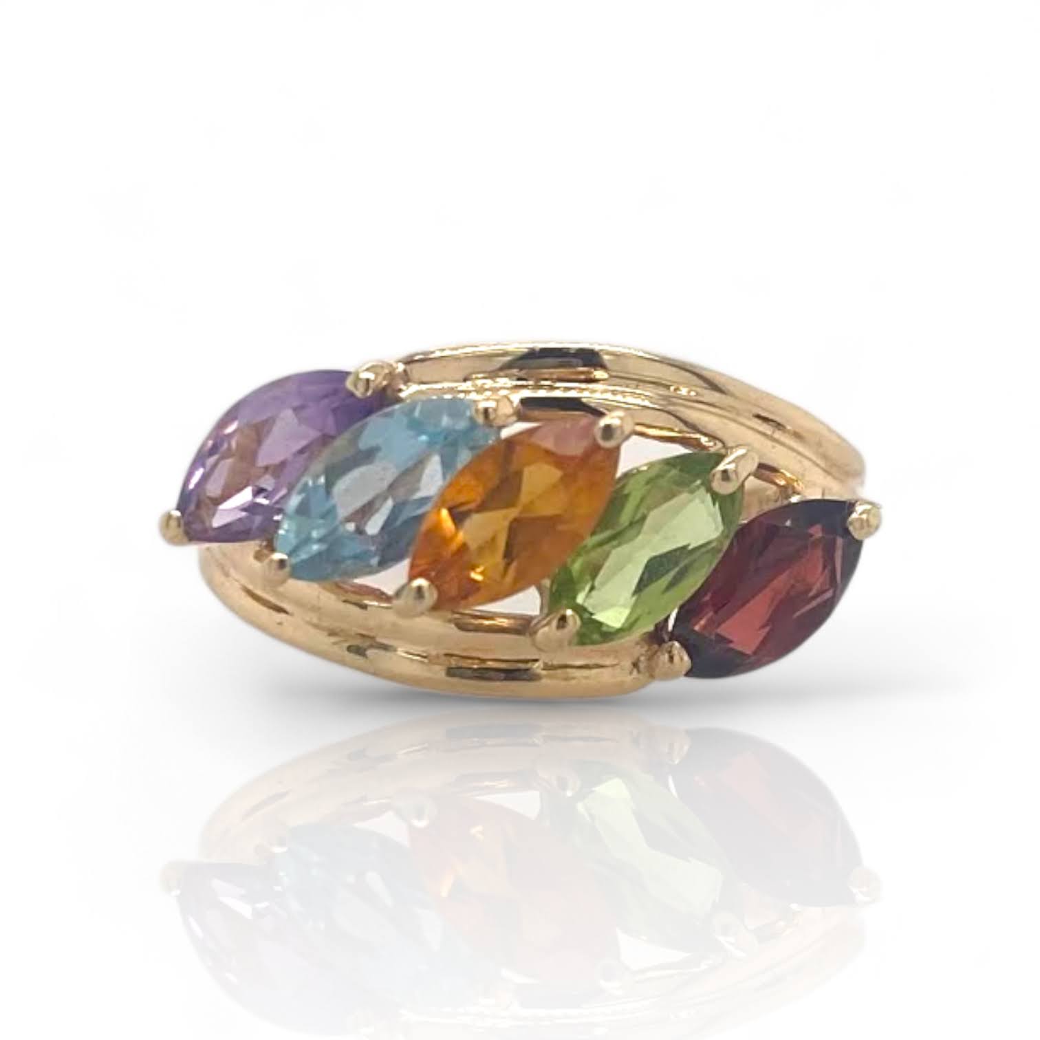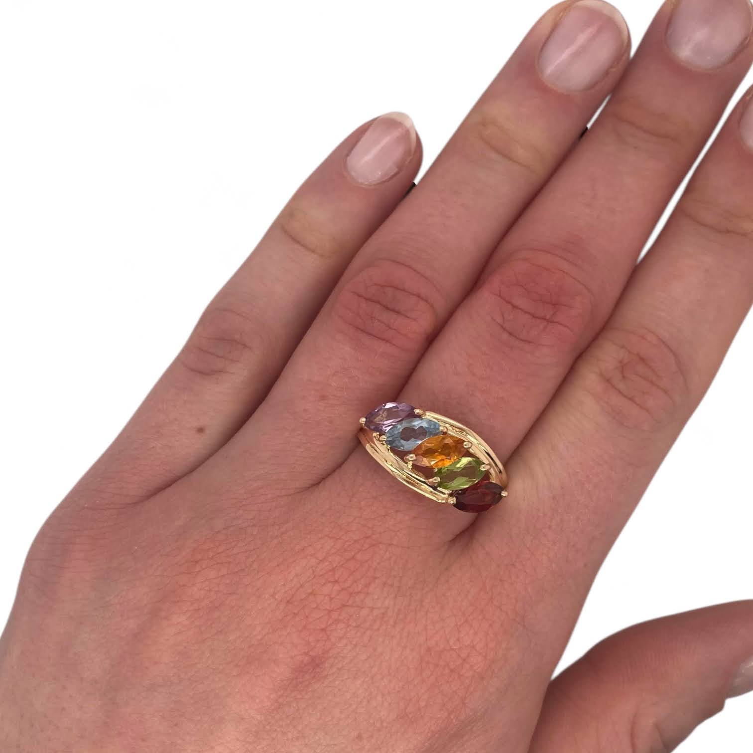 Deze kleurrijke ring van 14 karaat geelgoud is een vrolijk statement juweel. In het midden schitteren vijf facet geslepen stenen in een prachtige regenboog van granaat, peridot, citrien, aquamarijn en amethist. De ringband heeft een fijne structuur en lijkt zich om de stenen te wikkelen.