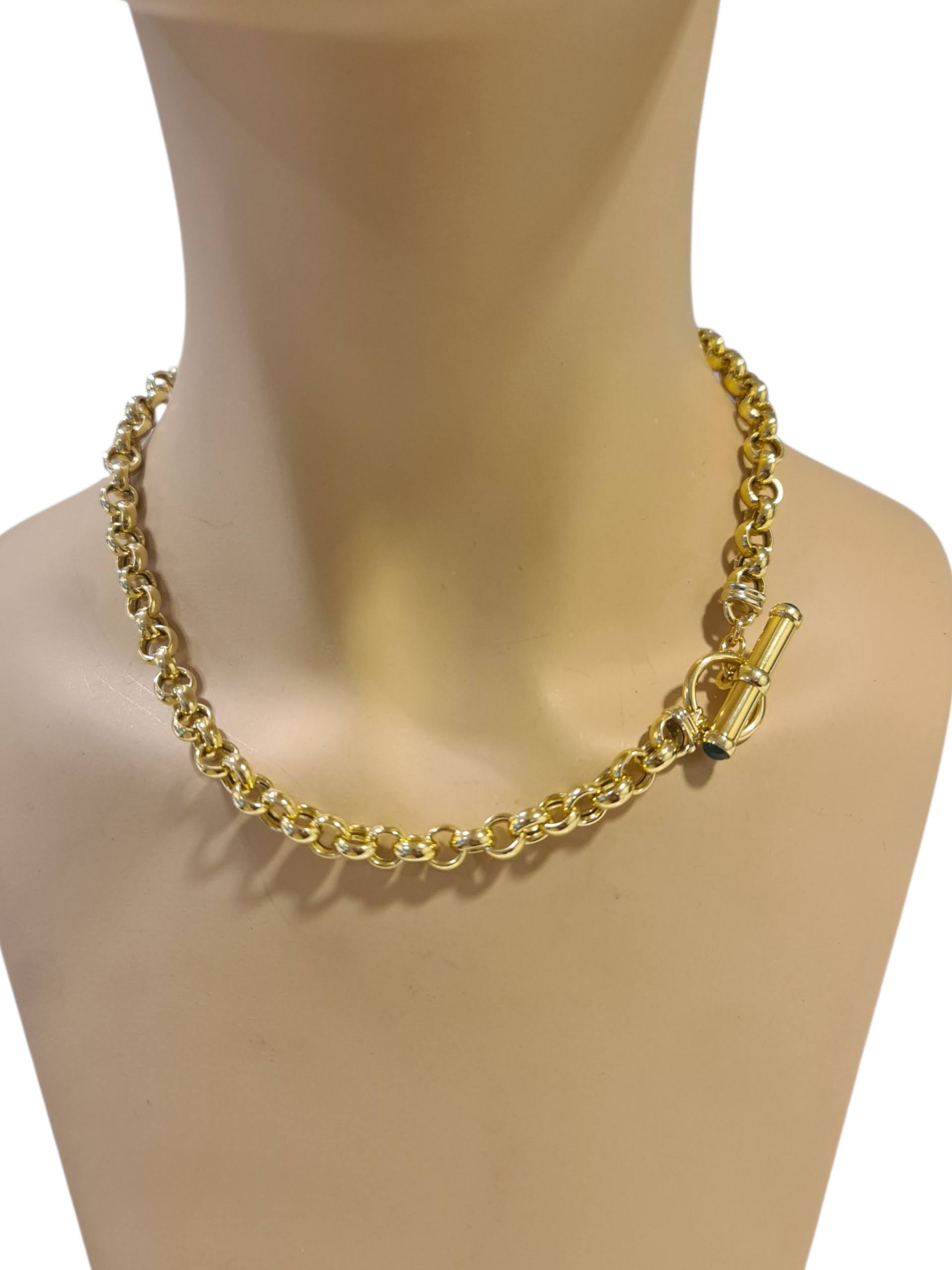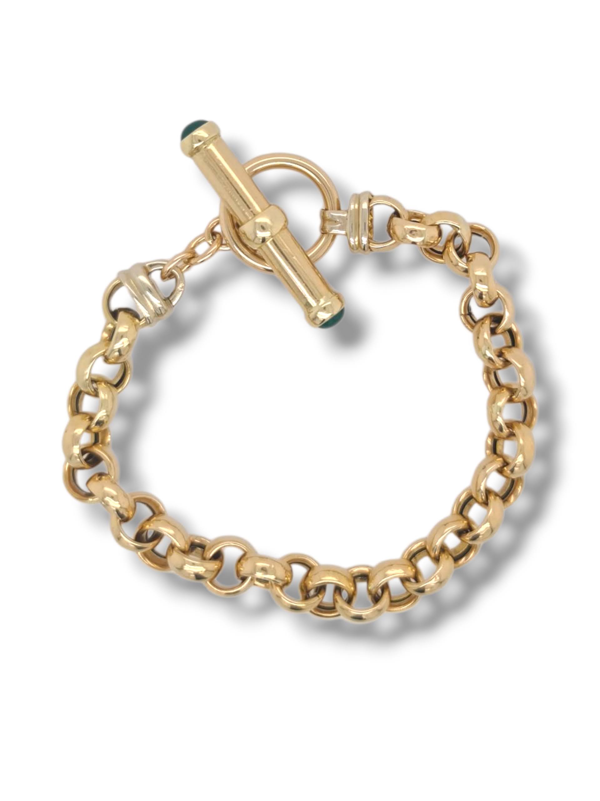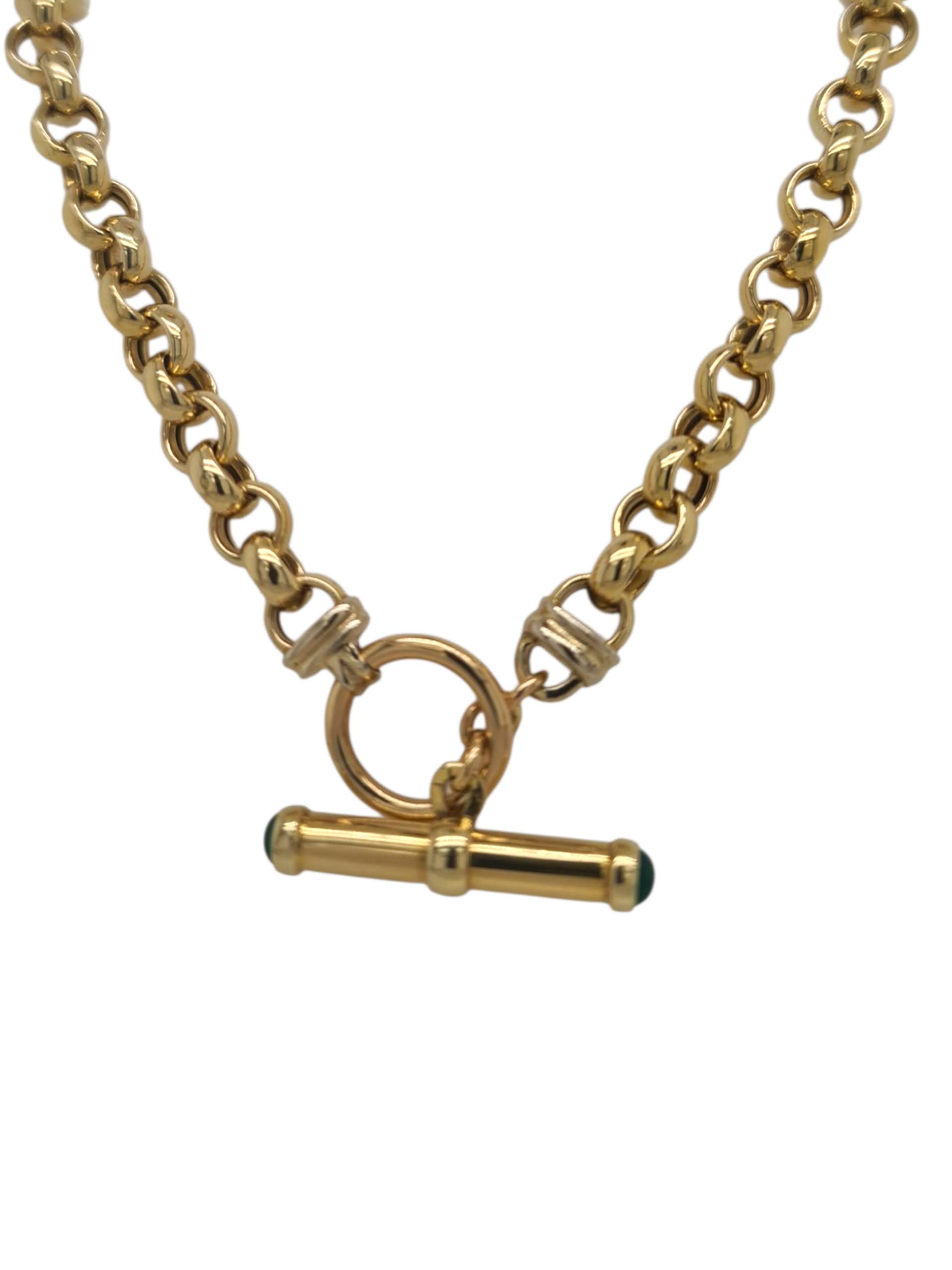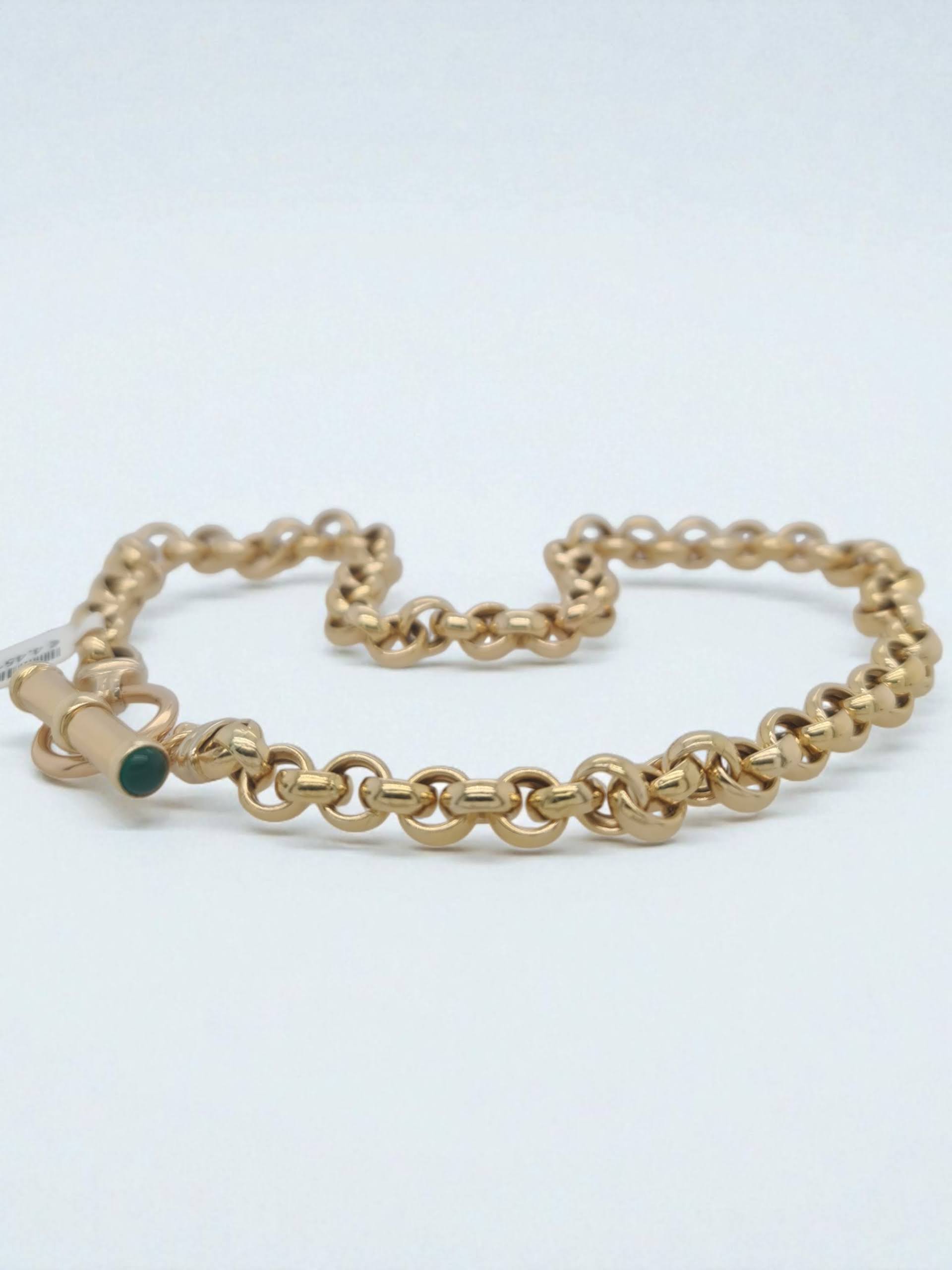 14 karaats geelgouden jasseron collier met houtje-touwtje sluiting. De gouden staaf is aan beide zijden verfraaid met een groene agaat wat het sieraad een speelse, unieke uitstraling geeft.