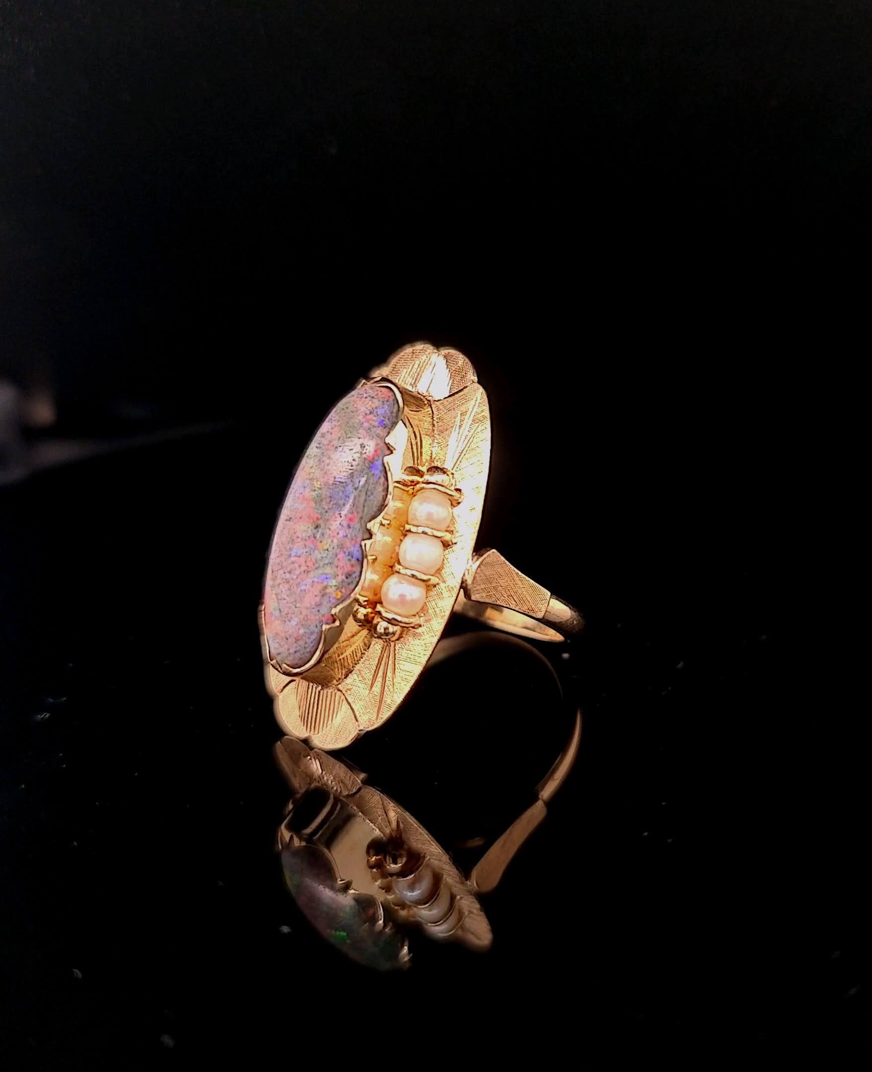 Prachtige vintage ring van 14 karaat geelgoud met gegraveerde purperen opaal, omringd door zes elegante parels.