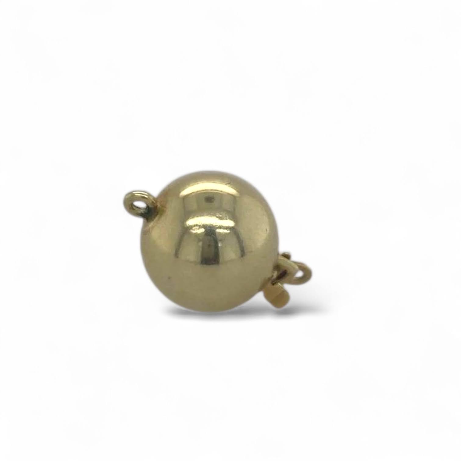 Deze strakke, glanzende kraal van 14 k geelgoud dient als stijlvol slot voor je collier. Eén kant van het collier schuift met een veertje in de bol en wordt vervolgens beveiligd met een haakje, wat zorgt voor een stevig en elegant geheel.