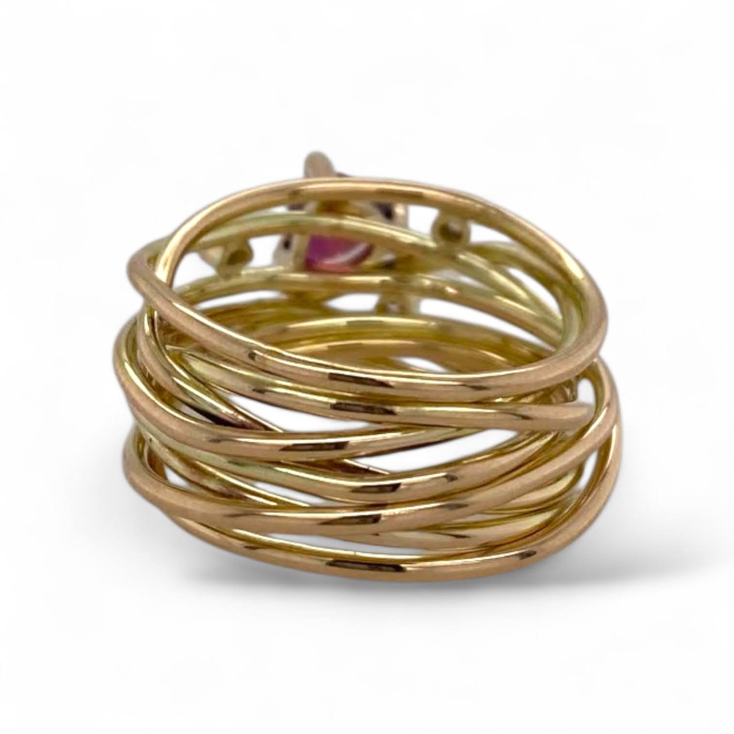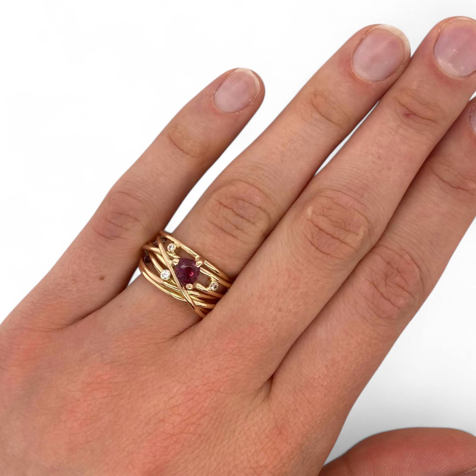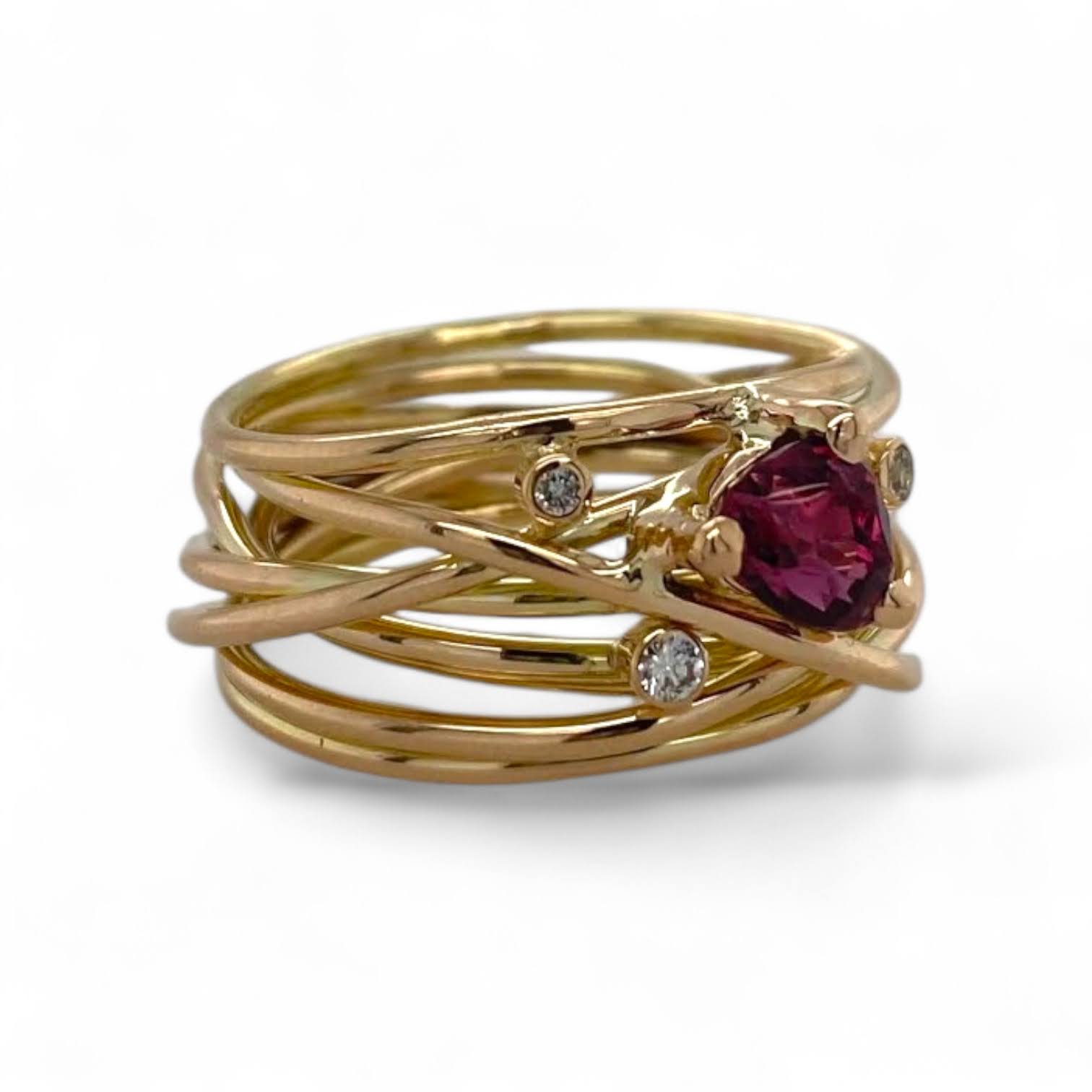 Zeer fraaie, ruimtelijk vormgegeven 14 karaat geelgouden Endless Rope ring met drie briljant geslepen diamanten en een prachtige felrode saffier als blikvanger. Dit sieraad is een echt topstuk binnen onze collectie handgemaakte juwelen.
