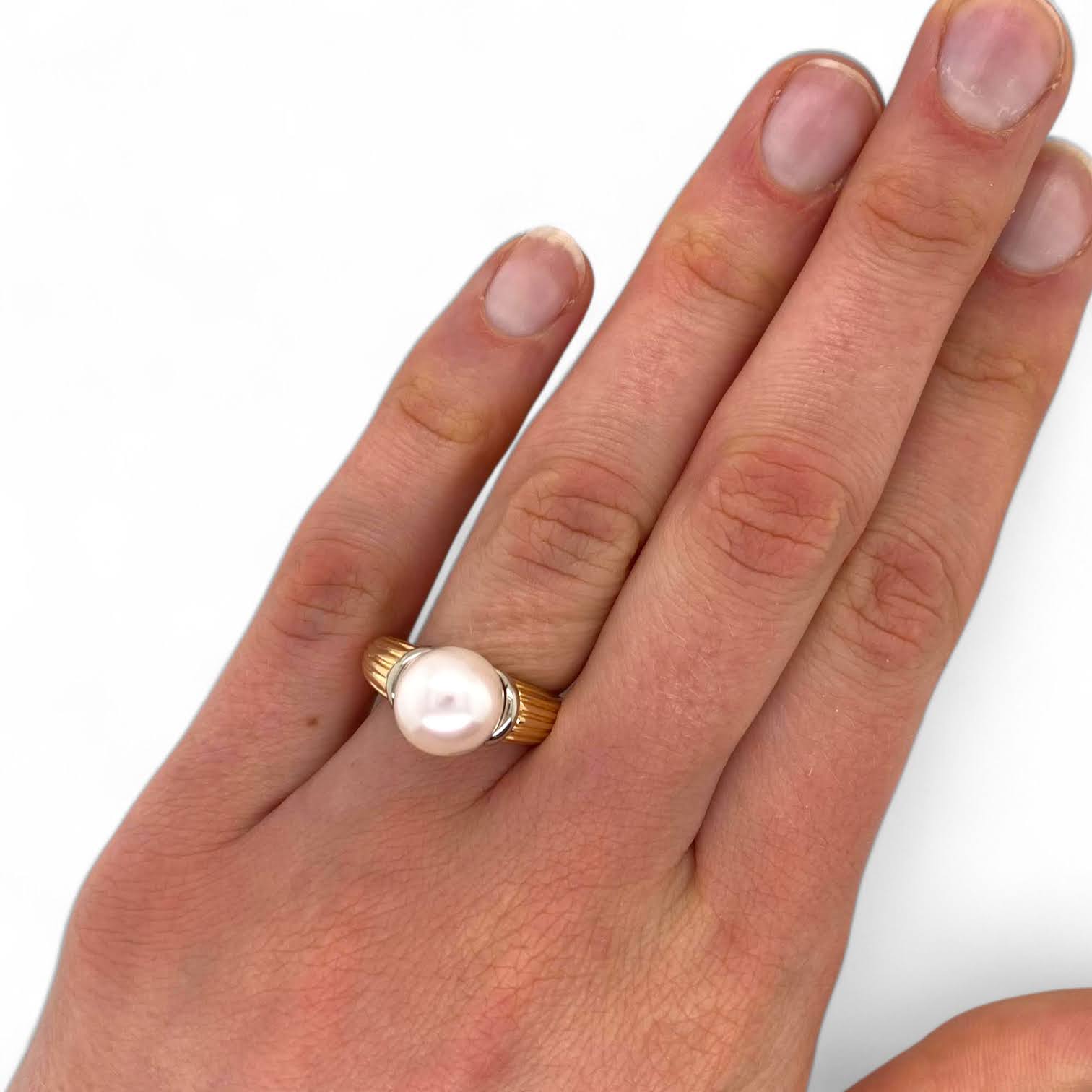 Prachtige gouden ring bezet met een grote parel. De ring lijkt de parel te omhullen als een schelp, dankzij de fraaie reliëflijnen. Rond de steen zorgt een fijne rand van 18 karaat witgoud voor een mooi contrast. Een prachtige vintage ring met stijlvolle allure.