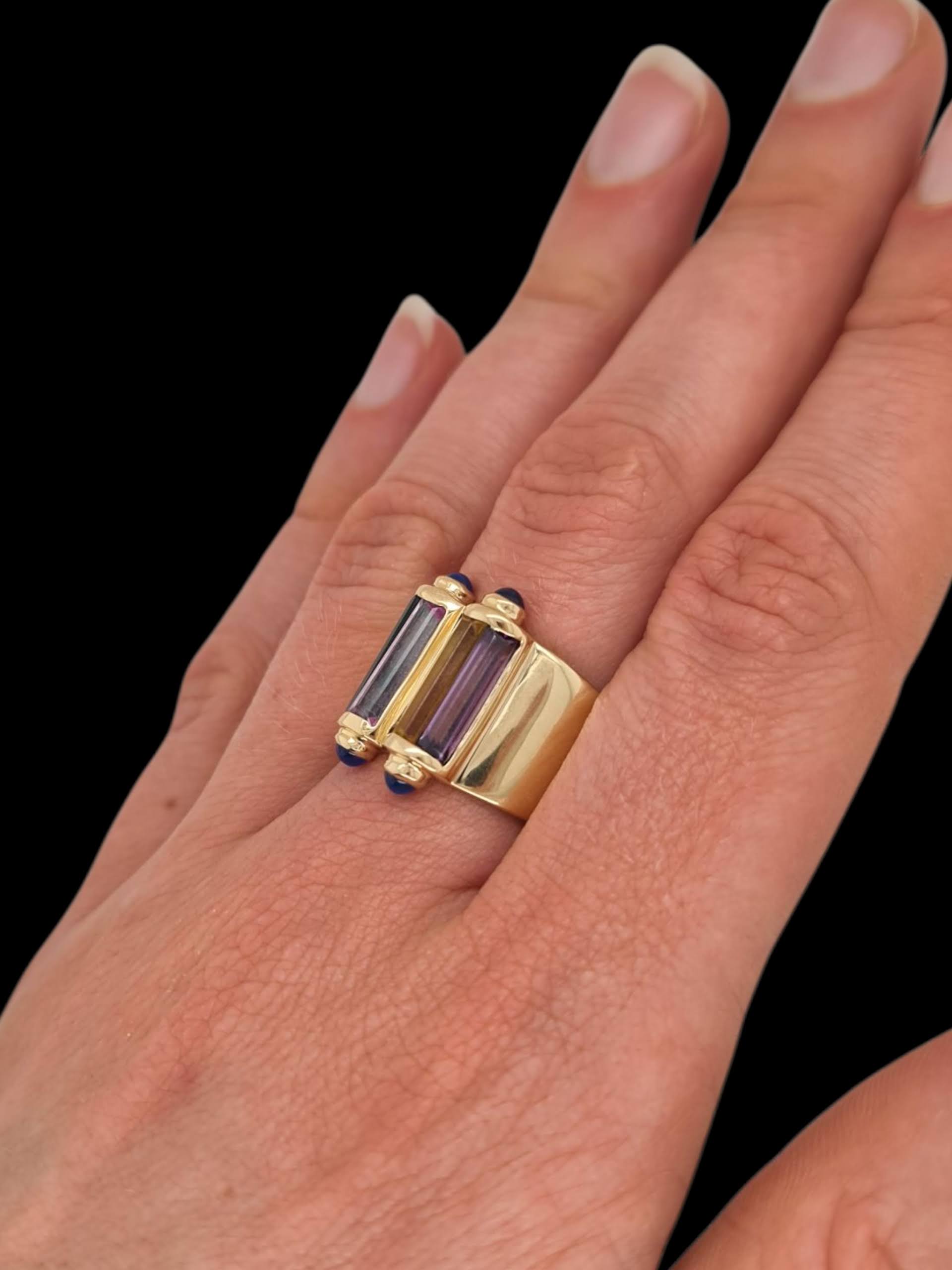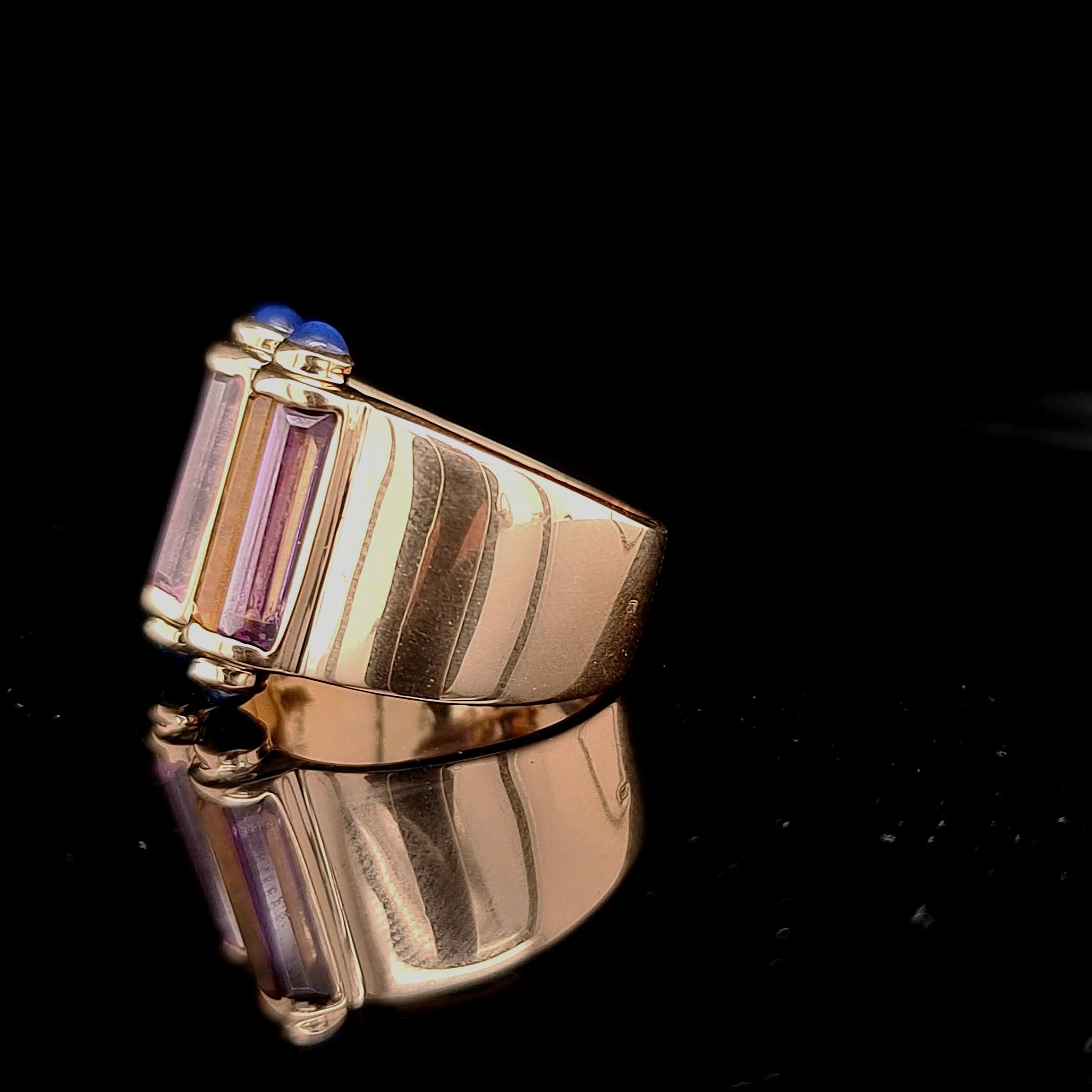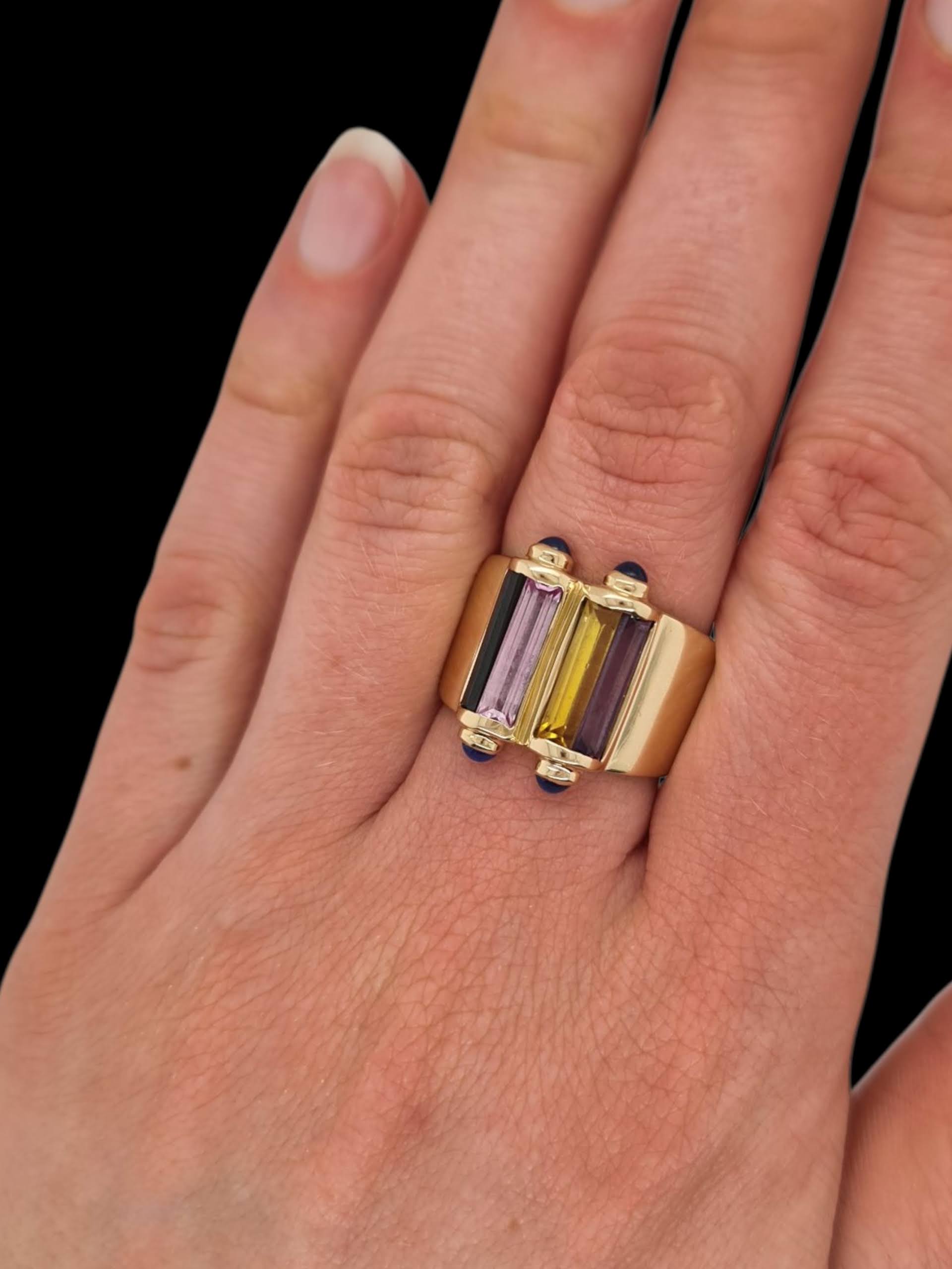 Wat een bijzondere ring! Deze artistieke ring van 14 karaat geelgoud is een lust voor het oog. Bezet met kleurrijke amethist, citrien en groene toermalijn, oogt hij telkens anders, afhankelijk van de hoek waarop je kijkt. De doorschijnende stenen doen denken aan glas-in-lood, terwijl de blauwe cabochon geslepen saffieren een unieke, betoverende touch toevoegen. De brede band vangt het licht prachtig en trekt alle aandacht.