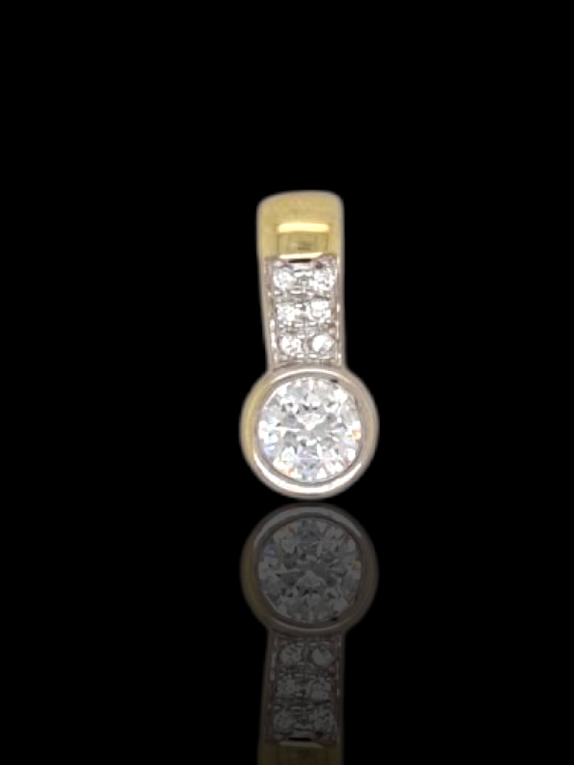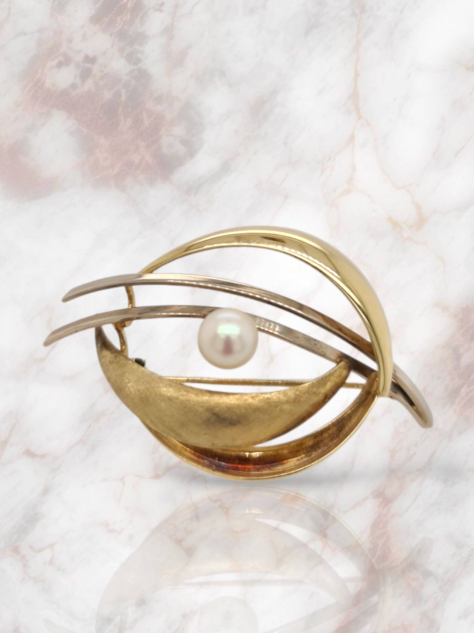 Unieke broche van 14 karaats geel- en witgoud. De combinatie van goudkleuren, met afwisselend geborstelde en gepolijste oppervlakken, maakt dit tot een fascinerend sieraad om te zien. In het midden lijkt de parel elegant te zweven tussen de sierlijke witgouden lijnen.