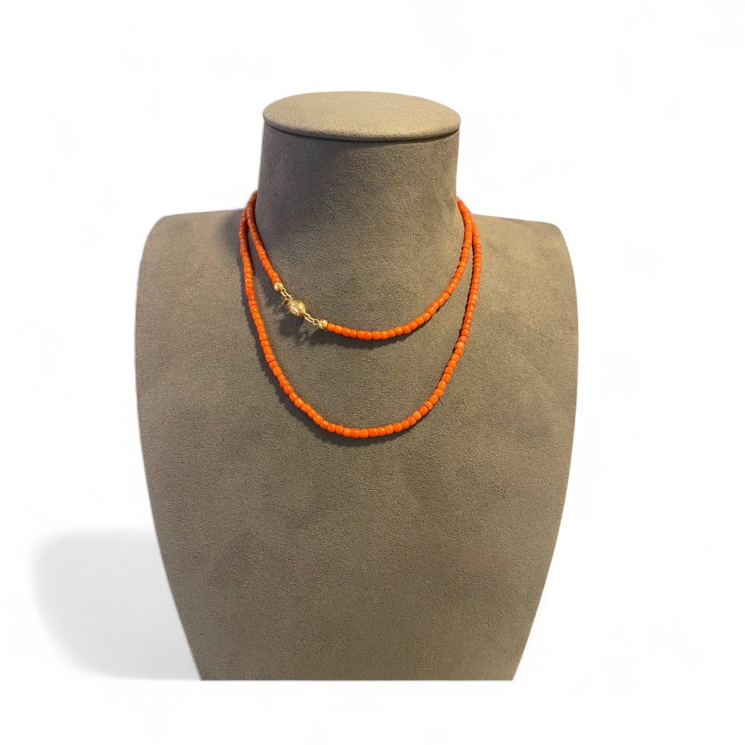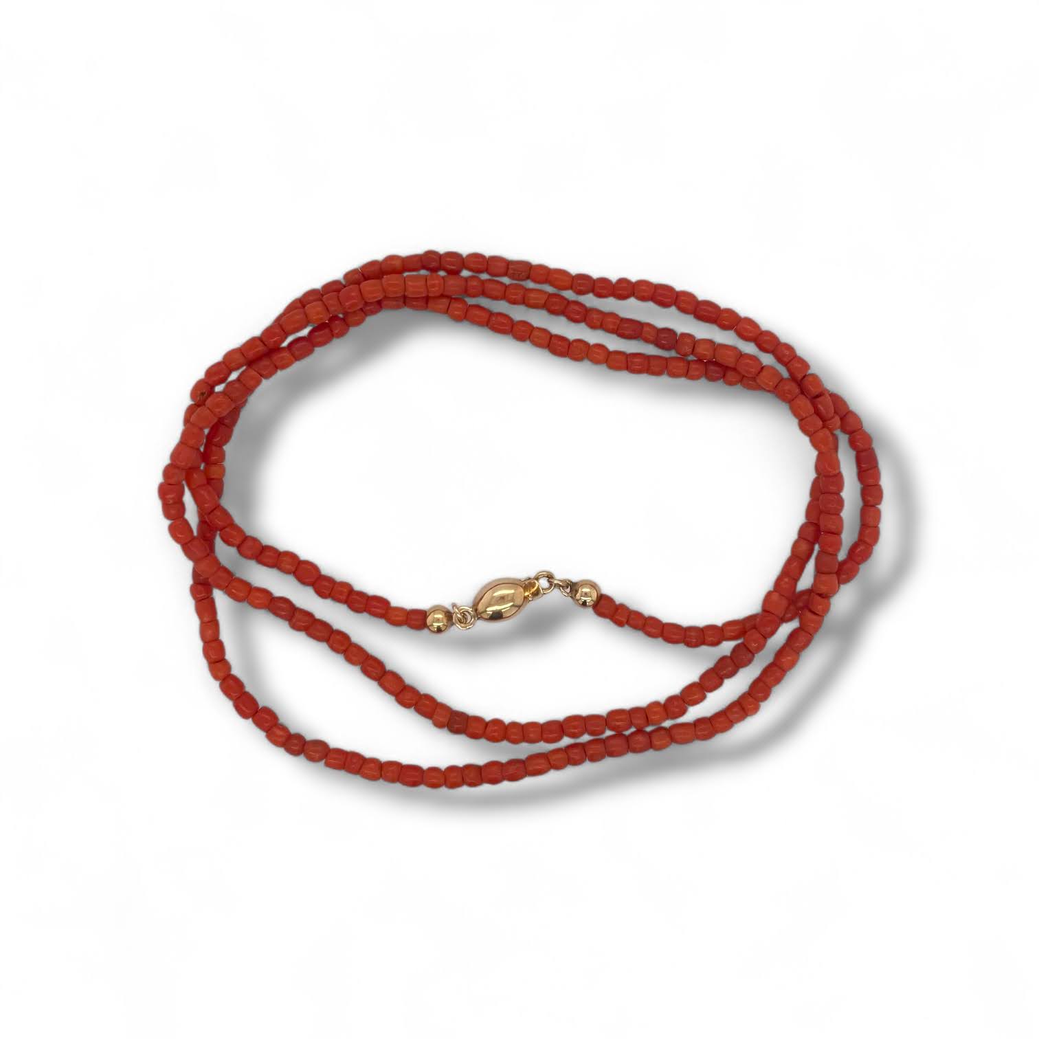Dit lange collier van bloedkoraal is opgebouwd uit fijne kralen en afgewerkt met een fraai slot van massief 14 karaat geelgoud.