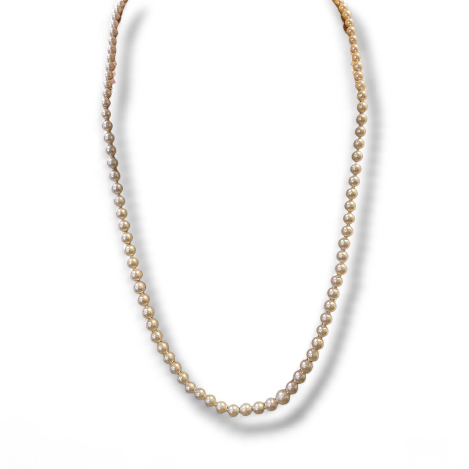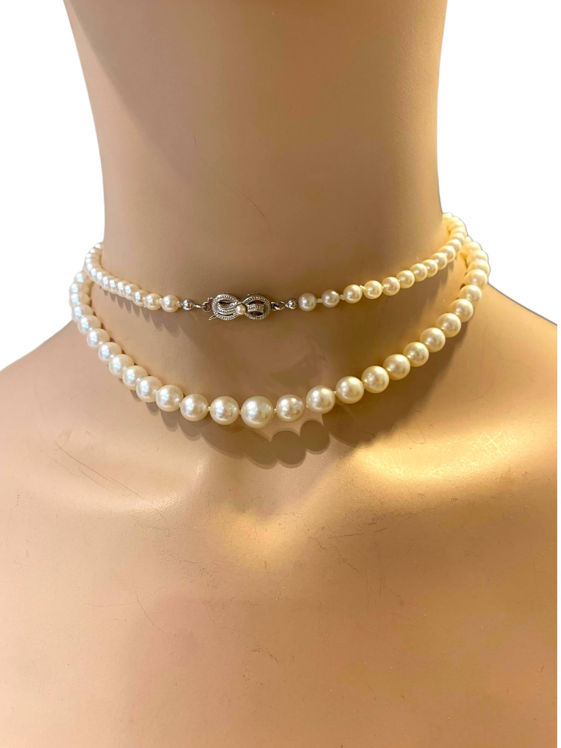 Deze fraaie zoutwaterparelketting is voorzien van een witgouden sierslot, geelgoud aan de onderzijde, in de vorm van een glanzende strik, bezet met een klein pareltje. De parels lopen geleidelijk op van dun naar dik. Een klassiek sieraad met luxe uitstraling en een vintage glans.