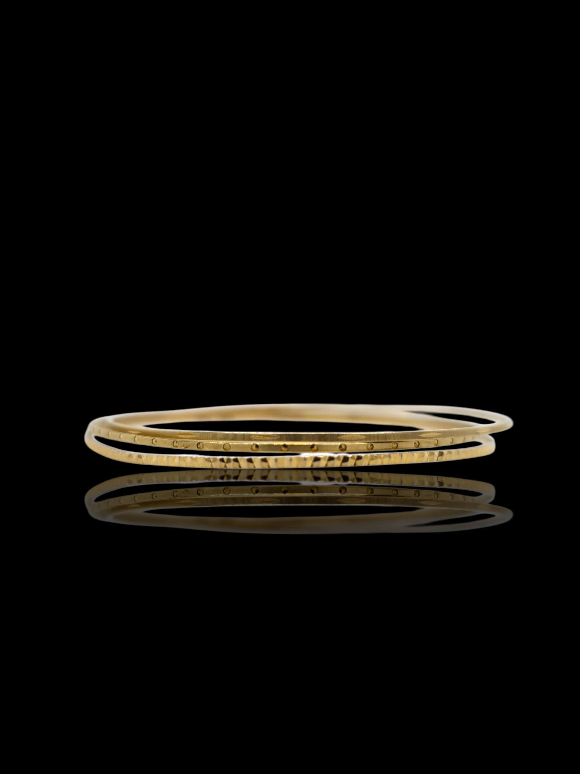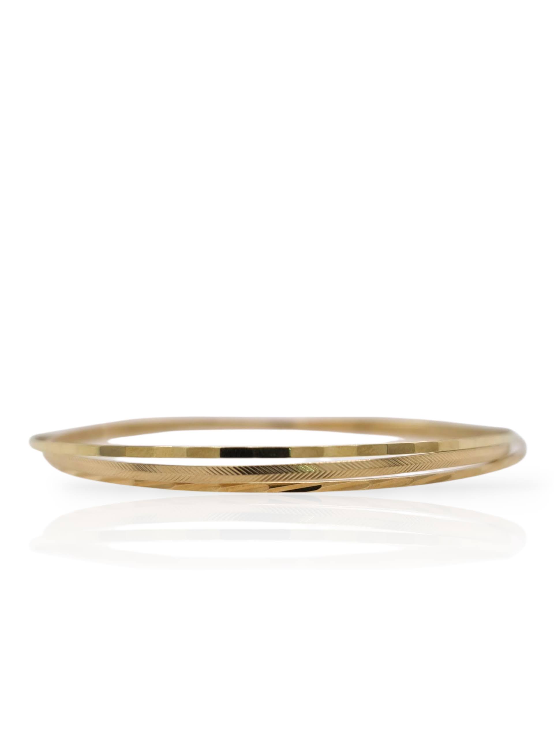 Drie fijne bangle armbanden van 14 karaats geelgoud. Elke band heeft een uniek reliëf dat het licht op een speelse manier vangt en weerkaatst – een waar genot om te zien schitteren aan je pols.