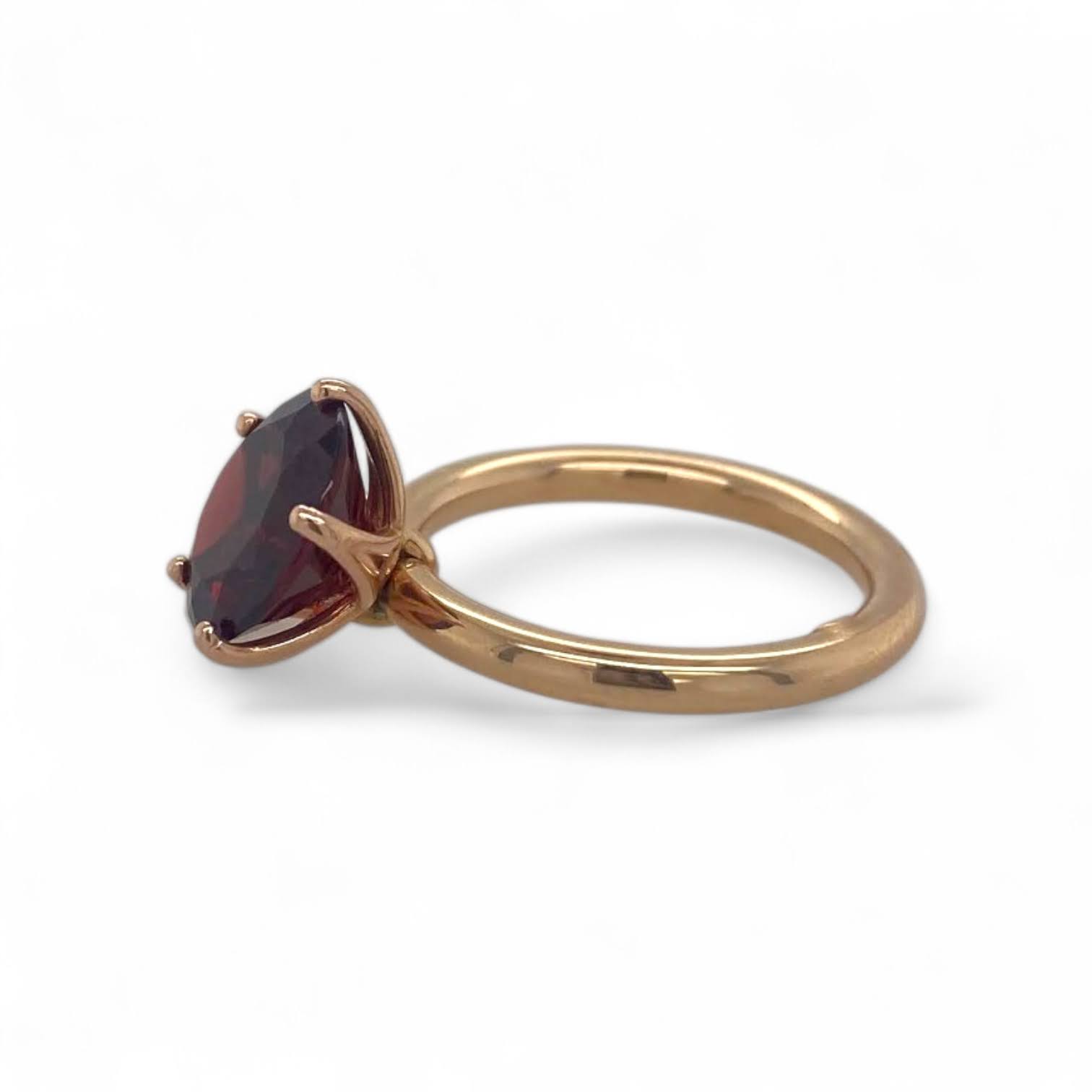 Deze prachtige en unieke tuimelring is bezet met een fraaie granaat in een penta-chatonzetting – een elegante zetting met vijf stilistische poten. Dankzij de subtiel bewegelijke zetting tuimelt hij speels heen en weer bij elke beweging, waardoor de steen extra lijkt te vonkelen.