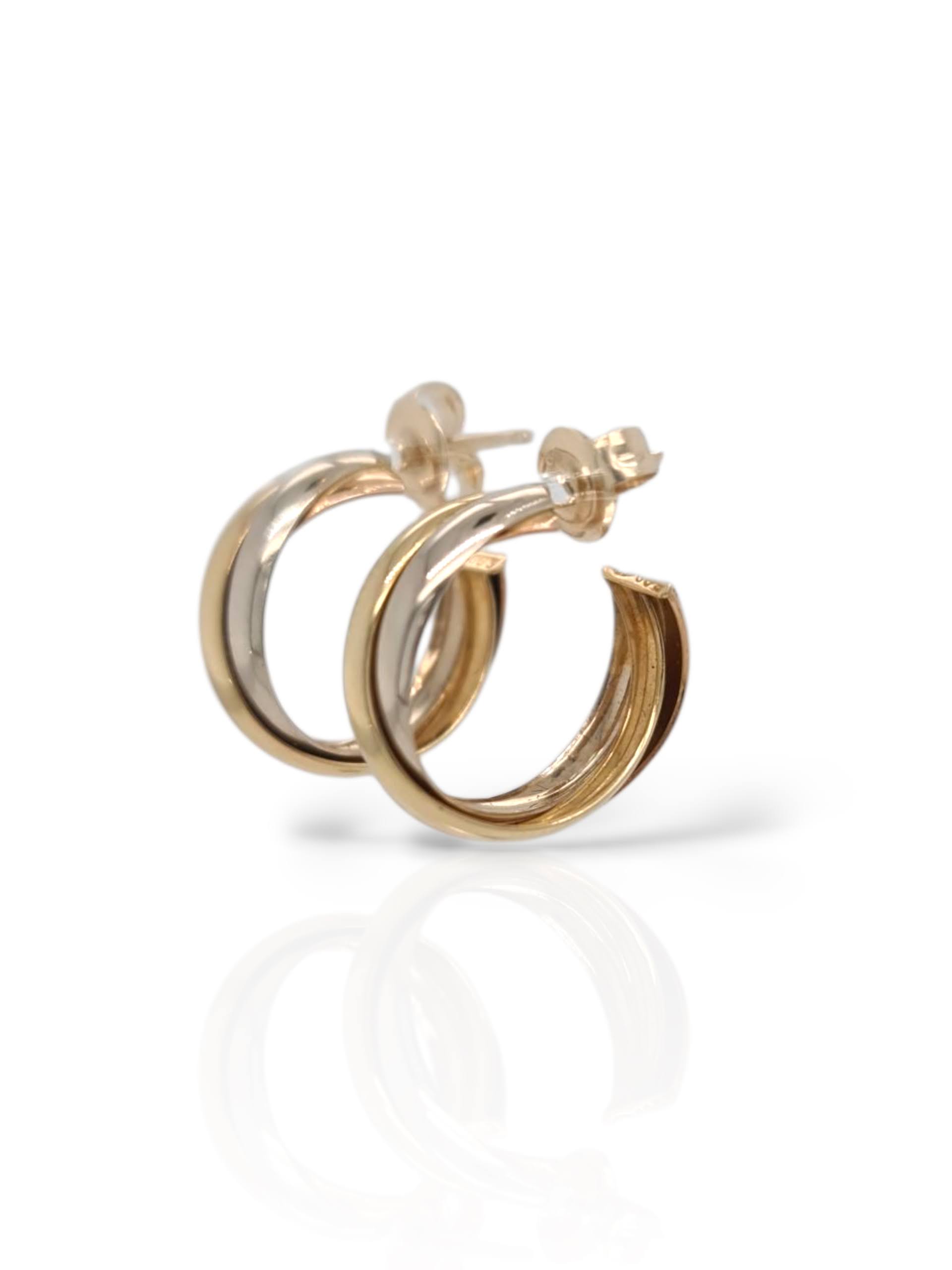 Elegante tricolore oorhangers, vervaardigd uit 14 karaats rosé-, wit- en geelgoud. Drie verfijnde ringen die sierlijk in elkaar overvloeien en schitterend langs het oor bewegen.