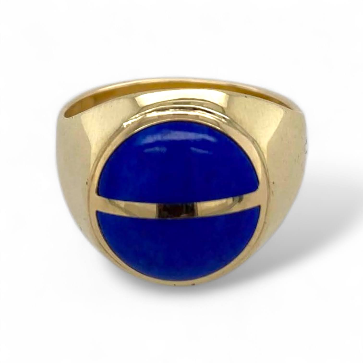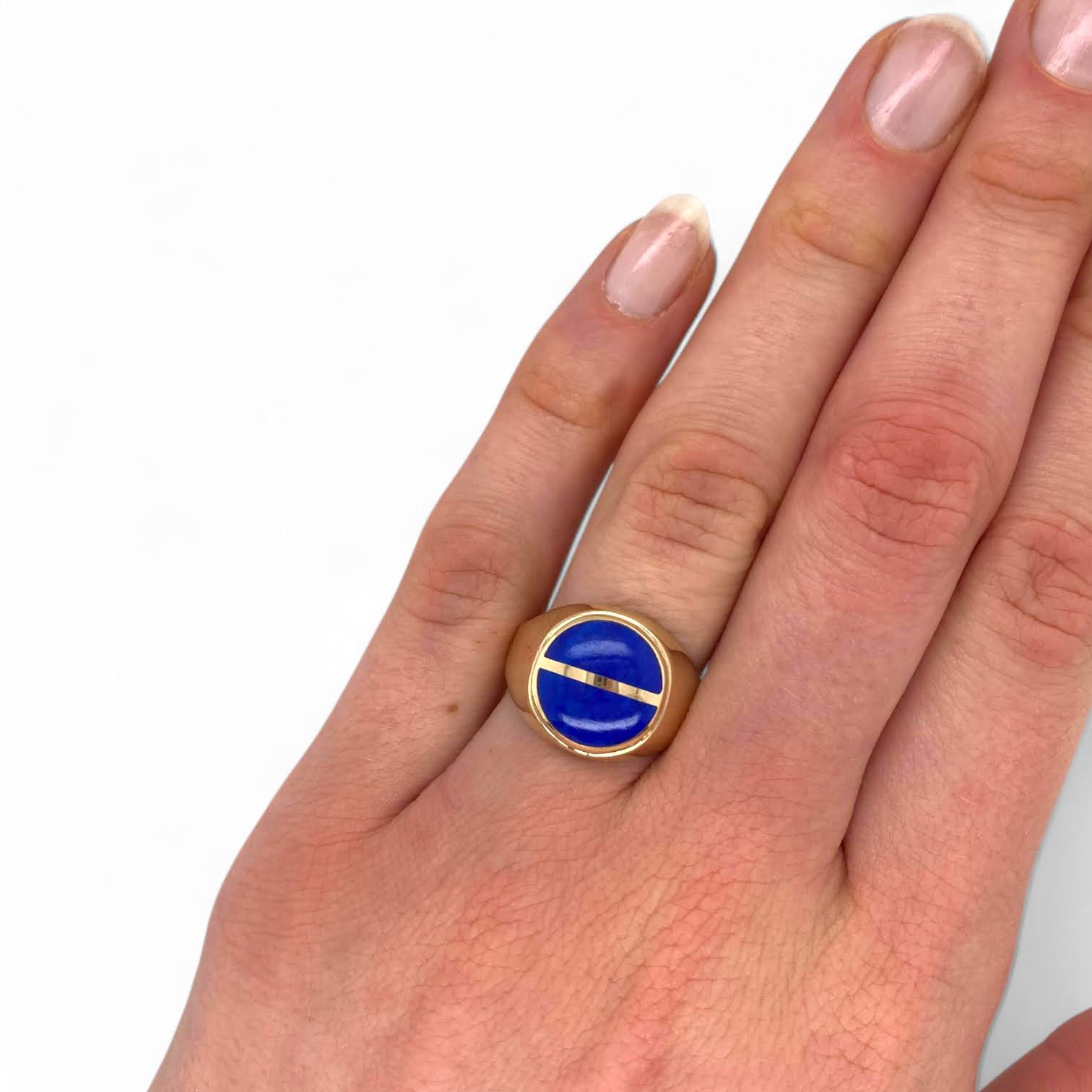 Deze massieve ring van 14 karaat geelgoud heeft een krachtig en bijzonder ontwerp dat doet denken aan een oog. Twee prachtig ingeslepen, half ronde en licht bolle lapis lazuli stenen vormen samen een indrukwekkend middelpunt, als een koninklijke zegel op deze statige ring.