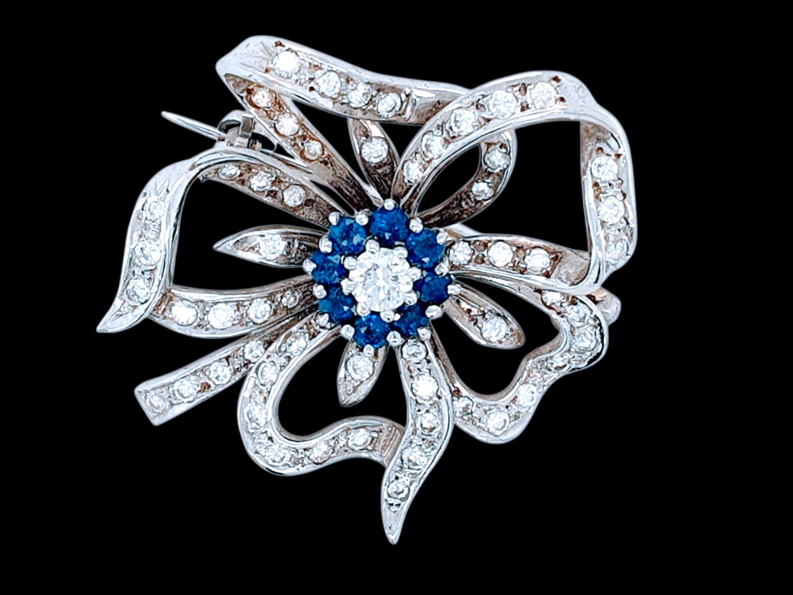 Prachte witgouden broche bezet met briljanten en saffieren. 14 karaat vintage. Een mooie sierlijke ruimtelijk handgemaakte broche met veiligheidssluiting. Bestelnummer 28969