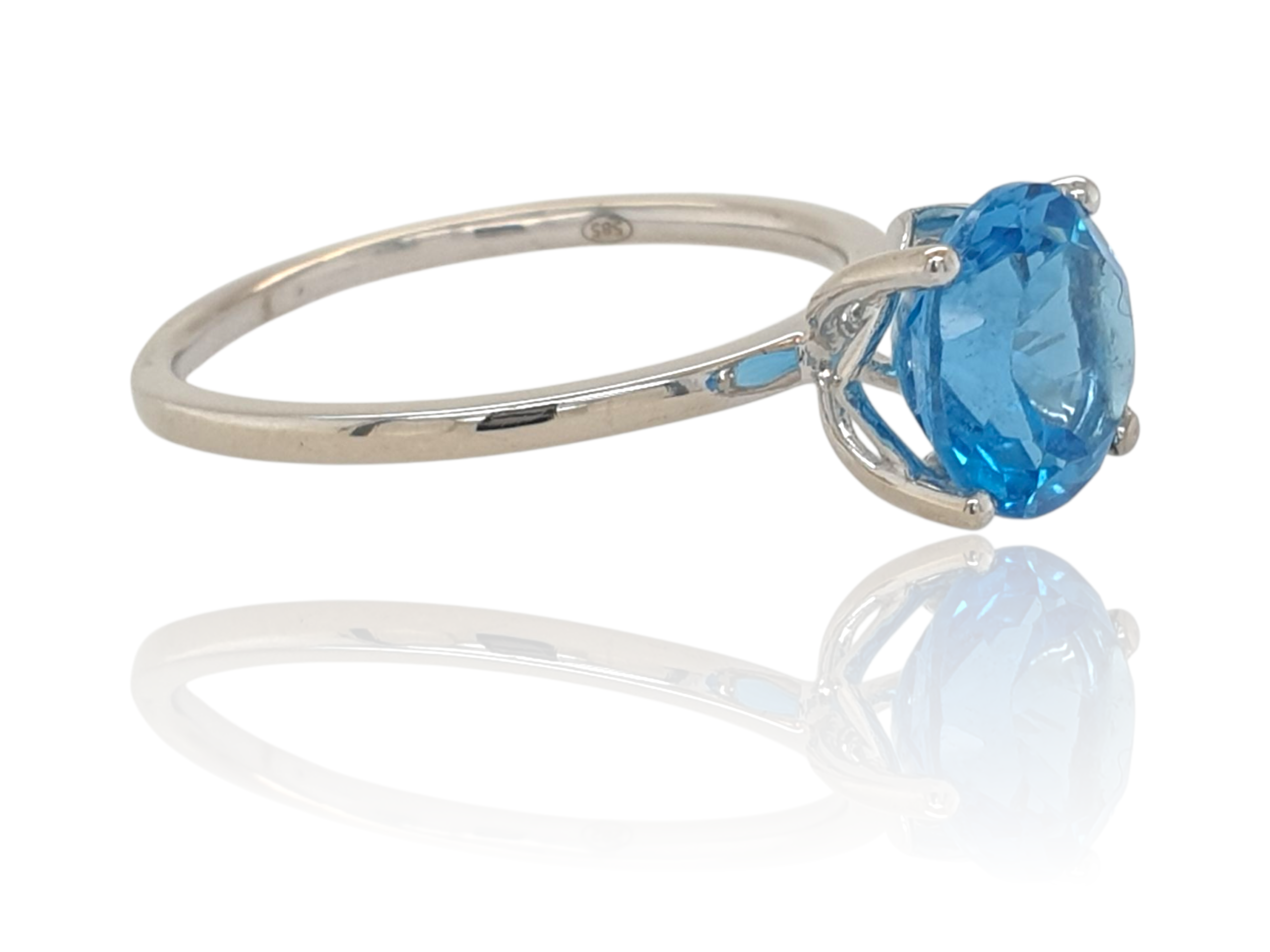 Mooie strakke witgouden ring met in een sierlijke hoge zetting, een prachtige hardblauwe Topaas, briljant geslepen van 9 mm. Een Suisse blue Topaas. Ringmaat 19.5. Ring kan op maat gemaakt worden. Het is een 14 karaat gouden vintage occasion ring. Bestelnummer 28968.