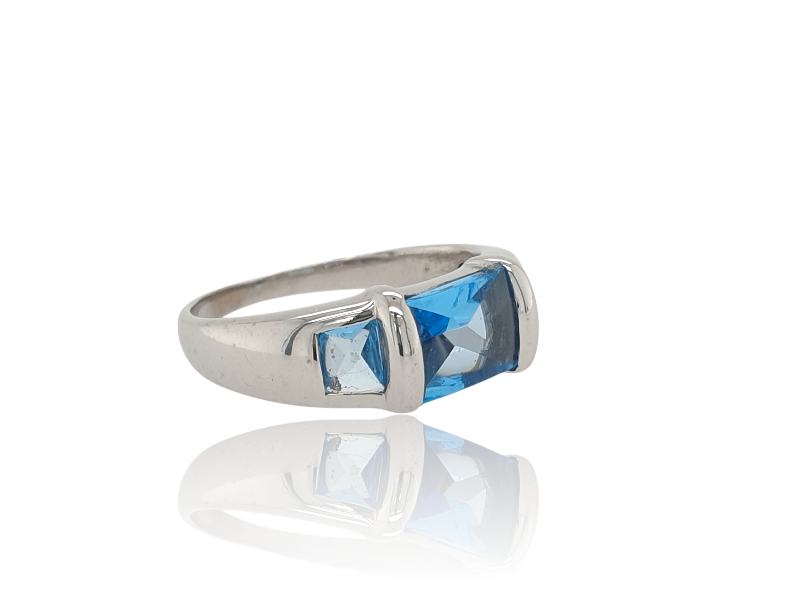 Zeer fraaie witgouden ring met 3 ingeslepen, buff-top geslepen Topazen. 7,5 mm breed, maat 17,5. De ring lijkt wel nieuw. Het is een tweede hands occasion. Bestelnummer 28967.