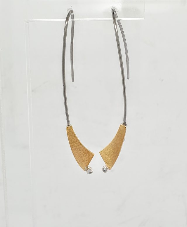 Ontzettend leuke oorhangers van Manu. Zilver met goud. 53 mm lang met onderaan een piepklein briljantje. Bestelnummer 25726.