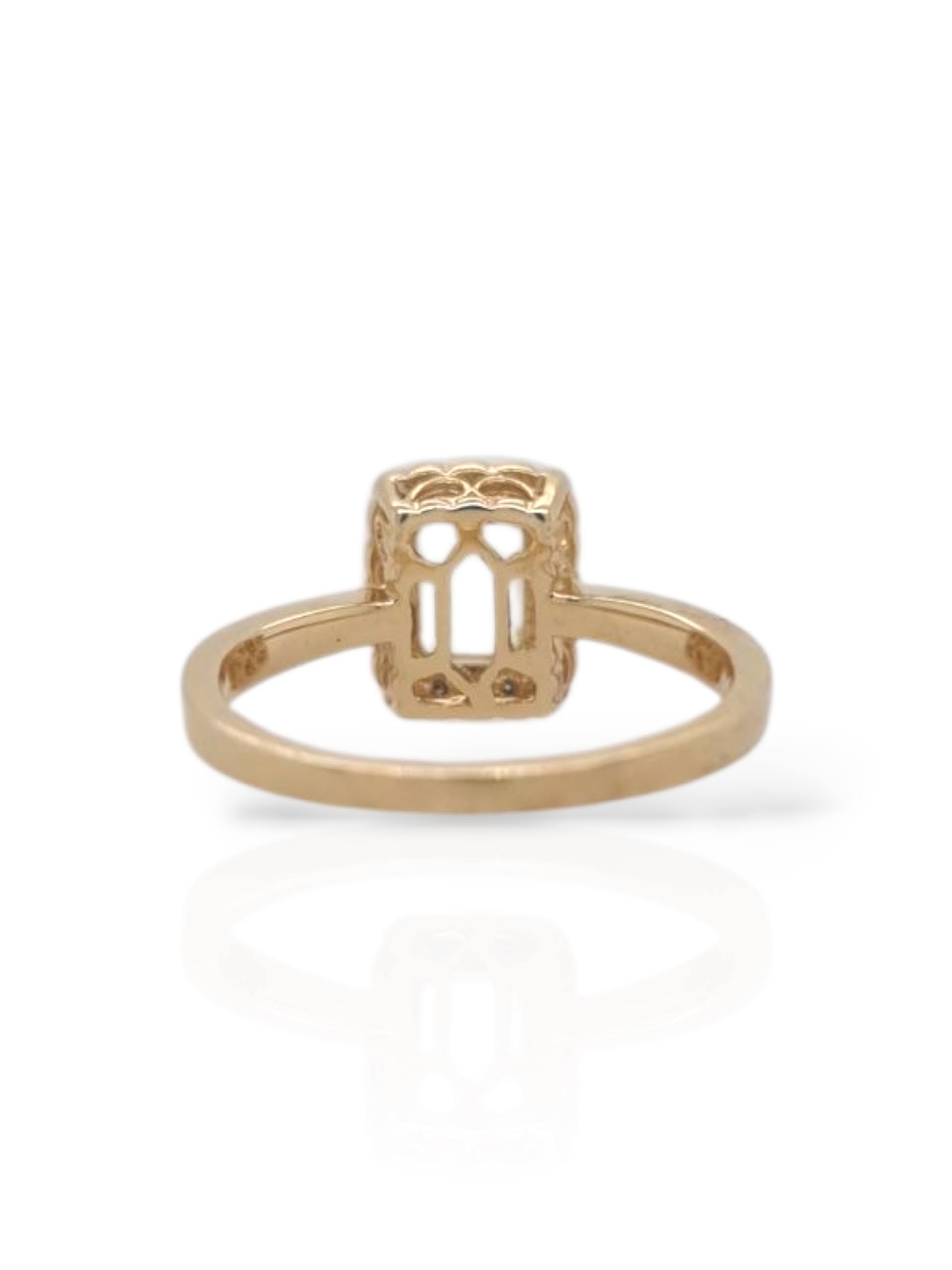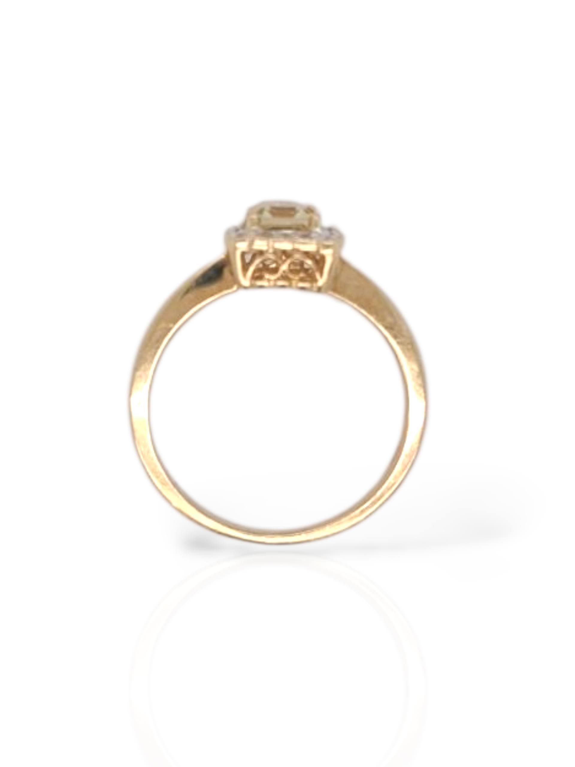 14 karaats geelgouden entourage ring met citrien en diamantjes. Een prachtige vintage ring vervaardigd uit 14 karaats geelgoud, gezet met een schitterende onverhitte citrien in een vierkante entourage van fonkelende diamantjes rondom (totaal 0,10 karaat, kleur D–I, kwaliteit SI–W). De warme, lichte gele gloed van de citrien doet denken aan de eerste zonnestralen van de lente.