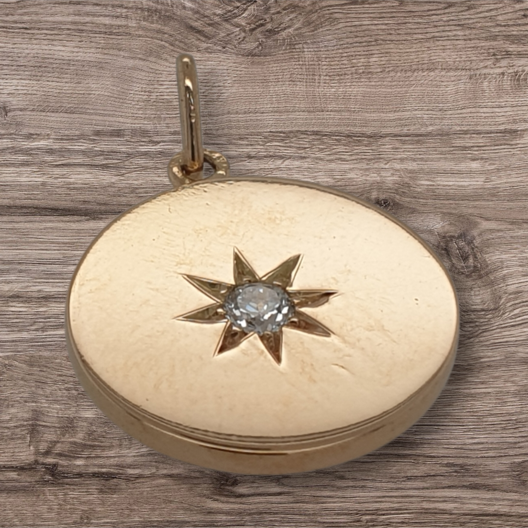 Een schitterende gouden ronde hanger met een prachtige in een sterzetting gezette diamant van 0.11 ct. W.VS. 18.5 mm doorsnede en 1.7 mm dik. Het is een occasion, tweede hands, vintage hanger. Bestelnummer 29035.